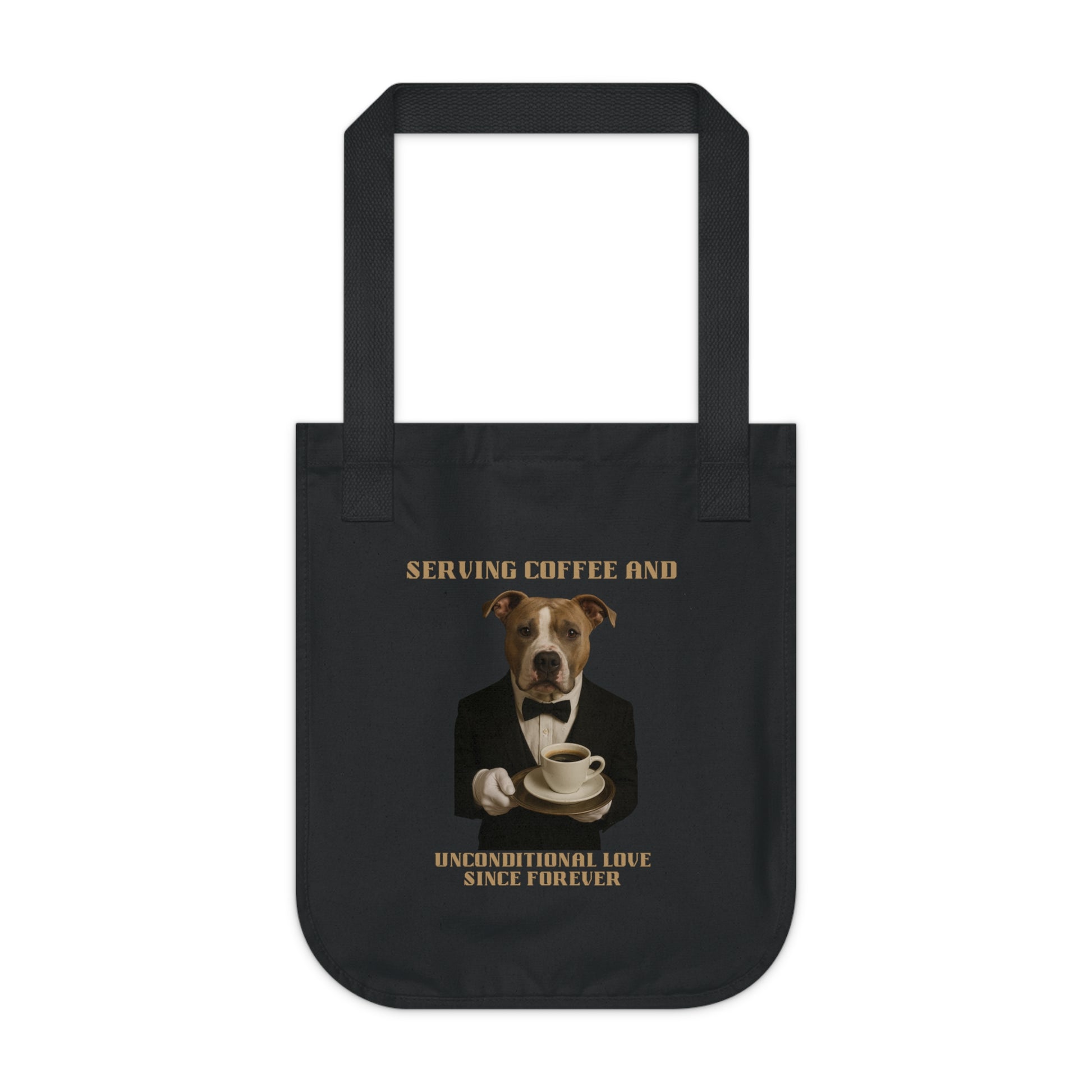 This humorous image features a dog, specifically a pit bull or similar breed, dressed in a formal white tuxedo with a bow tie, serving coffee. The canine appears to be a professional waiter, holding a coffee cup and saucer with a serious, stoic expression. The graphic design mimics a vintage poster or advertisement style, with bold, capitalized text reading "SERVING COFFEE AND" at the top and "UNCONDITIONAL LOVE SINCE FOREVER" at the bottom. The dog's anthropomorphic portrayal creates a comedic contrast between the formal attire and the animal's natural appearance. The image playfully suggests the loyal and dedicated nature of dogs through the metaphor of a coffee server.Fantasy Dog Portraits