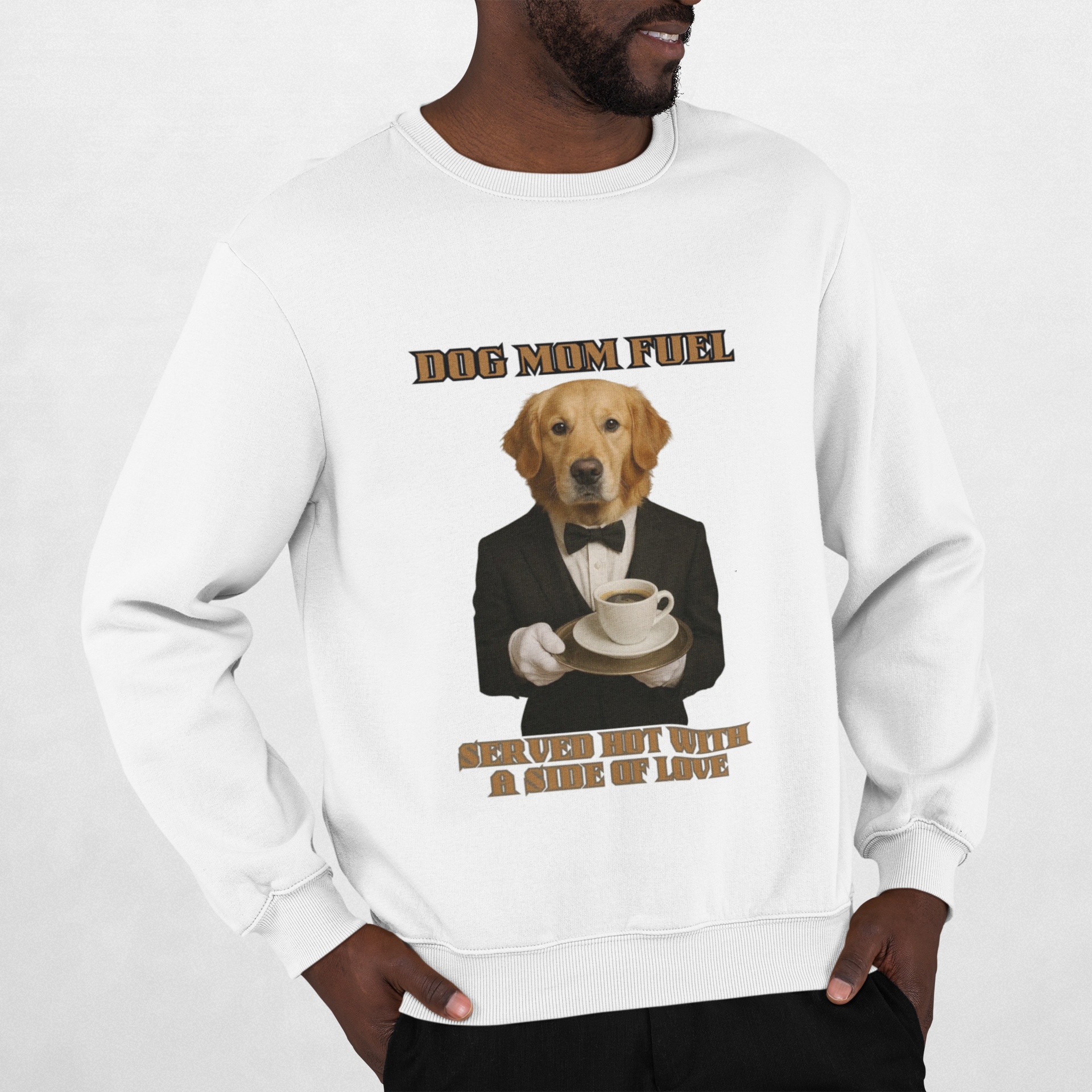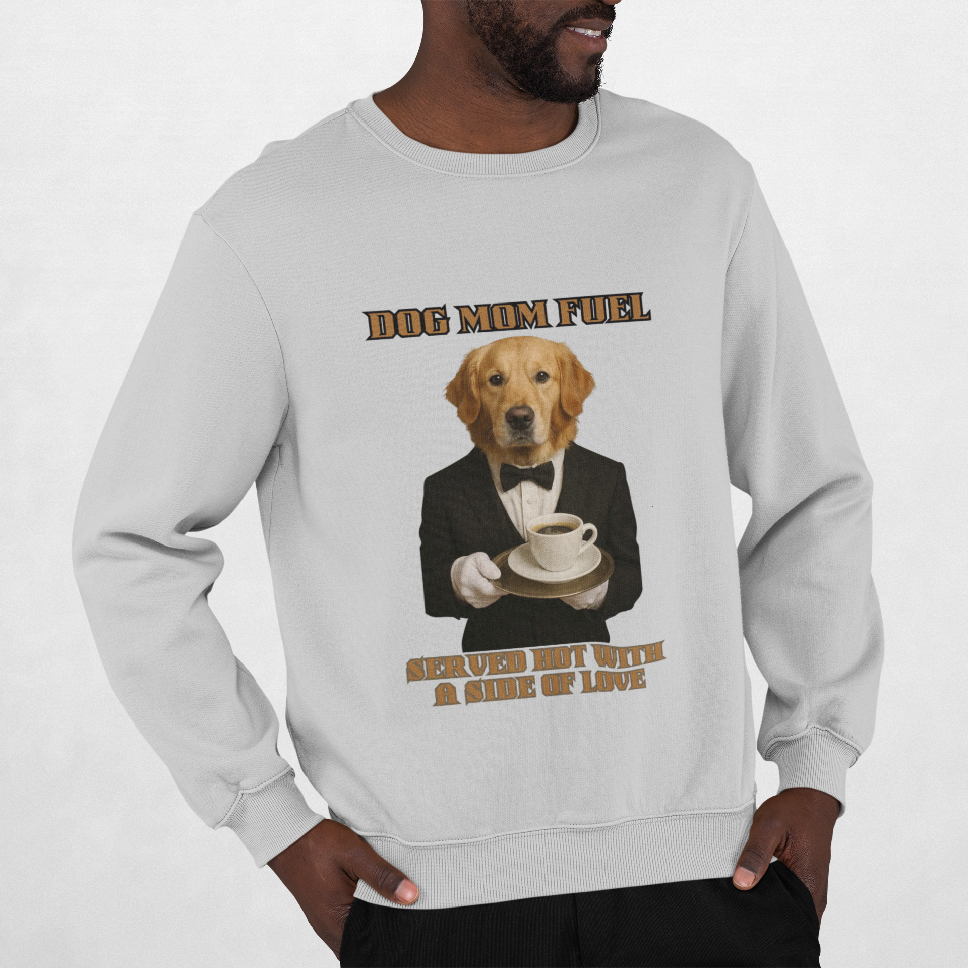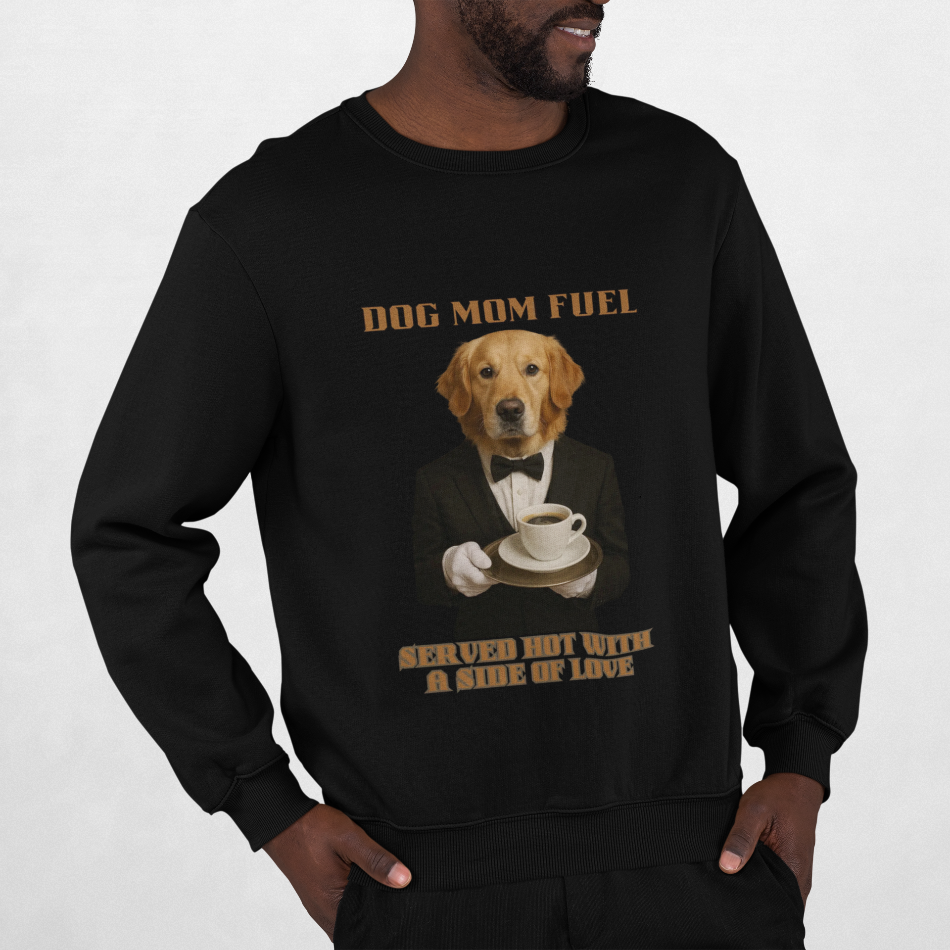 This humorous and stylized image features a Golden Retriever dressed in a sophisticated black tuxedo with a bow tie, portraying an elegant server. The dog is holding a white coffee cup and saucer, standing against a plain background with the text "DOG MOM FUEL" at the top and "SERVED HOT WITH A SIDE OF LOVE" at the bottom. The canine is posed formally, with a dignified expression, wearing white gloves and presenting the coffee cup as if in a high-end restaurant or café. The image has a professional, staged look with high-quality photographic techniques, creating a playful anthropomorphic scene. The color palette is primarily warm golden tones from the dog's fur, contrasting with the black tuxedo and white coffee service.Fantasy Dog Portraits