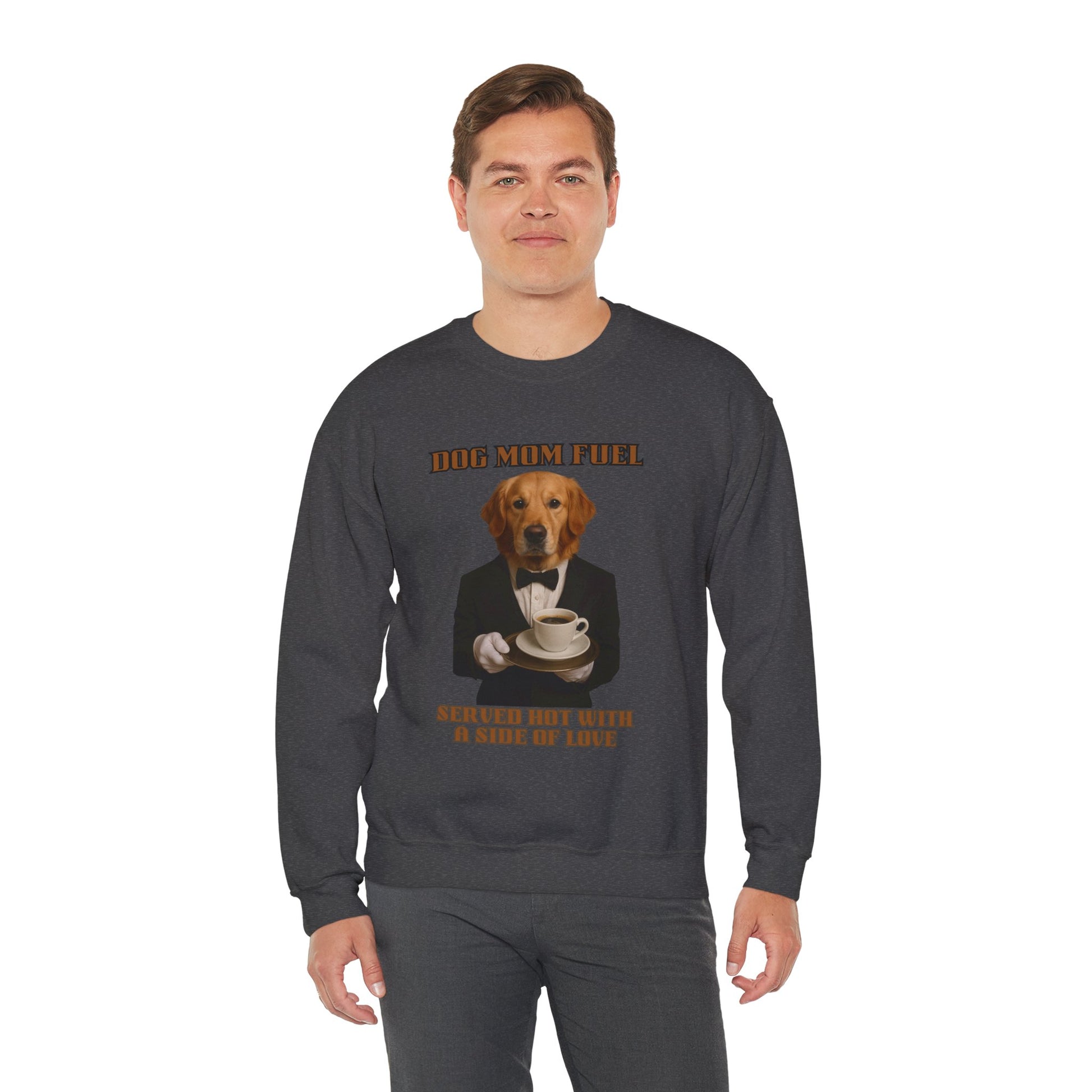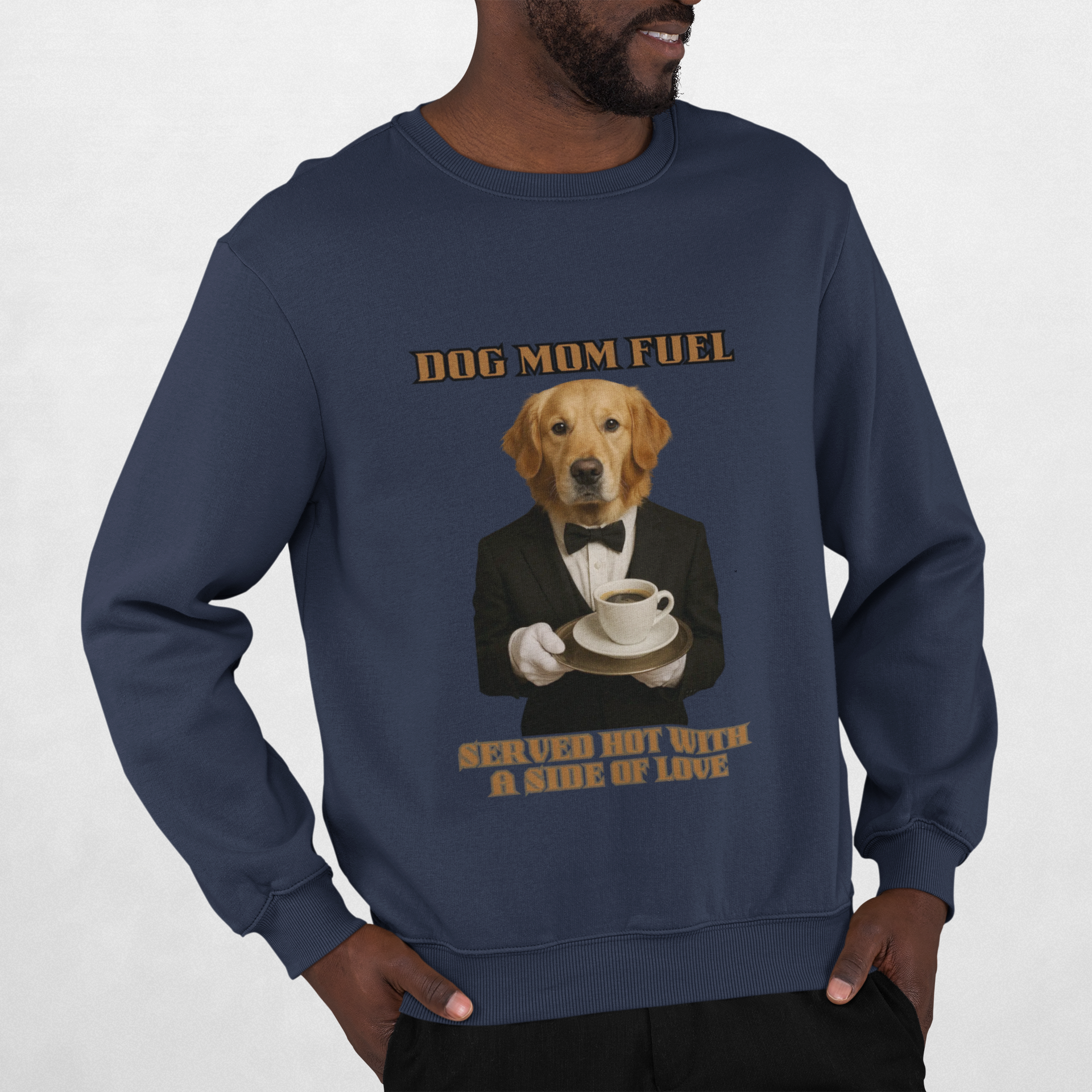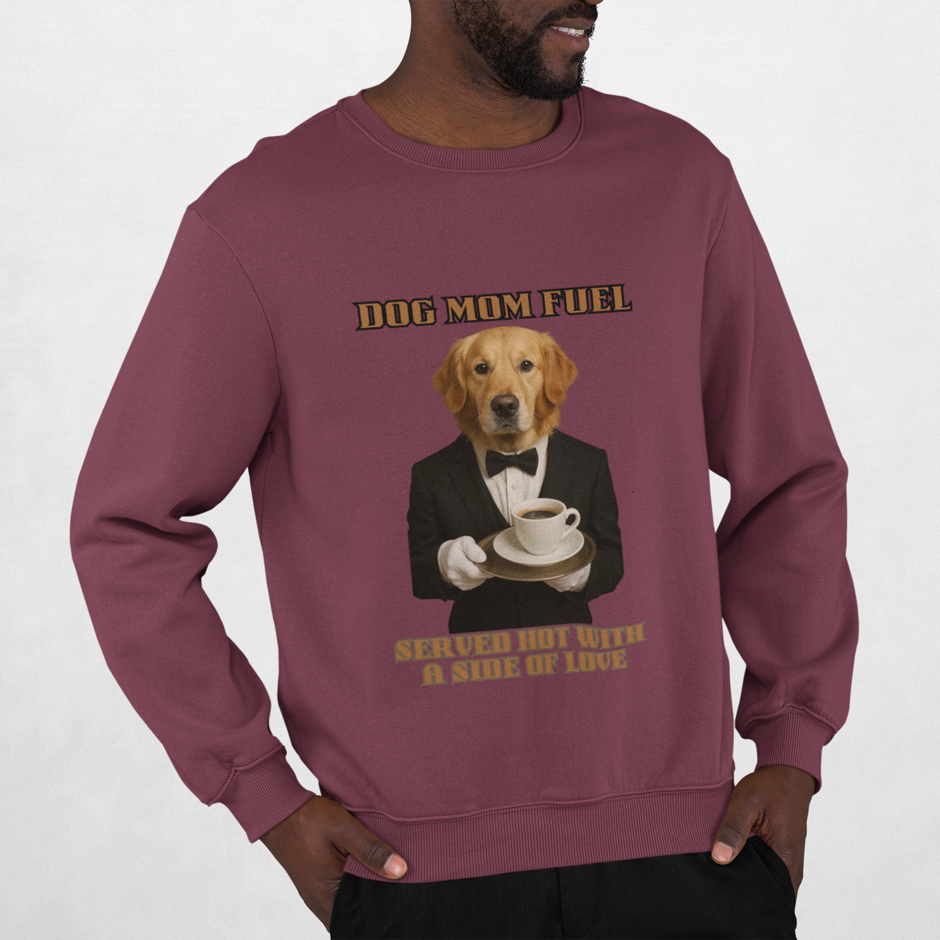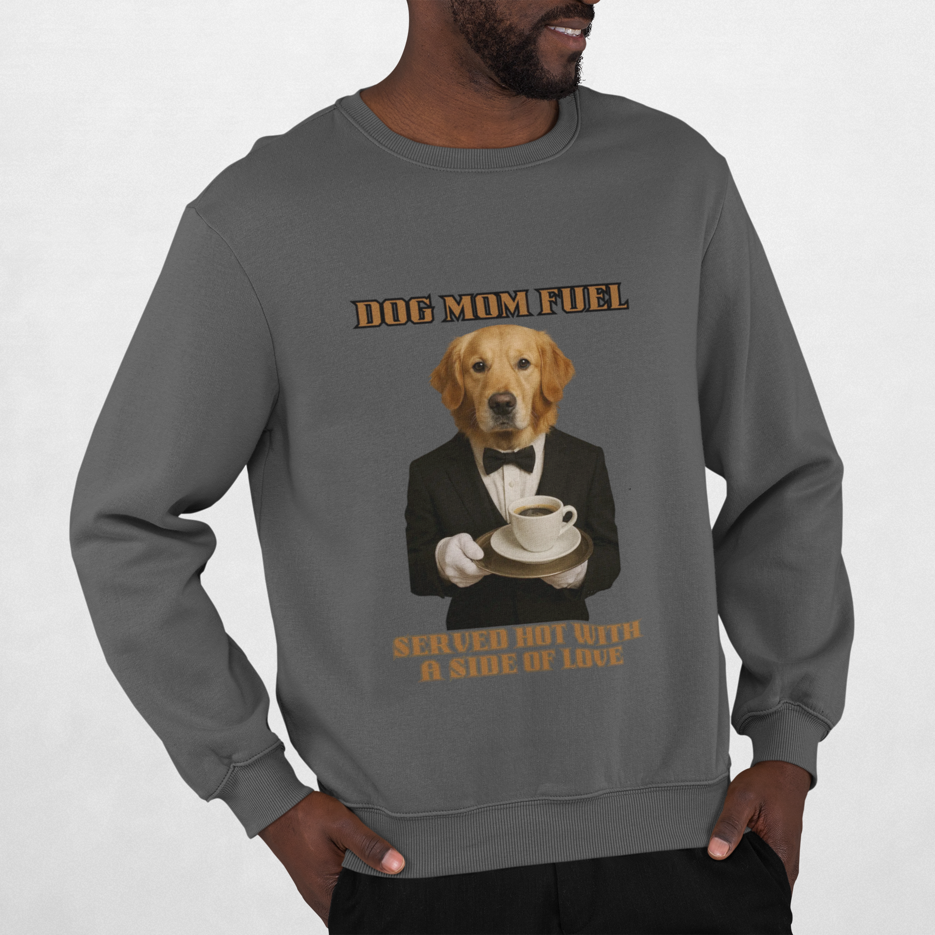 This humorous and stylized image features a Golden Retriever dressed in a sophisticated black tuxedo with a bow tie, portraying an elegant server. The dog is holding a white coffee cup and saucer, standing against a plain background with the text "DOG MOM FUEL" at the top and "SERVED HOT WITH A SIDE OF LOVE" at the bottom. The canine is posed formally, with a dignified expression, wearing white gloves and presenting the coffee cup as if in a high-end restaurant or café. The image has a professional, staged look with high-quality photographic techniques, creating a playful anthropomorphic scene. The color palette is primarily warm golden tones from the dog's fur, contrasting with the black tuxedo and white coffee service.Fantasy Dog Portraits