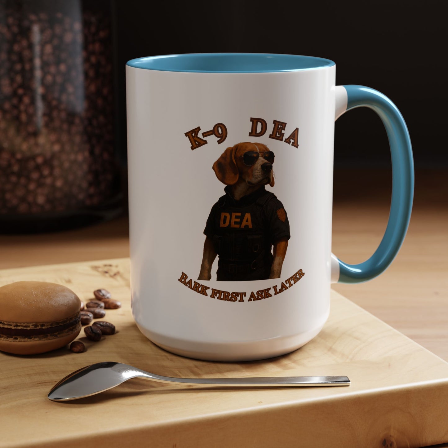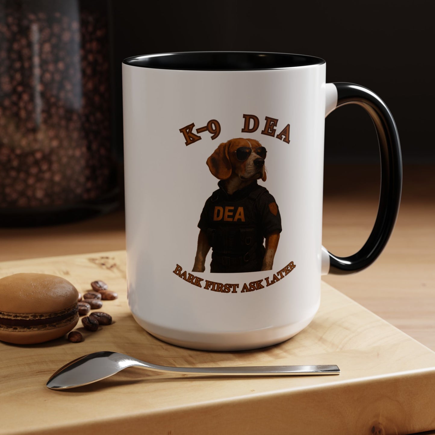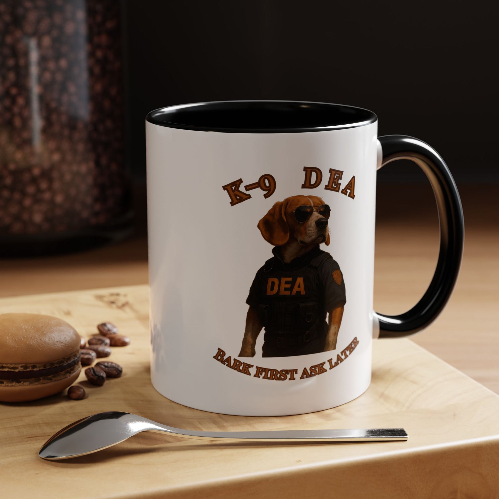Introducing the ultimate K-9 DEA agent, a heroic Beagle ready to take down crime with style and swagger! This canine law enforcement professional sports a sleek black tactical vest emblazoned with the DEA logo, complemented by classic aviator sunglasses that scream cool and confident. The image captures the dog's serious demeanor against a dramatic black background, highlighting the "K-9 DEA" text and the witty motto "Bark First Ask Later" which playfully references the traditional police phrase. The photograph is a masterful blend of humor and professional portraiture, transforming an ordinary dog into an extraordinary law enforcement hero. Every detail, from the perfectly positioned sunglasses to the meticulously designed vest, creates a compelling visual narrative of a four-legged crime fighter. The warm golden-brown tones of the Beagle's coat contrast beautifully with the dark tactical outfit, creating a striking visual impact. This image not only celebrates the important work of K-9 units but also brings a touch of humor and admiration to the serious world of drug enforcement. The professional staging and high-quality photography elevate this from a simple pet portrait to a powerful statement about the capabilities of working dogs. With its clever play on words and impressive visual composition, this image is sure to capture the imagination of dog lovers and law enforcement enthusiasts alike. The K-9 DEA agent stands as a symbol of dedication, bravery, and the extraordinary bond between humans and their canine partners in fighting crime.