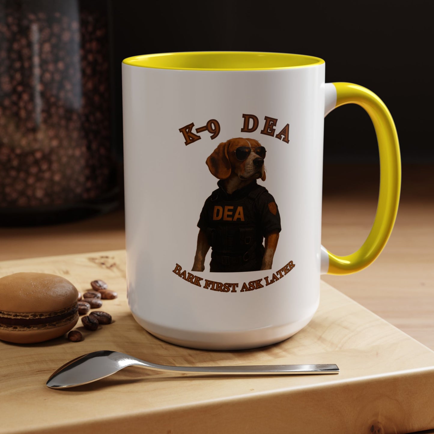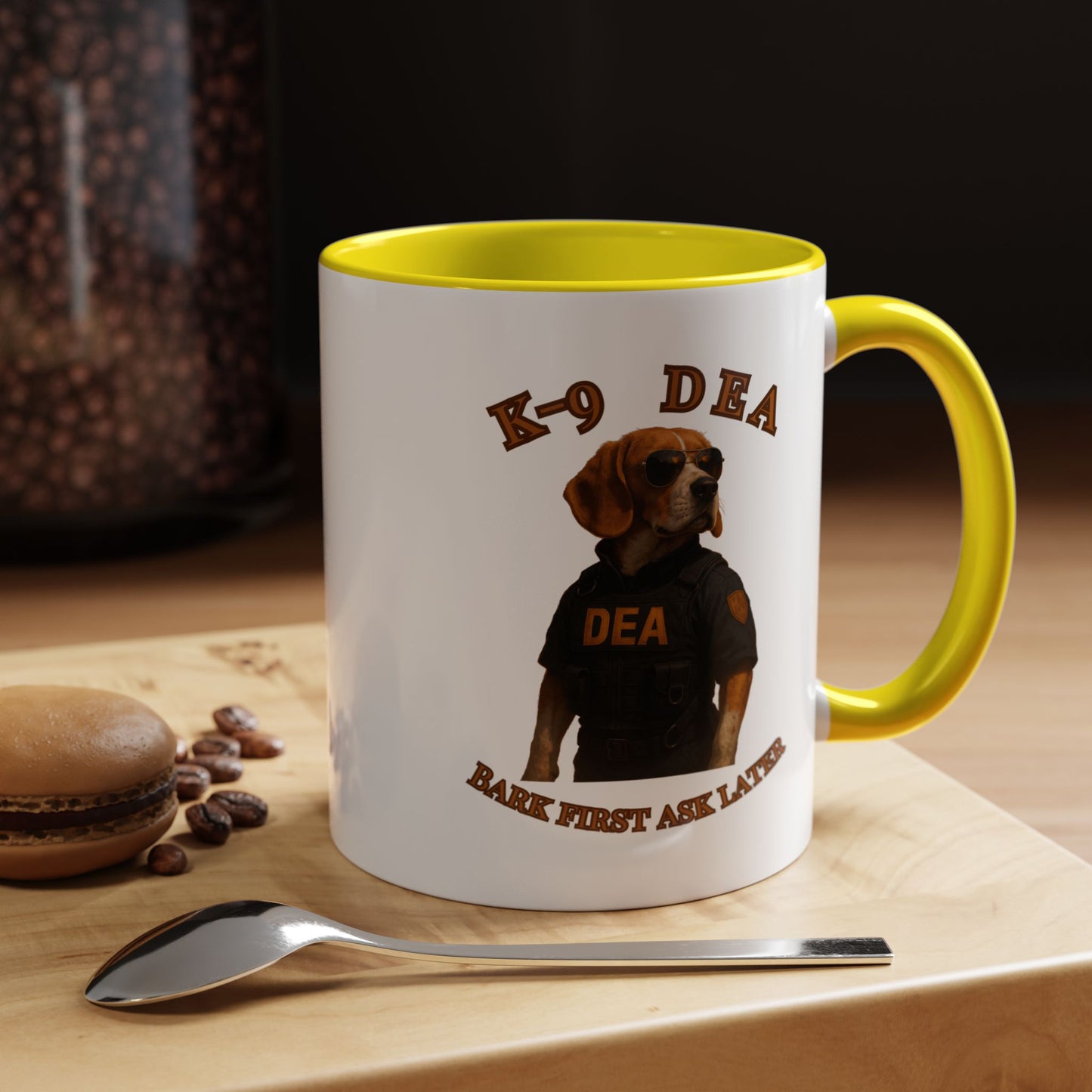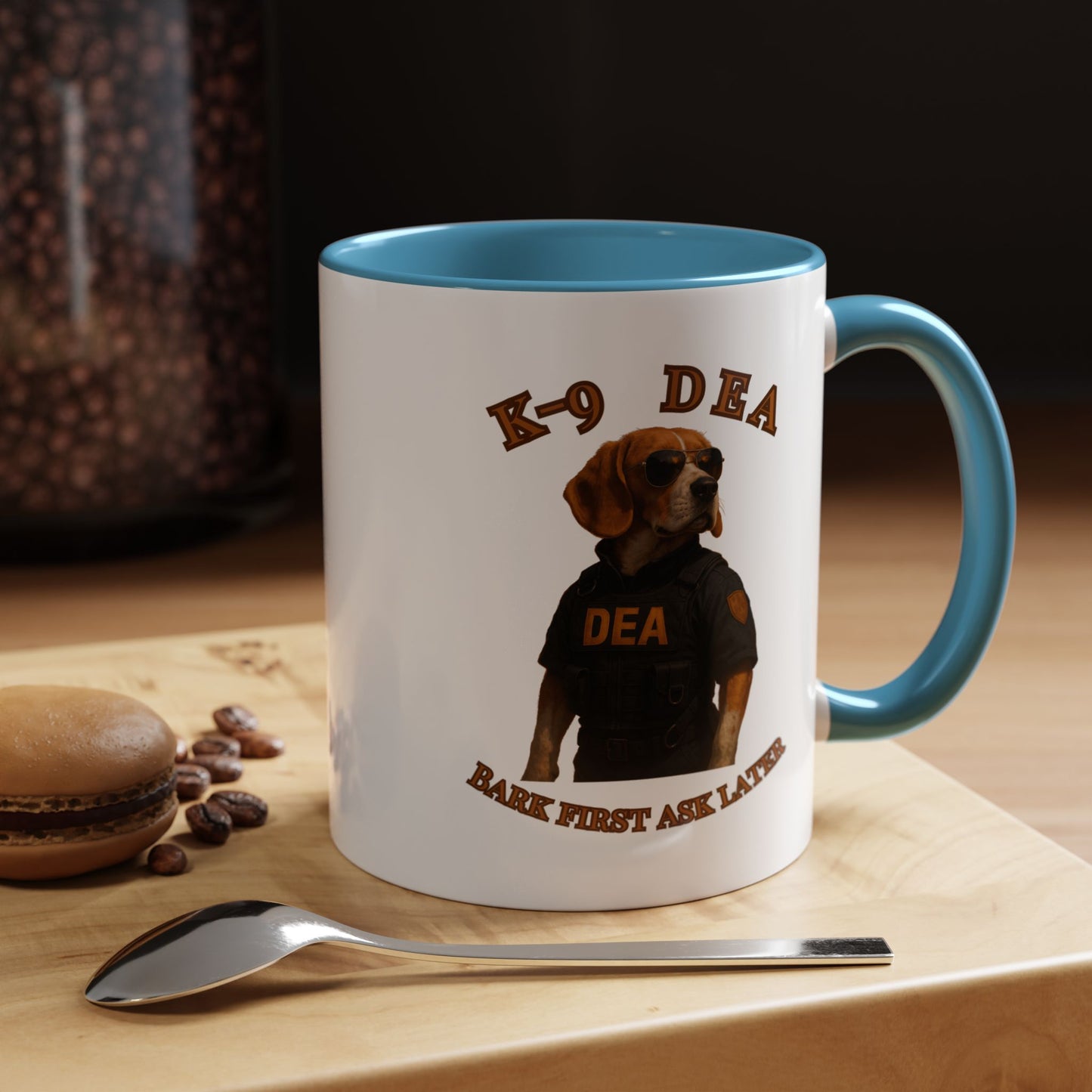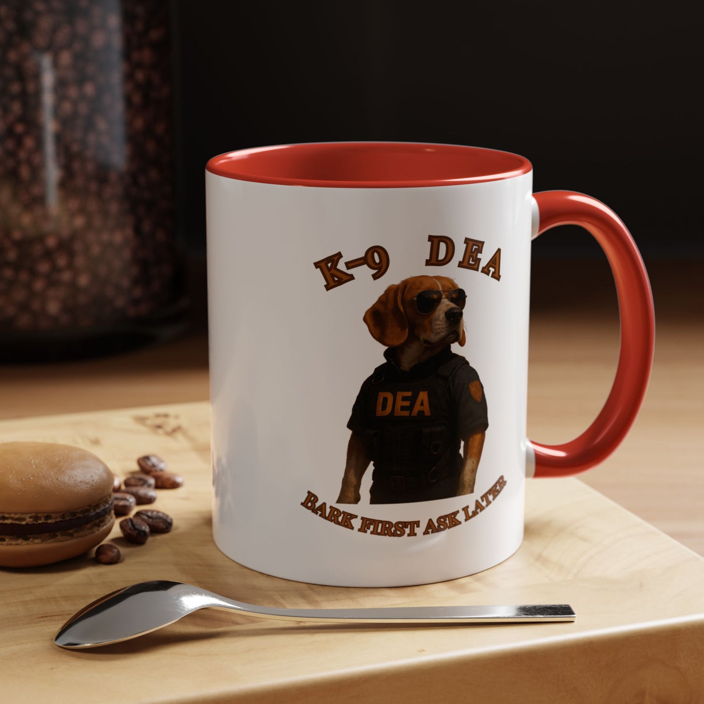 Introducing the ultimate K-9 DEA agent, a heroic Beagle ready to take down crime with style and swagger! This canine law enforcement professional sports a sleek black tactical vest emblazoned with the DEA logo, complemented by classic aviator sunglasses that scream cool and confident. The image captures the dog's serious demeanor against a dramatic black background, highlighting the "K-9 DEA" text and the witty motto "Bark First Ask Later" which playfully references the traditional police phrase. The photograph is a masterful blend of humor and professional portraiture, transforming an ordinary dog into an extraordinary law enforcement hero. Every detail, from the perfectly positioned sunglasses to the meticulously designed vest, creates a compelling visual narrative of a four-legged crime fighter. The warm golden-brown tones of the Beagle's coat contrast beautifully with the dark tactical outfit, creating a striking visual impact. This image not only celebrates the important work of K-9 units but also brings a touch of humor and admiration to the serious world of drug enforcement. The professional staging and high-quality photography elevate this from a simple pet portrait to a powerful statement about the capabilities of working dogs. With its clever play on words and impressive visual composition, this image is sure to capture the imagination of dog lovers and law enforcement enthusiasts alike. The K-9 DEA agent stands as a symbol of dedication, bravery, and the extraordinary bond between humans and their canine partners in fighting crime.
