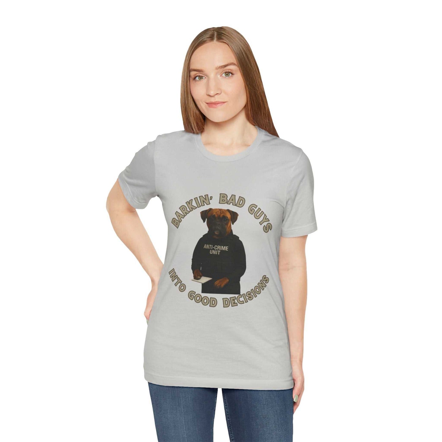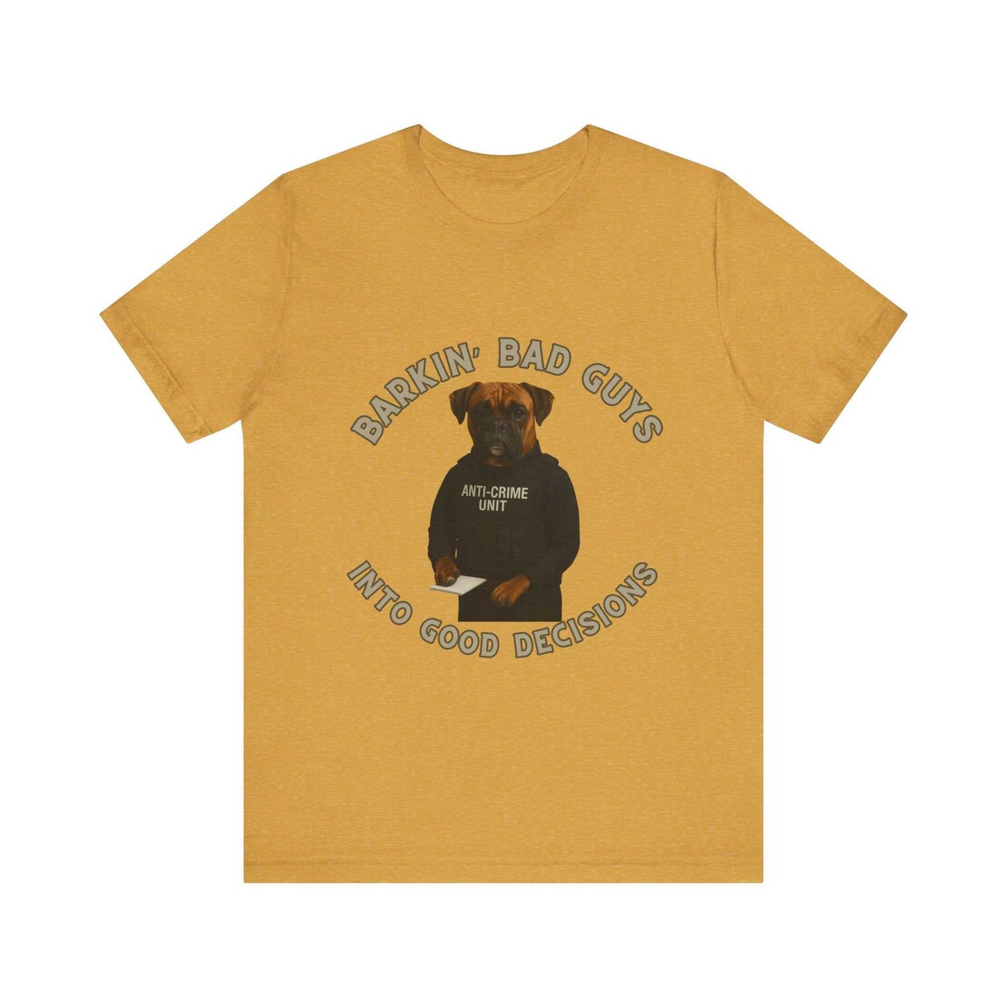Barkin' Bad Guys, Into Good Decisions" presents a humorous and creative photographic portrait of a Boxer dog dressed as a serious law enforcement officer in an "Anti-Crime Unit" vest. The image features the dog sitting at a desk with a notepad, wearing a black tactical-style uniform that mimics professional law enforcement attire. The canine's expressive face, with its wrinkled brow and stern gaze, adds comedic depth to the concept of a dog serving in crime prevention. Set against a black background, the image uses playful typography that curves around the dog, emphasizing the witty "Barkin' Bad Guys" theme. The dog's reddish-brown coat and muscular build contribute to the authoritative aesthetic of the anti-crime professional persona. Clever lighting and high-quality photography highlight the dog's detailed features and the crisp text of the uniform. The composition blends humor with a surprisingly professional presentation, making the image both entertaining and visually engaging. This creative portrait reimagines a typical law enforcement photo by replacing a human officer with a charismatic canine representative. The image successfully plays with expectations, using anthropomorphic styling to create a memorable and amusing visual narrative. The overall design suggests a lighthearted approach to serious community service and crime prevention.Fantasy Dog Portraits