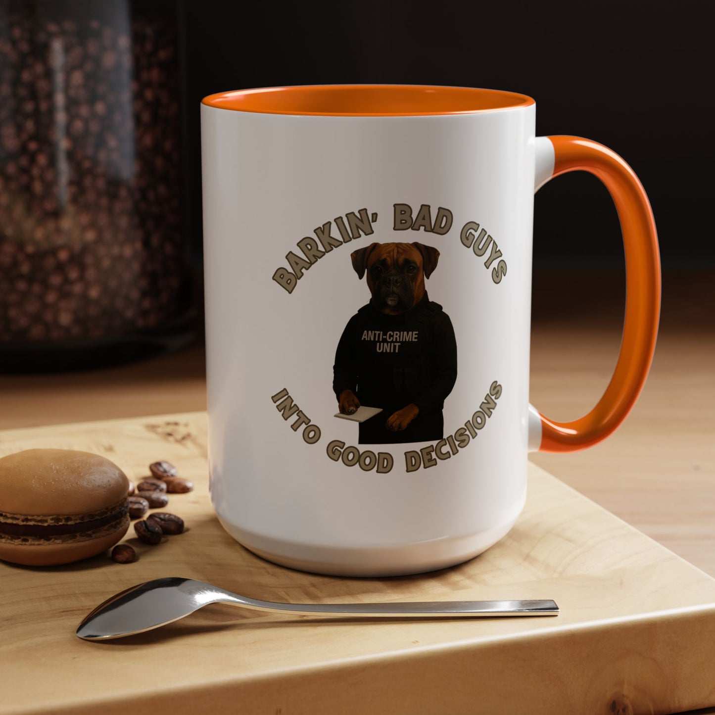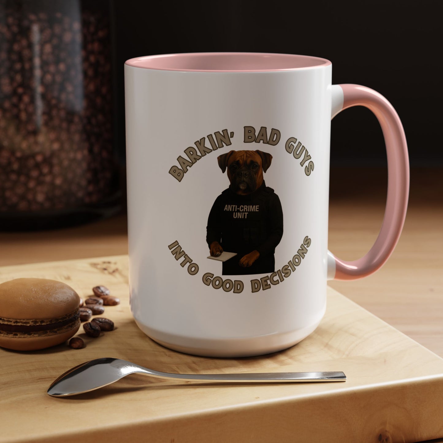 Introducing the hilarious "Barkin' Bad Guys" image featuring a stern-looking boxer dog dressed in an "Anti-Crime Unit" vest, ready to take a bite out of crime. This humorous photographic composition plays on classic law enforcement imagery by replacing a human officer with an adorably serious canine protagonist. The dog sits at a desk with a notepad, wearing a black tactical-style vest, creating a comical yet oddly professional scene. Set against a dark background, the image is framed with curved text reading "Barkin' Bad Guys" at the top and "Into Good Decisions" along the bottom, adding to the witty concept. The boxer's wrinkled face and intense gaze perfectly capture the no-nonsense attitude of a dedicated crime-fighting professional, making this image both amusing and endearing. The high-quality studio lighting and precise composition elevate this from a simple meme to a professional-grade comedic portrait. The clever wordplay and anthropomorphic representation of the dog as a law enforcement officer creates an instant smile and shareable moment. It's a perfect blend of cute animal photography and satirical workplace humor that appeals to dog lovers and comedy fans alike. The image effectively uses visual storytelling to transform an ordinary boxer dog into an extraordinary crime-fighting hero. This witty photographic concept demonstrates how humor can transform a simple pet portrait into a memorable, engaging piece of art.