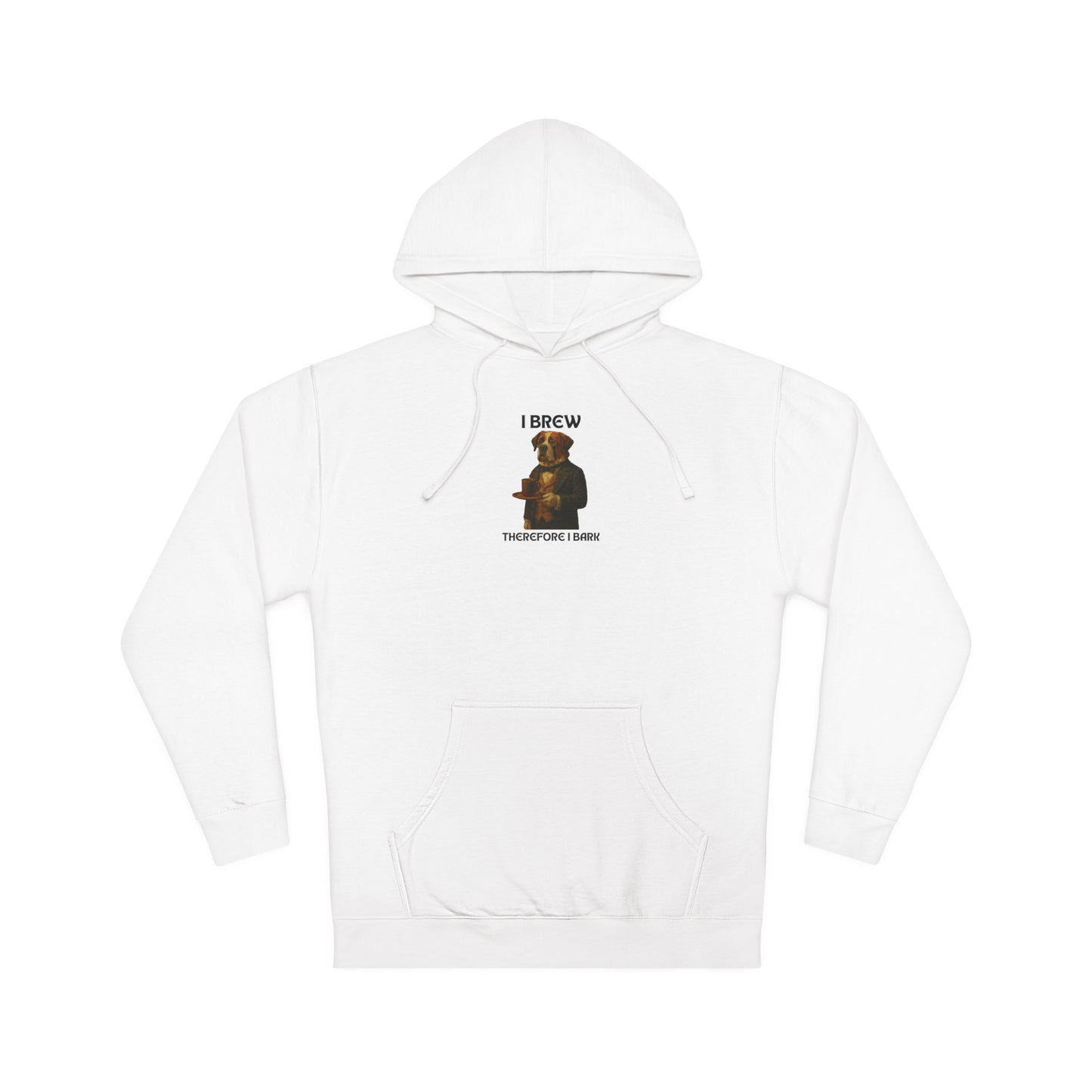 Discover a whimsical and humorous illustration featuring an anthropomorphic dog dressed in a sophisticated suit and bow tie, presenting a clever play on words. The image depicts a distinguished canine server holding a coffee mug on a tray, embodying the witty phrase "I Brew, Therefore I Bark" - a creative twist on the famous Descartes quote. The artwork is rendered in a painterly, almost classical style that evokes vintage portraiture, with meticulous attention to detail in the dog's expressive face and elegant attire. The bold, stark typography emphasizes the comedic message, with "I BREW" and "THEREFORE I BARK" displayed prominently above and below the character. This imaginative piece blends humor, wordplay, and artistic skill to create a memorable and entertaining visual that will delight coffee lovers and dog enthusiasts alike.Fantasy Dog Portraits