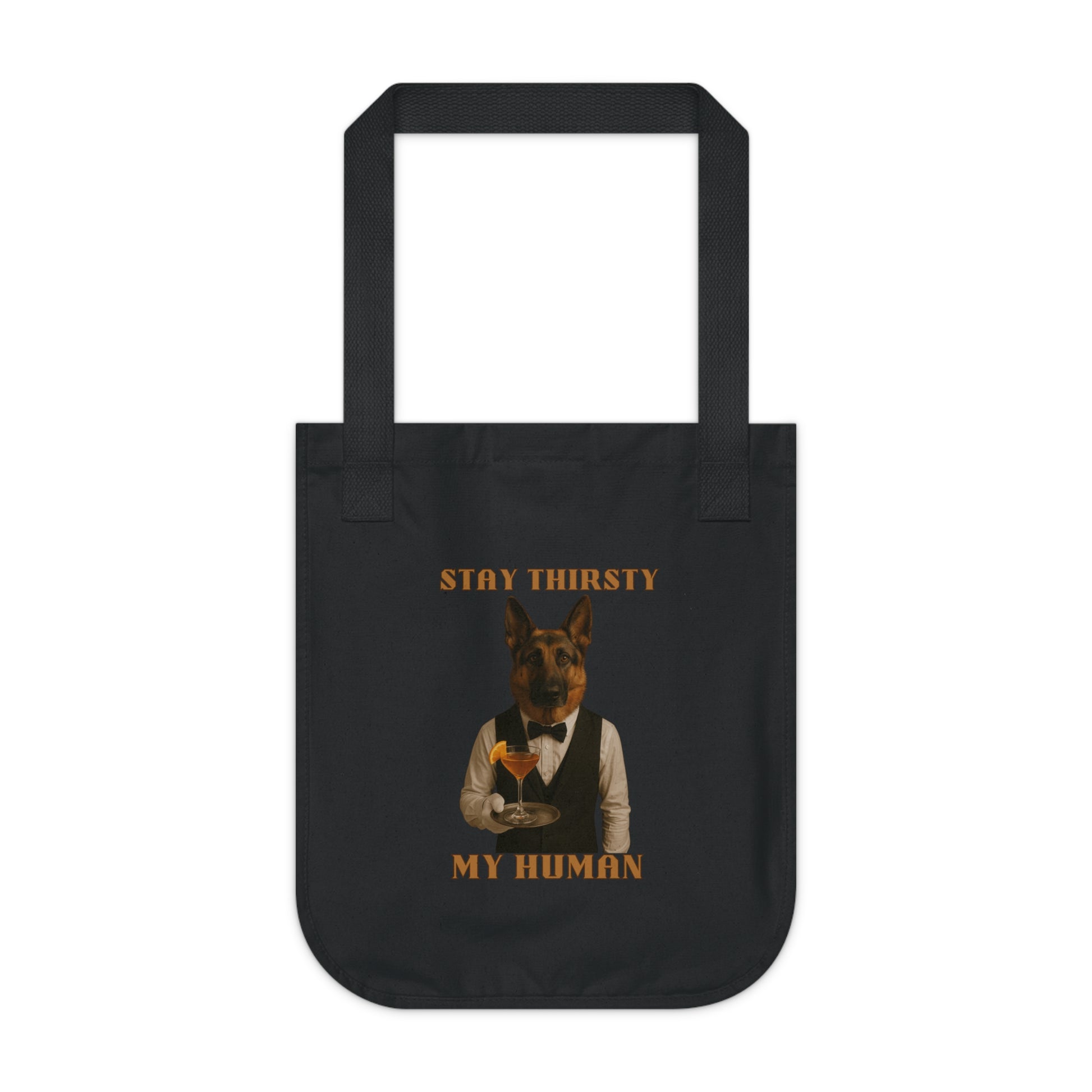 This humorous digital artwork features a German Shepherd dressed as a sophisticated bartender, wearing a white shirt, black vest, and bow tie, while holding a cocktail glass with an orange slice garnish. The image is styled like a vintage poster, with bold, stylized text reading "STAY THIRSTY" at the top and "MY HUMAN" at the bottom. The dog's head is photorealistically rendered, maintaining the distinct features of the breed, while the body is clothed in formal bartending attire. The composition creates a playful anthropomorphic scene that personifies the dog as a refined mixologist. The artwork employs a dramatic, high-contrast visual style that emphasizes the whimsical concept of a canine bartender.Fantasy Dog Portraits
