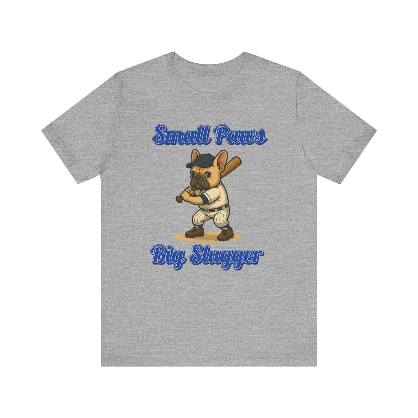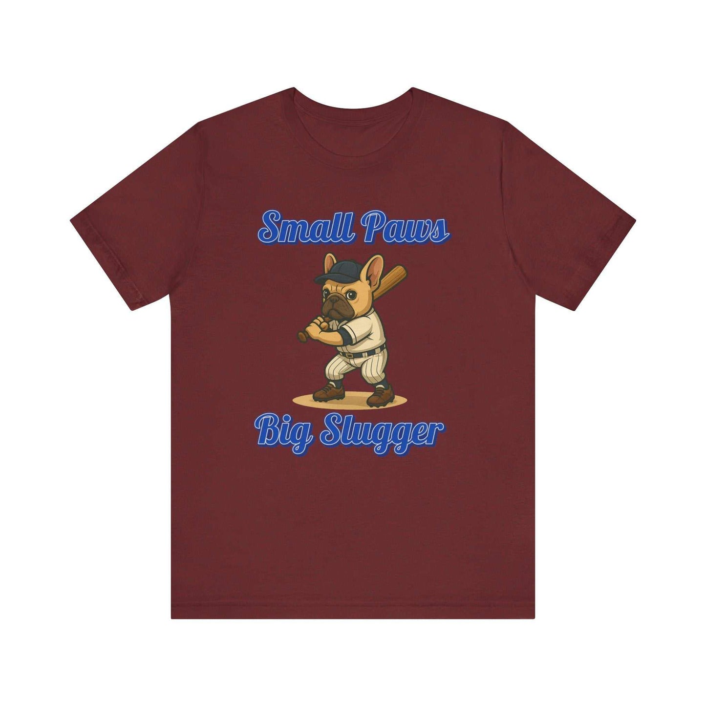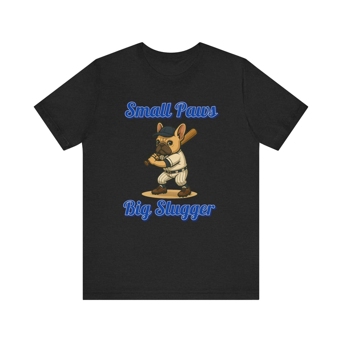 The image depicts a charming cartoon French Bulldog dressed as a baseball player, standing in a batting stance against a black background. Titled "Small Paws, Big Slugger," the graphic showcases the dog wearing a classic pinstripe baseball uniform, complete with a cap and baseball cleats. The bulldog is poised with a baseball bat, ready to swing, with a determined and focused expression characteristic of the breed. The illustration uses a playful and stylized art style, highlighting the dog's muscular build and athletic posture. Rendered in warm, muted colors, the image creates a whimsical and endearing portrayal of a dog as a baseball athlete. The text "Small Paws" and "Big Slugger" are displayed in bold, blue lettering, emphasizing the humorous contrast between the dog's small size and big athletic ambition. The artwork cleverly personifies the French Bulldog, giving it human-like characteristics and baseball gear while maintaining its distinctive breed features. The composition is centered on a yellow-toned base, drawing attention to the dog's stance and creating a spotlight effect. This playful image would likely appeal to dog lovers, baseball fans, and those who appreciate creative, anthropomorphic illustrations. The graphic successfully combines humor, sports, and canine charm in a single, eye-catching design.Fantasy Dog Portraits