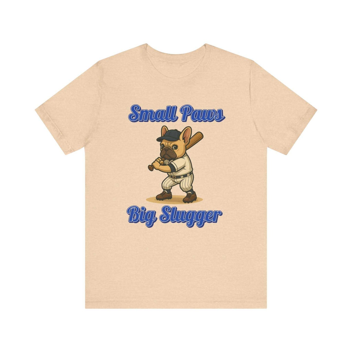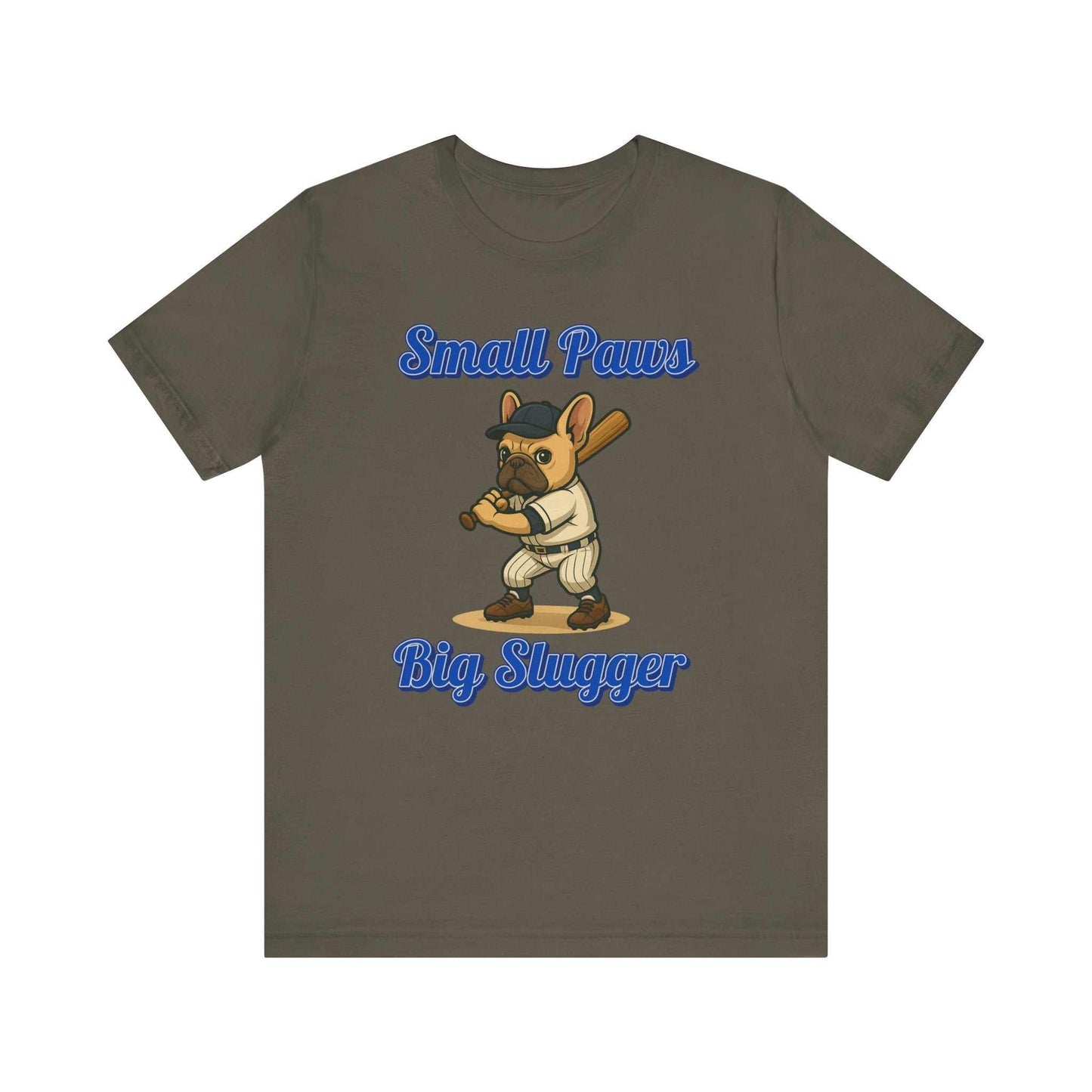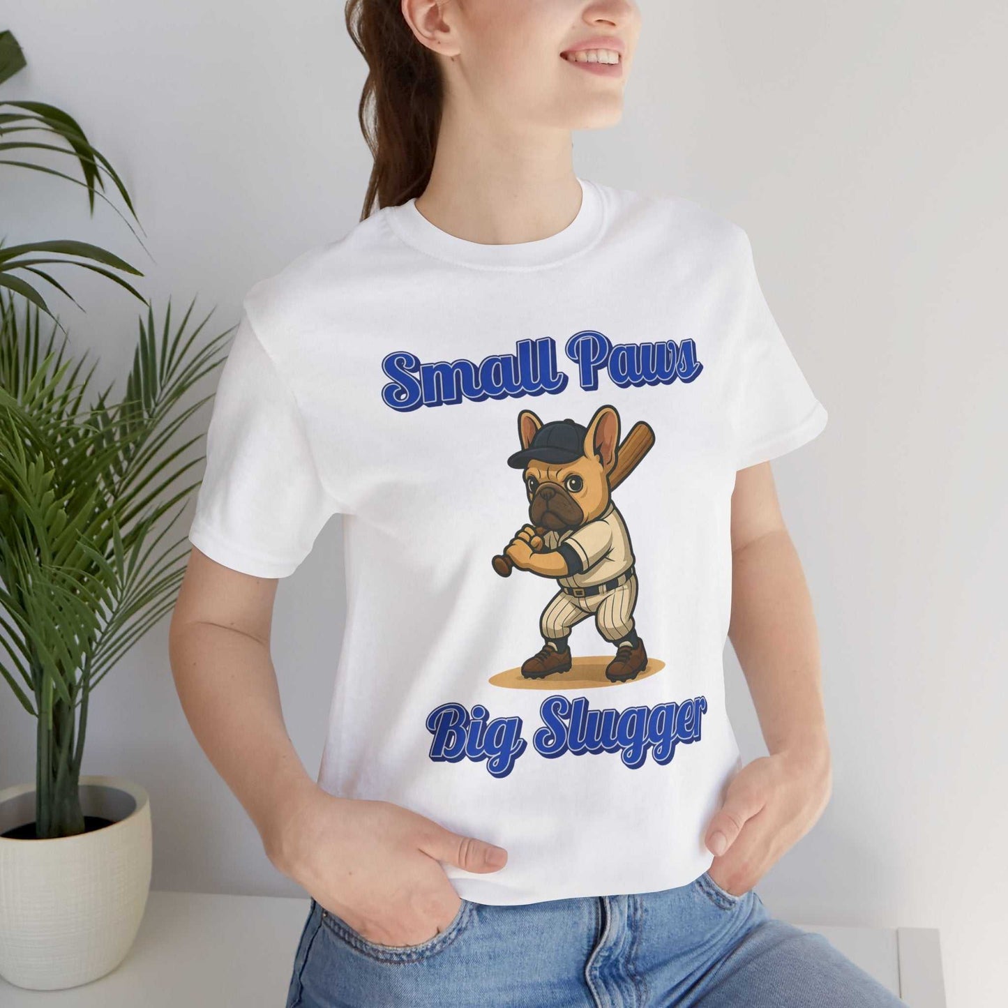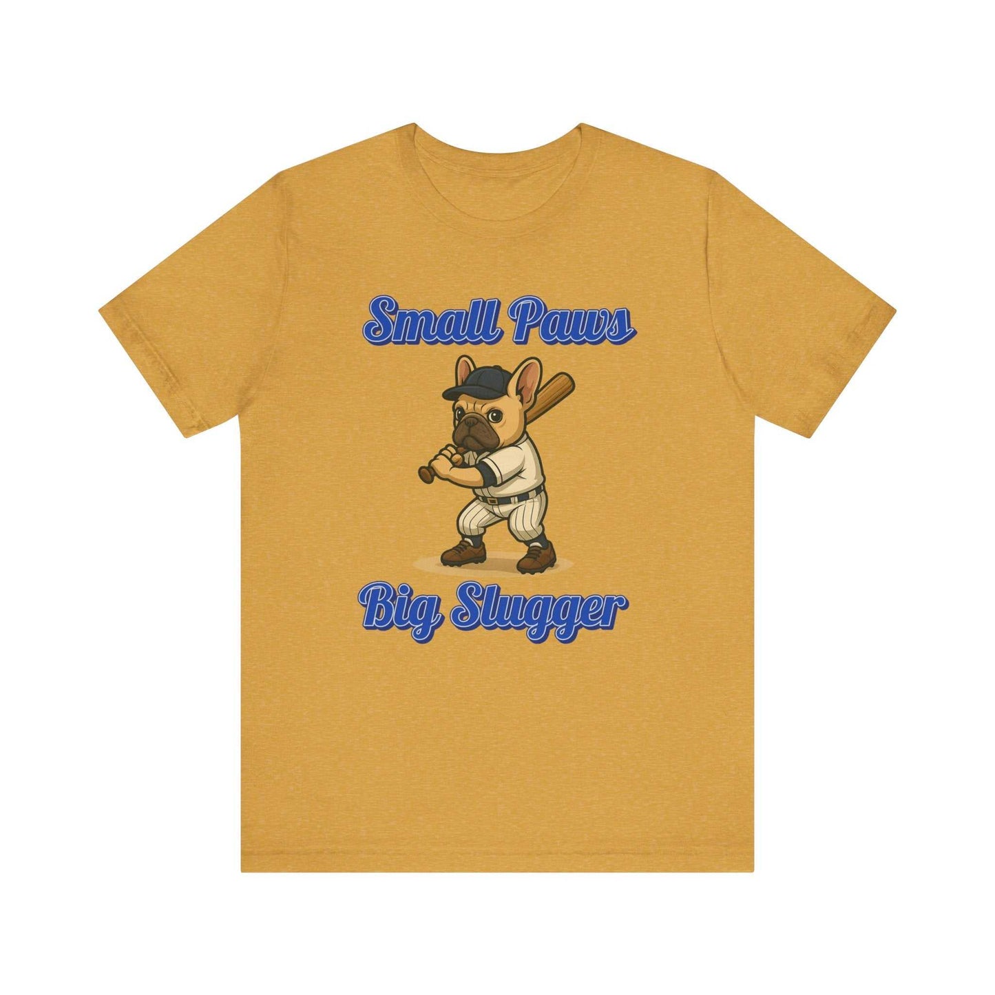 The image depicts a charming cartoon French Bulldog dressed as a baseball player, standing in a batting stance against a black background. Titled "Small Paws, Big Slugger," the graphic showcases the dog wearing a classic pinstripe baseball uniform, complete with a cap and baseball cleats. The bulldog is poised with a baseball bat, ready to swing, with a determined and focused expression characteristic of the breed. The illustration uses a playful and stylized art style, highlighting the dog's muscular build and athletic posture. Rendered in warm, muted colors, the image creates a whimsical and endearing portrayal of a dog as a baseball athlete. The text "Small Paws" and "Big Slugger" are displayed in bold, blue lettering, emphasizing the humorous contrast between the dog's small size and big athletic ambition. The artwork cleverly personifies the French Bulldog, giving it human-like characteristics and baseball gear while maintaining its distinctive breed features. The composition is centered on a yellow-toned base, drawing attention to the dog's stance and creating a spotlight effect. This playful image would likely appeal to dog lovers, baseball fans, and those who appreciate creative, anthropomorphic illustrations. The graphic successfully combines humor, sports, and canine charm in a single, eye-catching design.Fantasy Dog Portraits