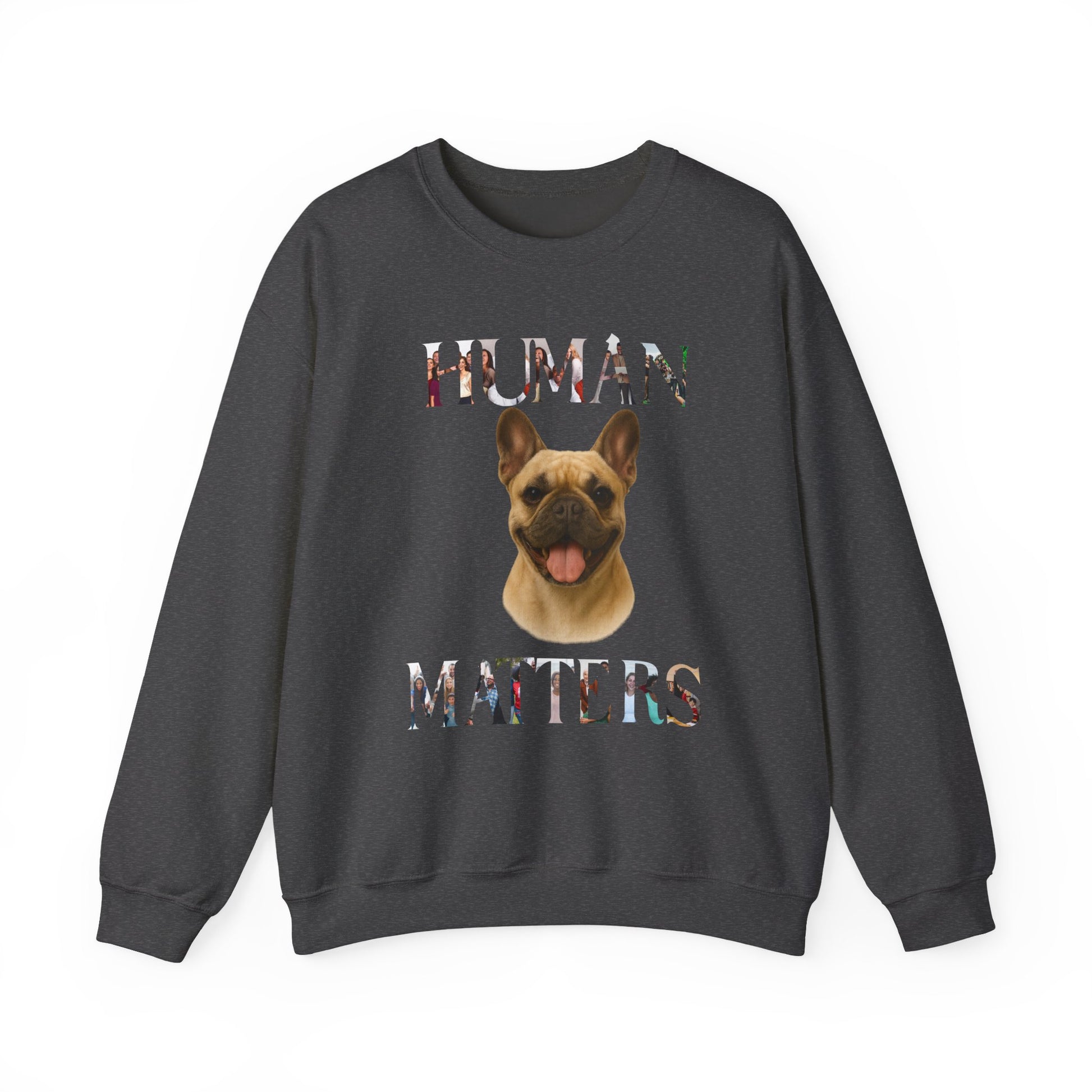 This vibrant and creative image showcases a French Bulldog with a playful, tongue-out expression positioned between the words "HUMANS" and "MATTERS." The typography of both words is uniquely composed of photographs of diverse groups of people, creating a visually striking collage effect. The French Bulldog, with its characteristic wrinkled face and large, upright ears, appears to be smiling directly at the viewer, exuding a sense of joy and connection. The color palette is warm and inviting, with the dog's tan and fawn coat complementing the varied human images within the letters. The overall composition suggests a powerful message about the interconnectedness of humans and animals, emphasizing empathy, diversity, and mutual understanding.Fantasy Dog Portraits