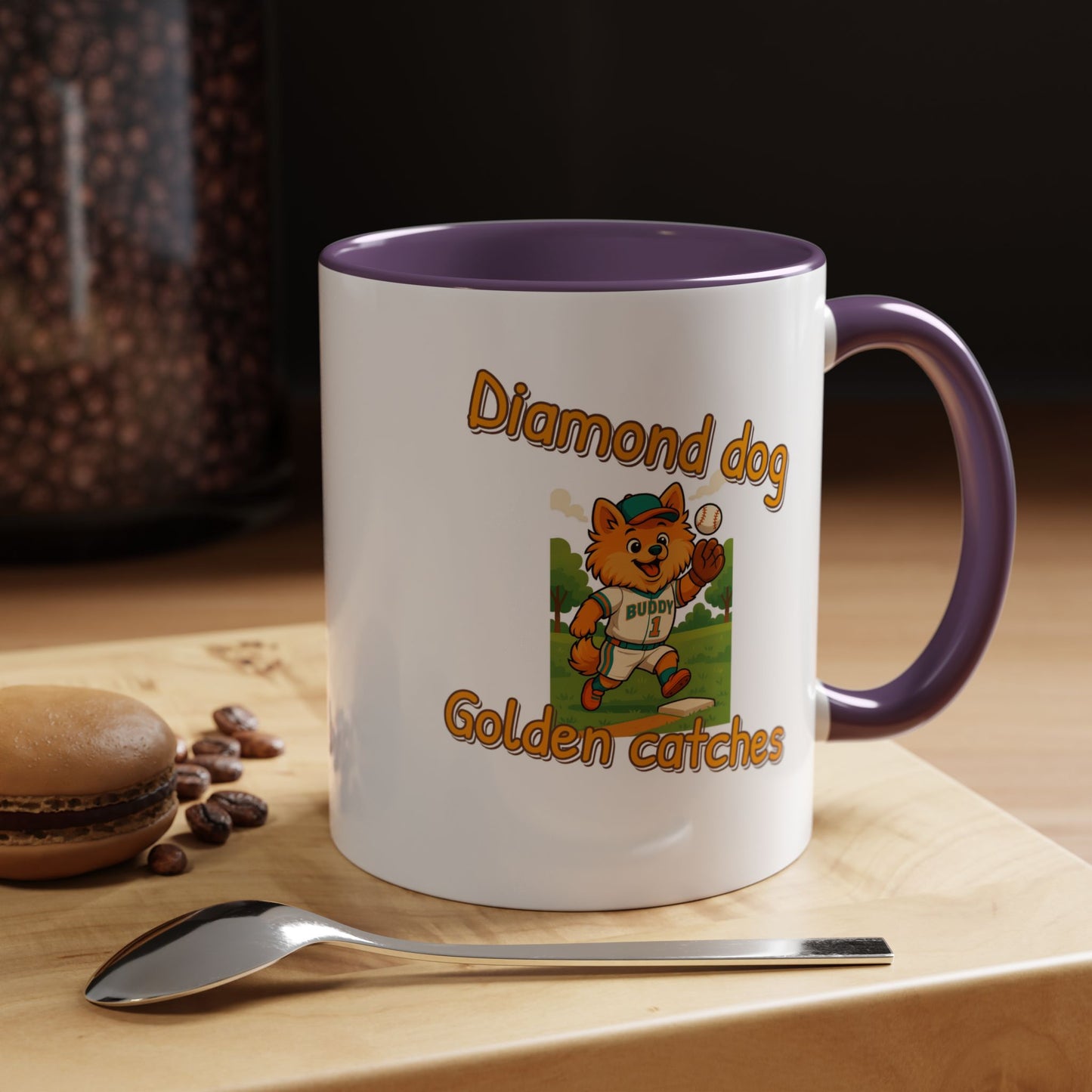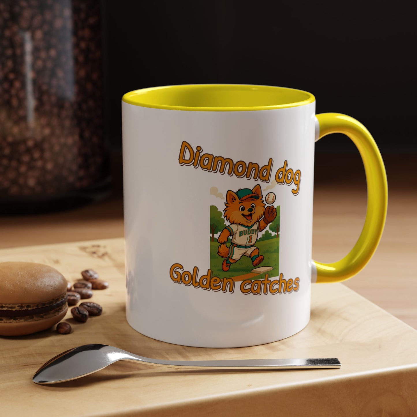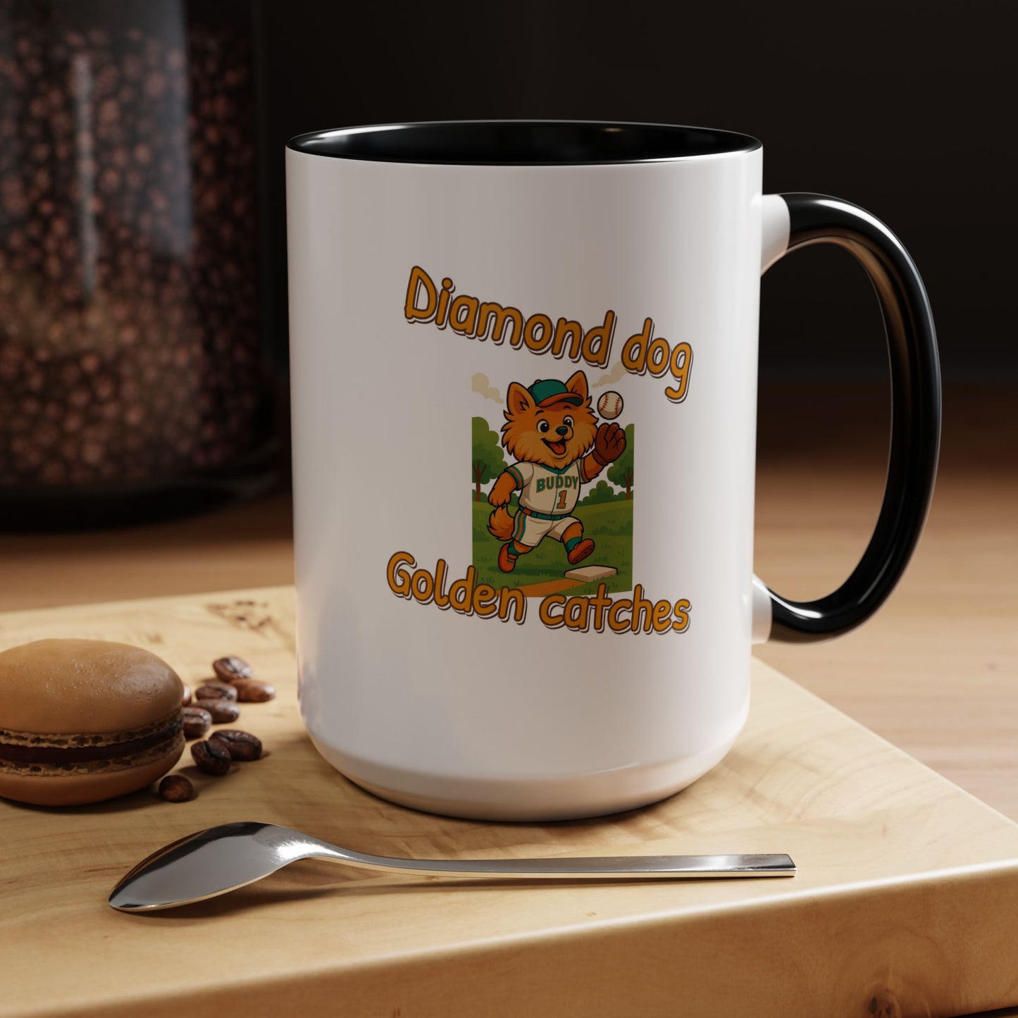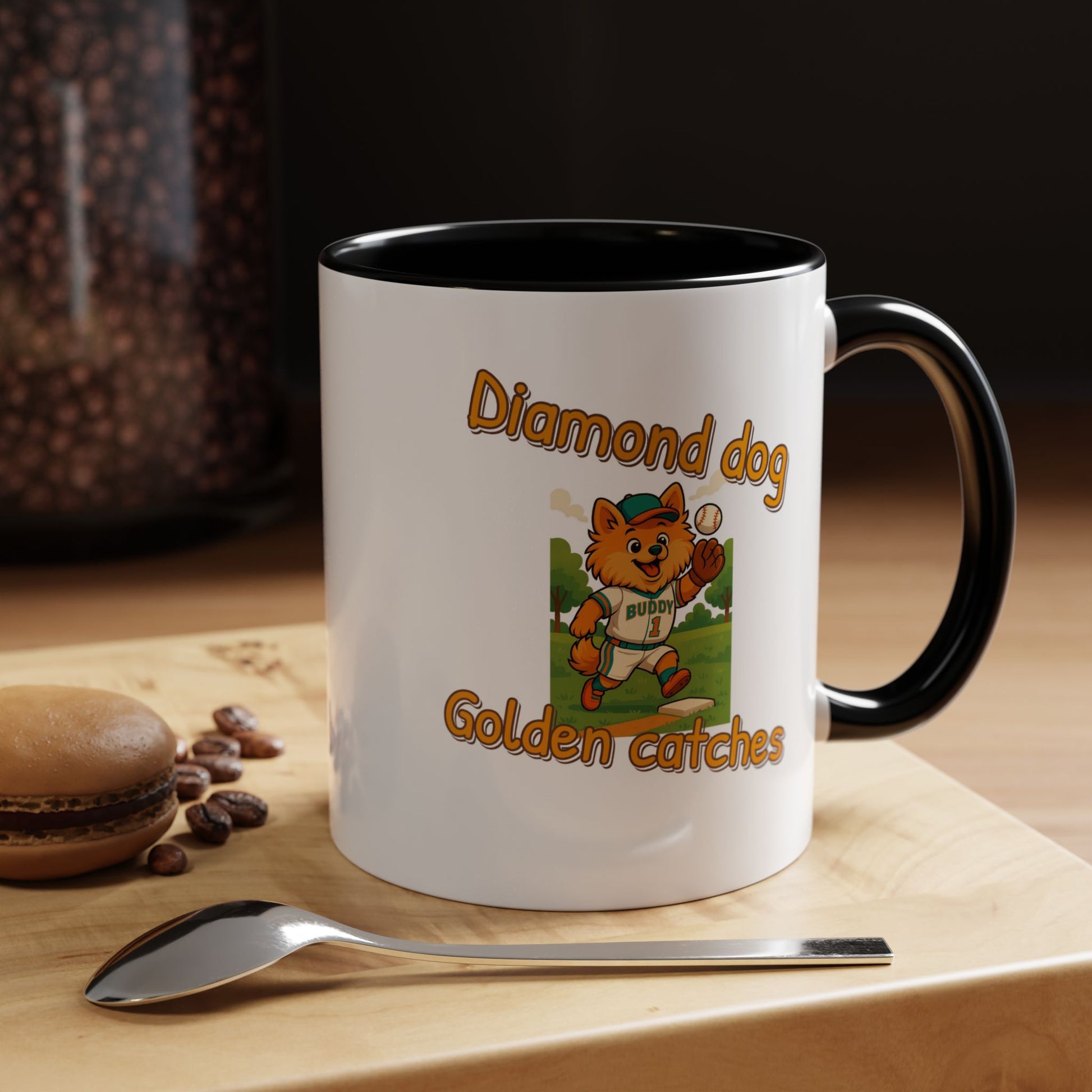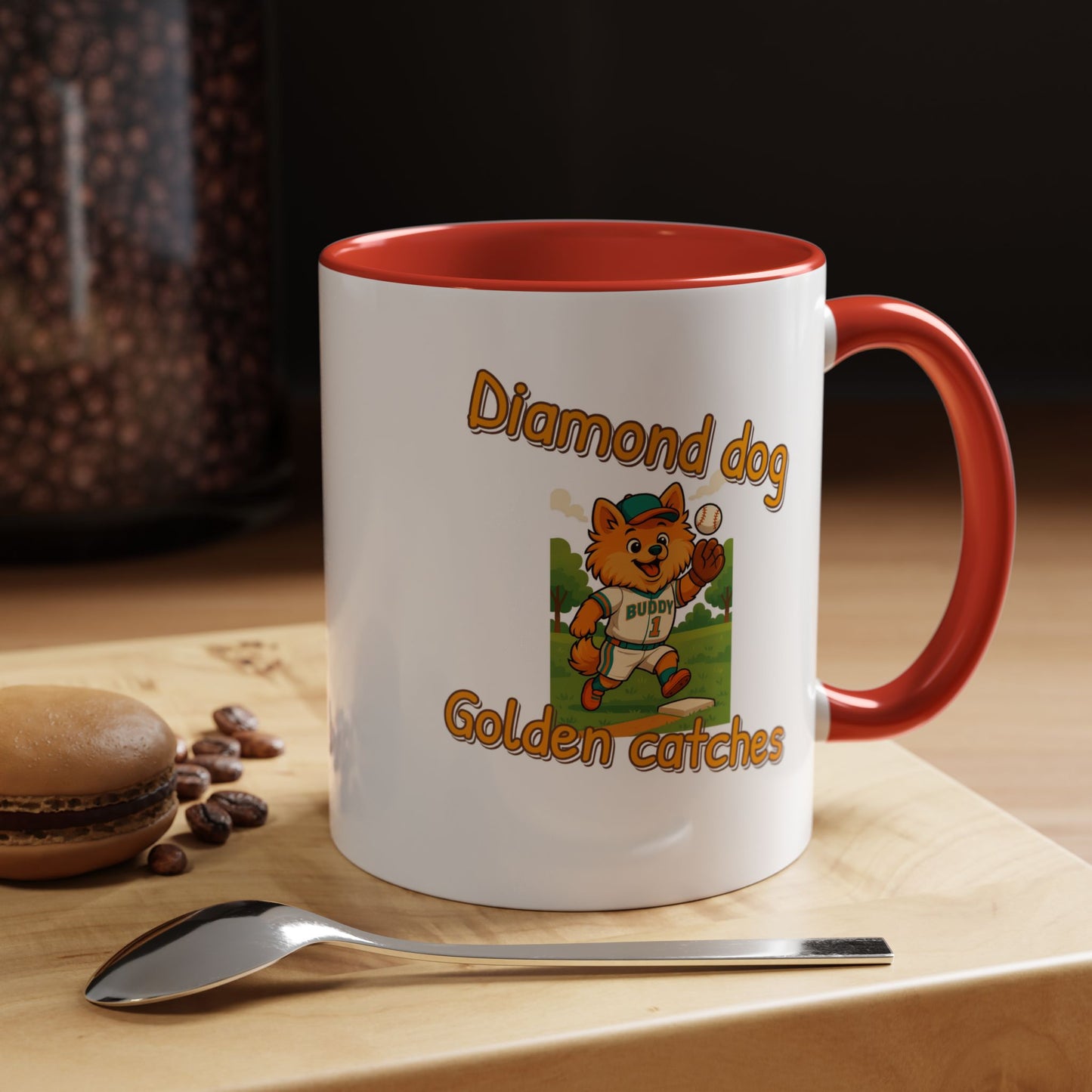 Introducing the adorable "Diamond Dog Golden Catches" mascot, a charming orange-furred cartoon character dressed in a baseball uniform with the name "Buddy" and the number 1. This playful illustration captures the spirit of baseball, featuring the cute canine player mid-action on a sunny baseball field with green trees in the background. The mascot is wearing a teal cap and uniform trim, adding a vibrant pop of color to the scene, and is shown catching a baseball near a base. The graphic design uses a warm, inviting color palette with golden-orange text that matches the dog's fur, creating a cohesive and eye-catching visual. The image radiates a sense of fun, enthusiasm, and team spirit, making it perfect for sports-related branding, children's merchandise, or baseball promotion materials. The character's expressive face and dynamic pose suggest excitement and joy, appealing to both children and sports fans alike. The detailed illustration showcases professional-quality artwork with smooth lines, playful proportions, and a cheerful atmosphere. "Diamond Dog Golden Catches" seems like a potential brand or team name that combines the love of dogs, baseball, and playful imagery. The design successfully blends cartoon aesthetics with sports themes, creating a memorable and engaging visual representation. This image would be an excellent choice for logos, team mascots, sports equipment branding, or children's sports-related graphics.