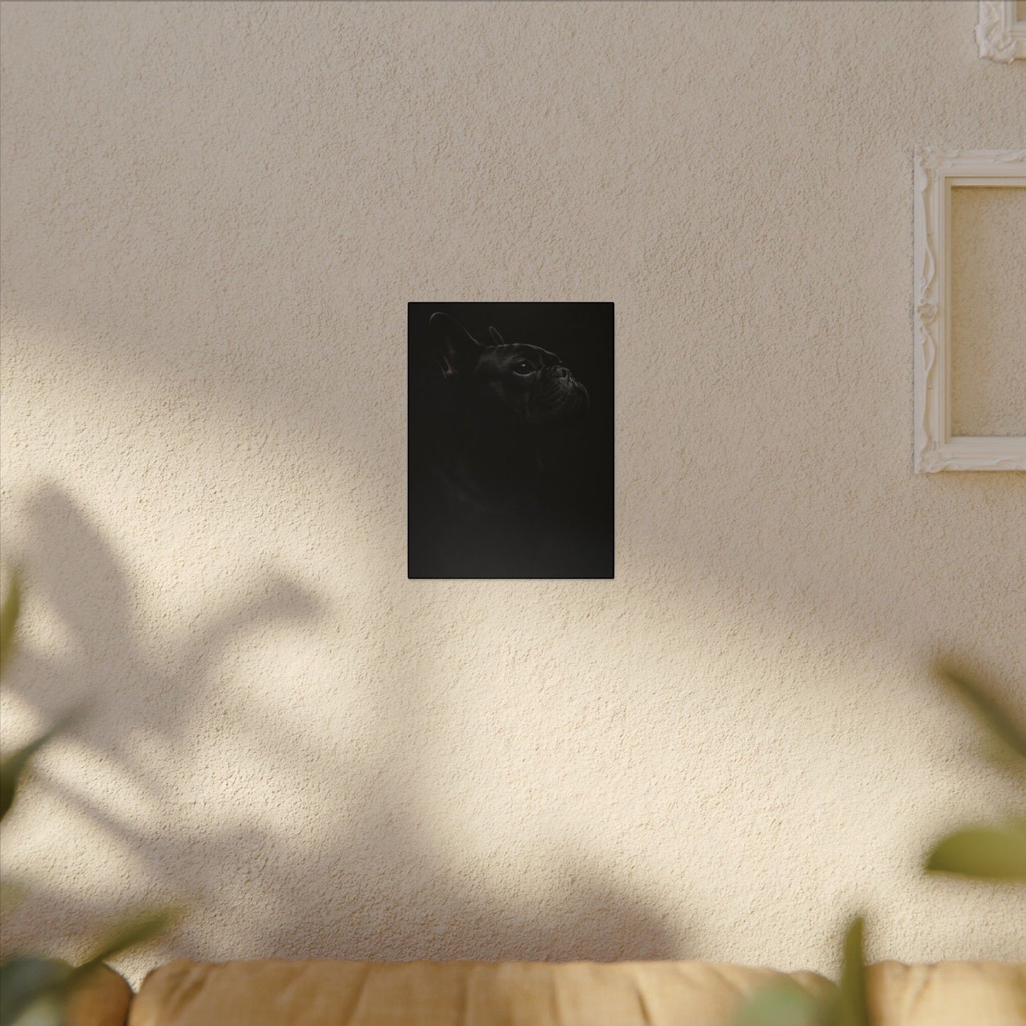 This stunning black-and-white portrait captures a French Bulldog in a dramatic low-key lighting setup, showcasing the breed's distinctive features with remarkable depth and emotion. The dog's profile is illuminated against a deep, pitch-black background, creating a powerful contrast that highlights every subtle contour of its muscular face and compact body. Its upturned gaze suggests a sense of anticipation or curiosity, with the soft reflection in its eye adding a touch of depth and life to the image. The lighting technique emphasizes the dog's unique facial structure, with pronounced wrinkles and a characteristically short, broad muzzle typical of the breed. Every detail is meticulously rendered, from the texture of the dog's short, smooth coat to the delicate outline of its perked ear. The photograph demonstrates exceptional photographic skill, using light and shadow to create a minimalist yet incredibly expressive portrait that goes beyond a simple pet photo. The dog's posture and expression convey a sense of dignity and personality, transforming the image from a mere animal portrait to a piece of fine art. The stark black background ensures that nothing distracts from the dog's compelling presence, making the viewer focus entirely on its nuanced expression and form. This image exemplifies the beauty of the French Bulldog breed, capturing its charm, strength, and unique aesthetic in a single, breathtaking moment. The photograph serves as a testament to the power of professional animal photography, showcasing how light, composition, and subject can combine to create a truly memorable visual experience.