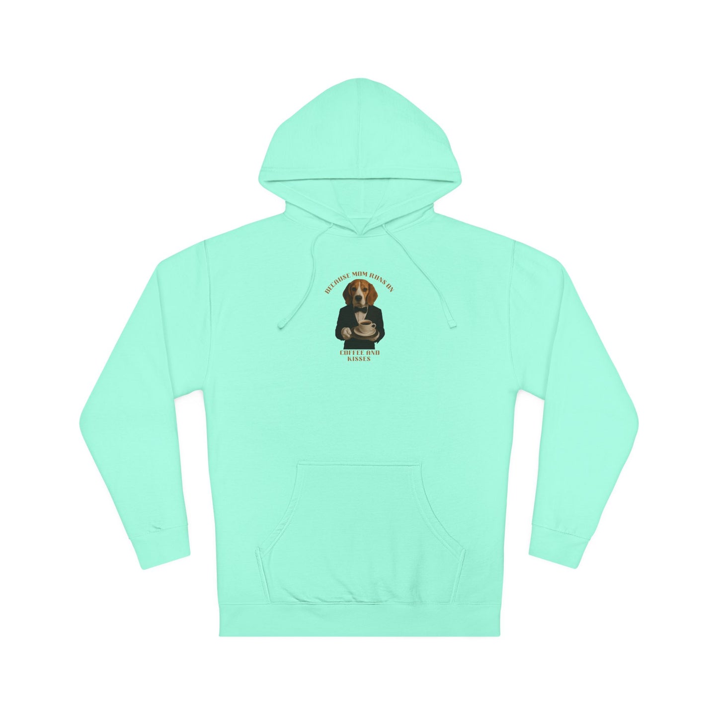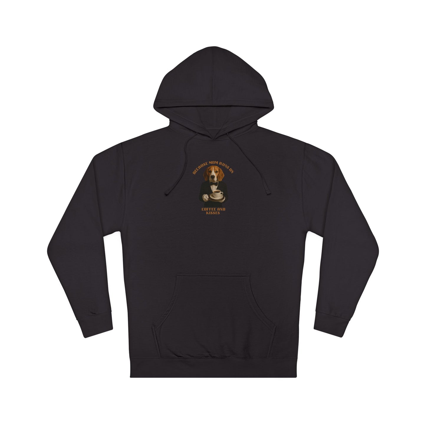 The image features a whimsical portrayal of a Beagle dog dressed in a formal white shirt and bowtie, holding a cup of coffee. The humorous graphic is designed with a playful text overlay reading "BECAUSE MOM RUNS ON" at the top, followed by "COFFEE AND KISSES" at the bottom. The Beagle's head is photorealistically superimposed on a stylized human body, creating a comical anthropomorphic effect. The coffee cup is placed on a saucer, and the dog appears to be presenting it in a server-like pose. The design combines photography and graphic elements to create a humorous, meme-like illustration that plays on the popular "mom needs coffee" trope.Fantasy Dog Portraits