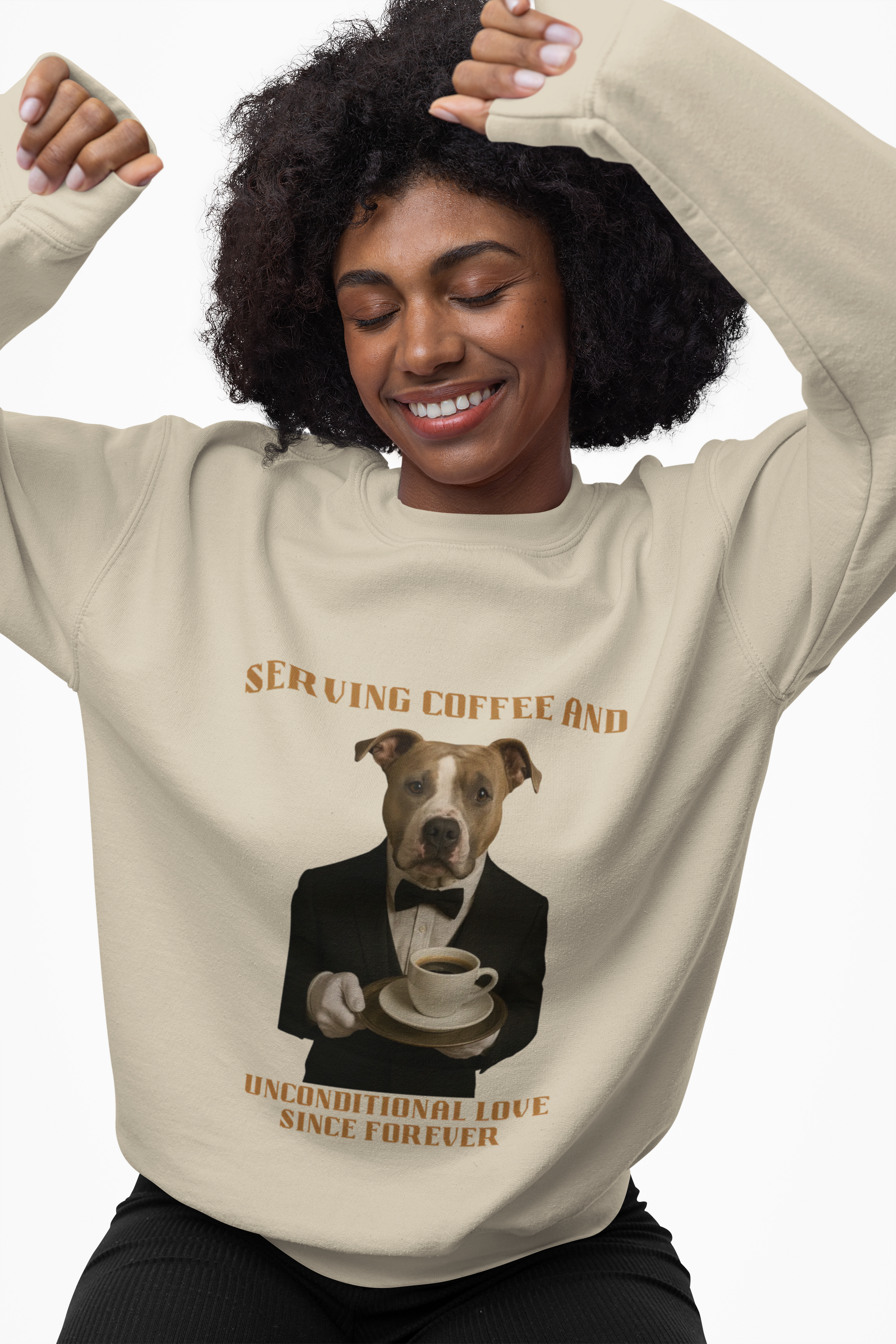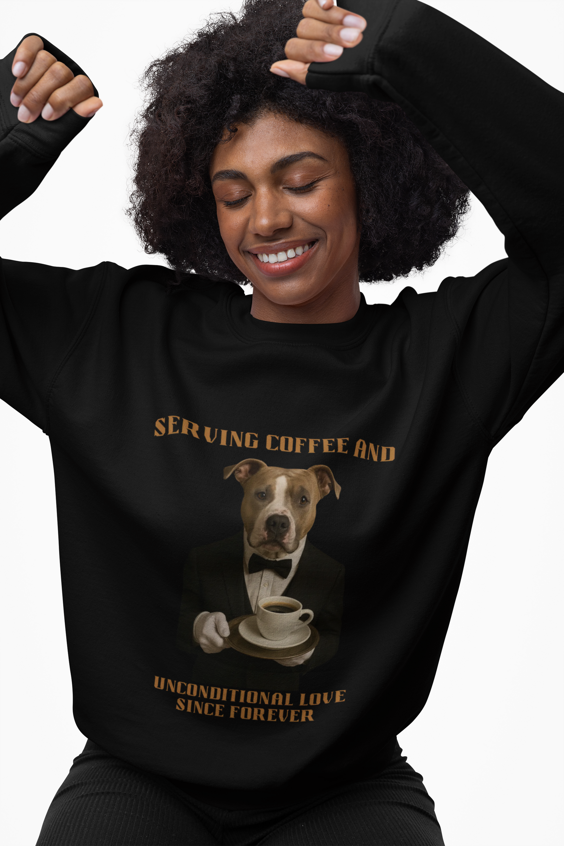 This humorous vintage-style poster features a pit bull or similar breed dressed in an elegant black tuxedo with a bow tie, serving coffee with a formal, sophisticated demeanor. The dog is wearing white gloves and holding a silver serving tray with a classic white coffee cup and saucer filled with dark coffee. The image is styled like a vintage advertisement or motivational poster, with large golden-brown text reading "SERVING COFFEE AND" at the top and "UNCONDITIONAL LOVE SINCE FOREVER" at the bottom. The dog's expression is serious and dignified, looking directly at the viewer with a stoic, professional stance that adds to the comedic effect of the anthropomorphized canine. The overall aesthetic is a playful blend of formal photography and quirky animal portraiture, creating a charming and memorable visual that celebrates the loyal nature of dogs.Fantasy Dog Portraits