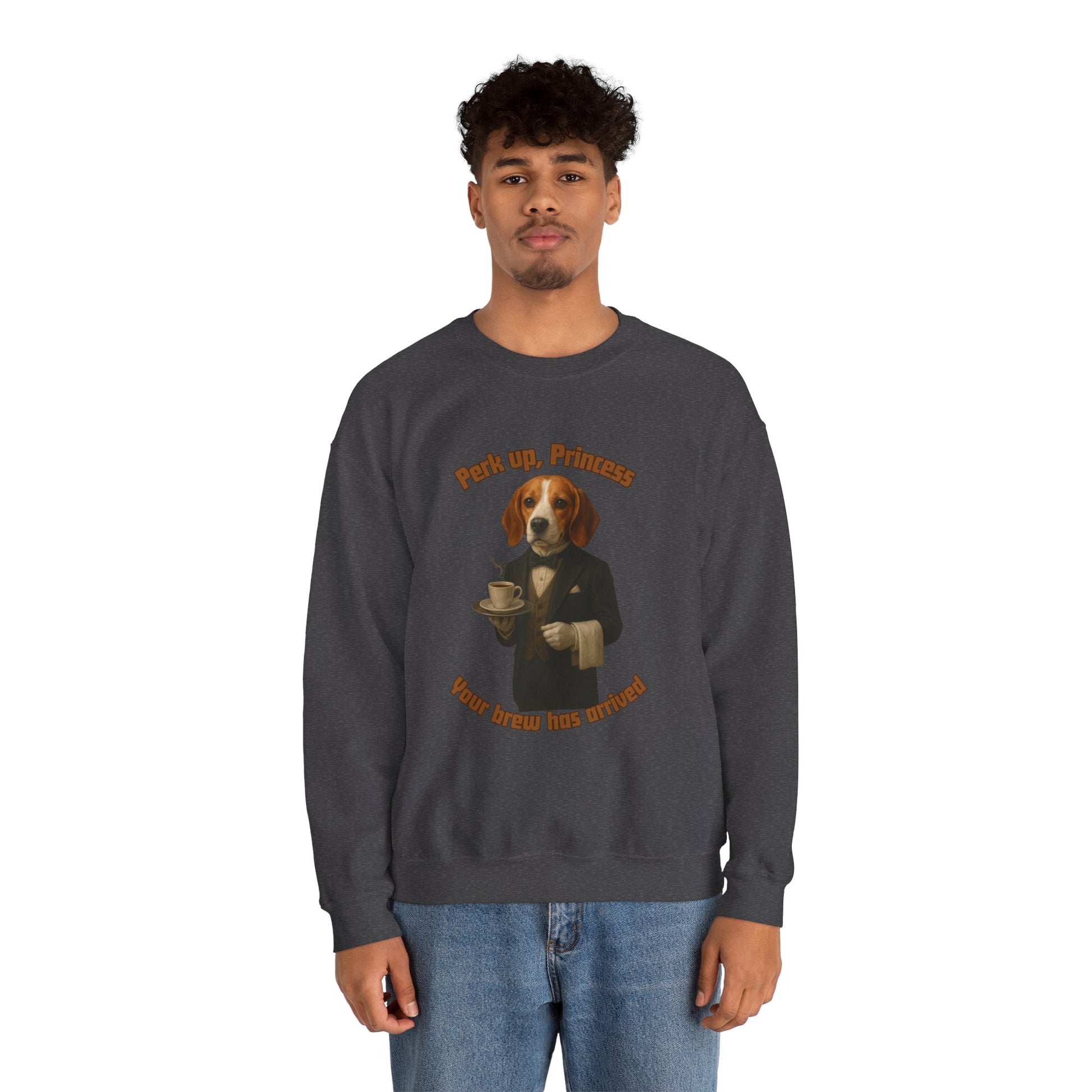 This humorous digital illustration features a Beagle dog anthropomorphized as a sophisticated waiter, dressed in a formal black tuxedo with a bow tie and holding a steaming cup of coffee on a serving tray. The image has a witty text overlay that reads "Perk up, Princess" and "Your brew has arrived" with a slight glitch or chromatic aberration effect on the typography. The dog's facial expression appears serious and professional, maintaining the comedic contrast between the elegant attire and the canine subject. The artwork is rendered in a highly detailed, realistic style that makes the dog look almost photographic, with careful attention to texture and lighting. The color palette is warm, featuring rich browns and blacks for the suit, and golden-red tones for the dog's fur, creating a visually appealing and whimsical scene.Fantasy Dog Portraits