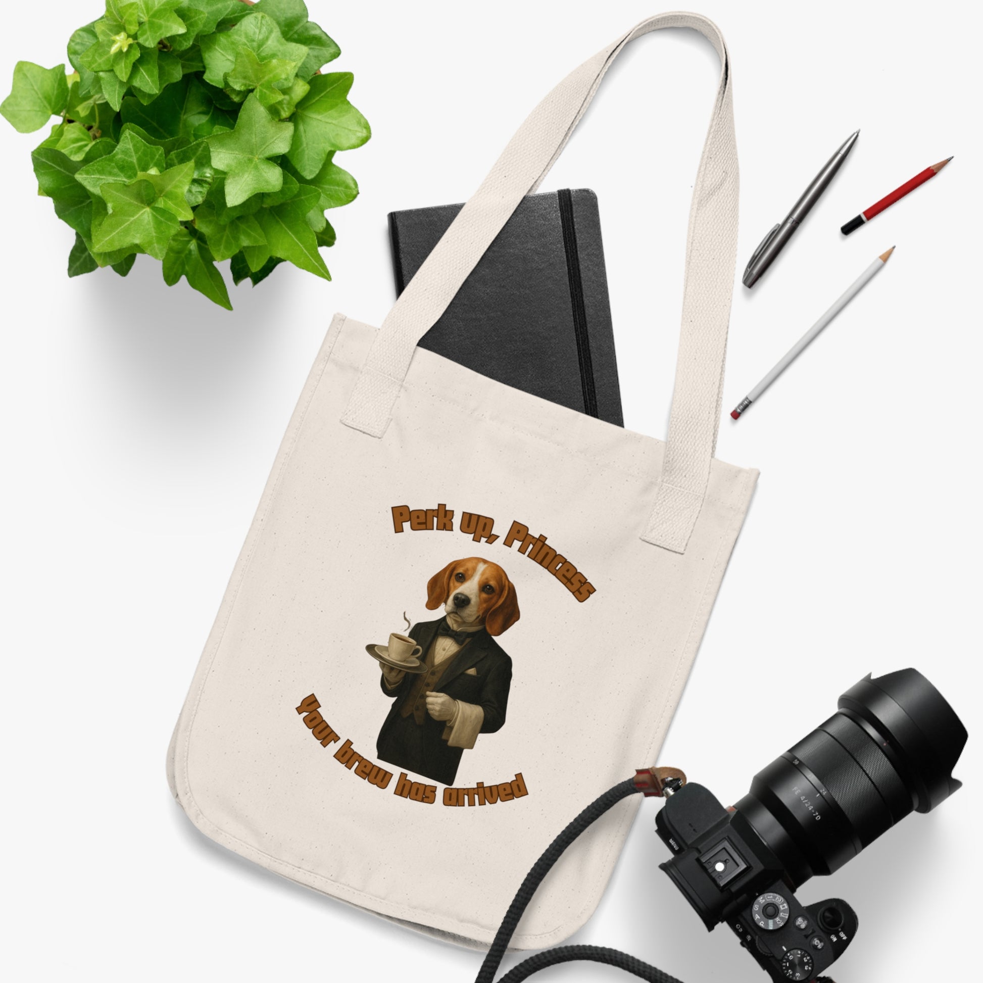 This humorous digital illustration features a Beagle dog dressed in a formal black tuxedo and bow tie, depicted as an elegant waiter. The anthropomorphic canine is holding a steaming cup of coffee on a serving tray, with a white napkin draped over one arm. The image is styled with a slight digital glitch effect on the black text that reads "Perk up, Princess" at the top and bottom of the image. The dog's expression is serious and dignified, contrasting playfully with the witty coffee-related pun "Your brew has arrived". The artwork is rendered in a realistic, detailed style that blends photographic quality with whimsical character design.Fantasy Dog Portraits