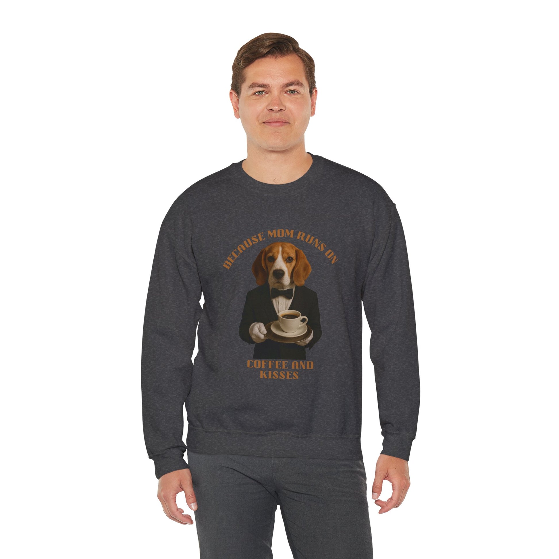 This humorous and stylized image features a Beagle dog dressed in a sophisticated black tuxedo with a bow tie, holding a white coffee cup and saucer. The dog is photographed in a portrait style against a white background, creating a whimsical anthropomorphic scene. The text "Because Mom Runs On" arches above the dog, with "Coffee and Kisses" displayed below in a vintage, serif font in a warm golden-brown color. The Beagle has a classic tri-color coat of white, tan, and brown, with soulful eyes looking directly at the viewer. The image playfully combines formal photography techniques with a comedic concept, turning the dog into a dapper coffee server.Fantasy Dog Portraits