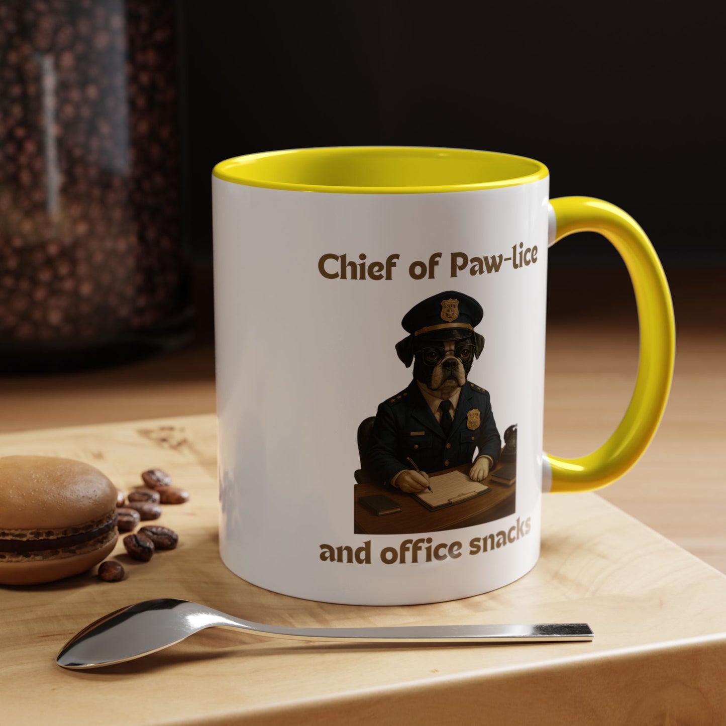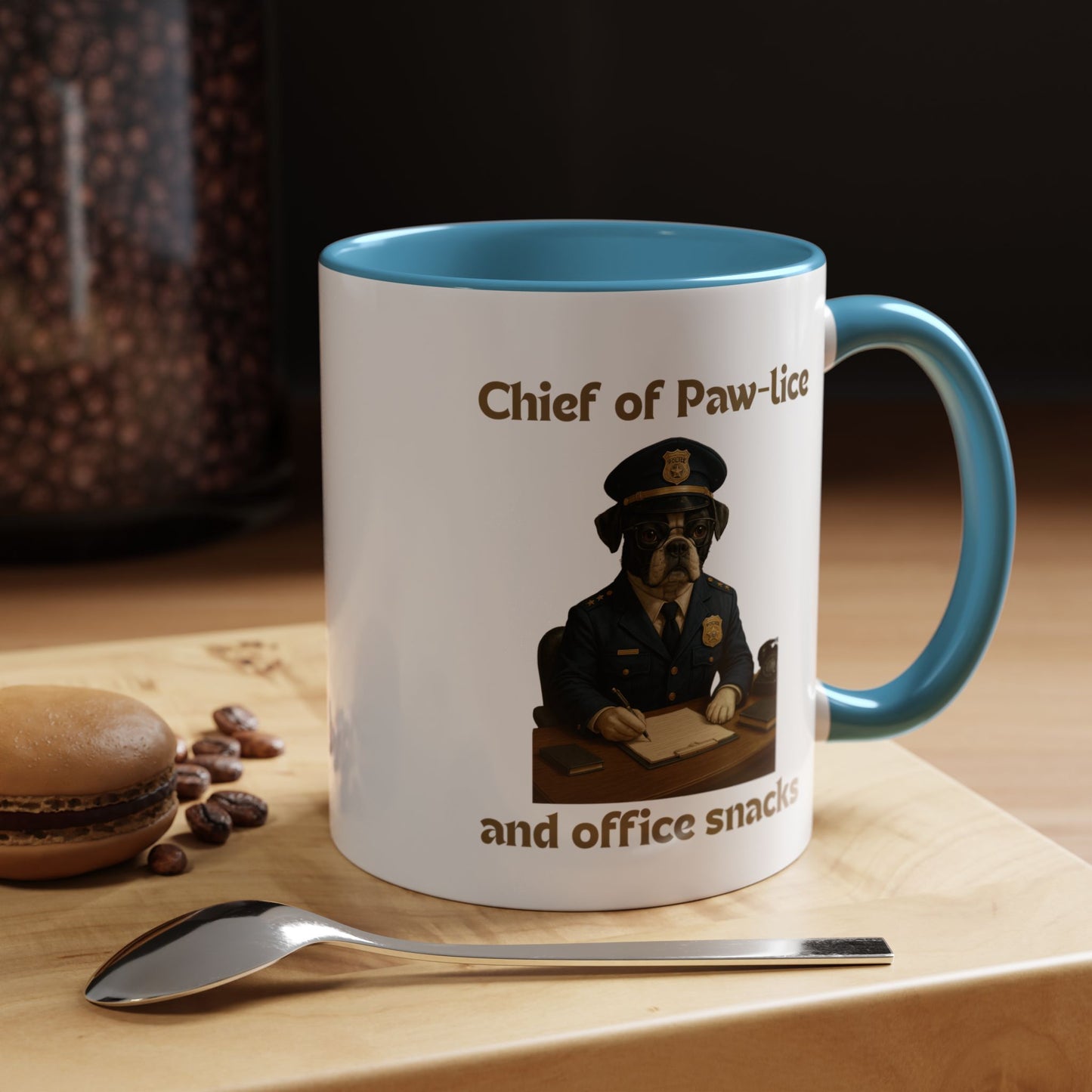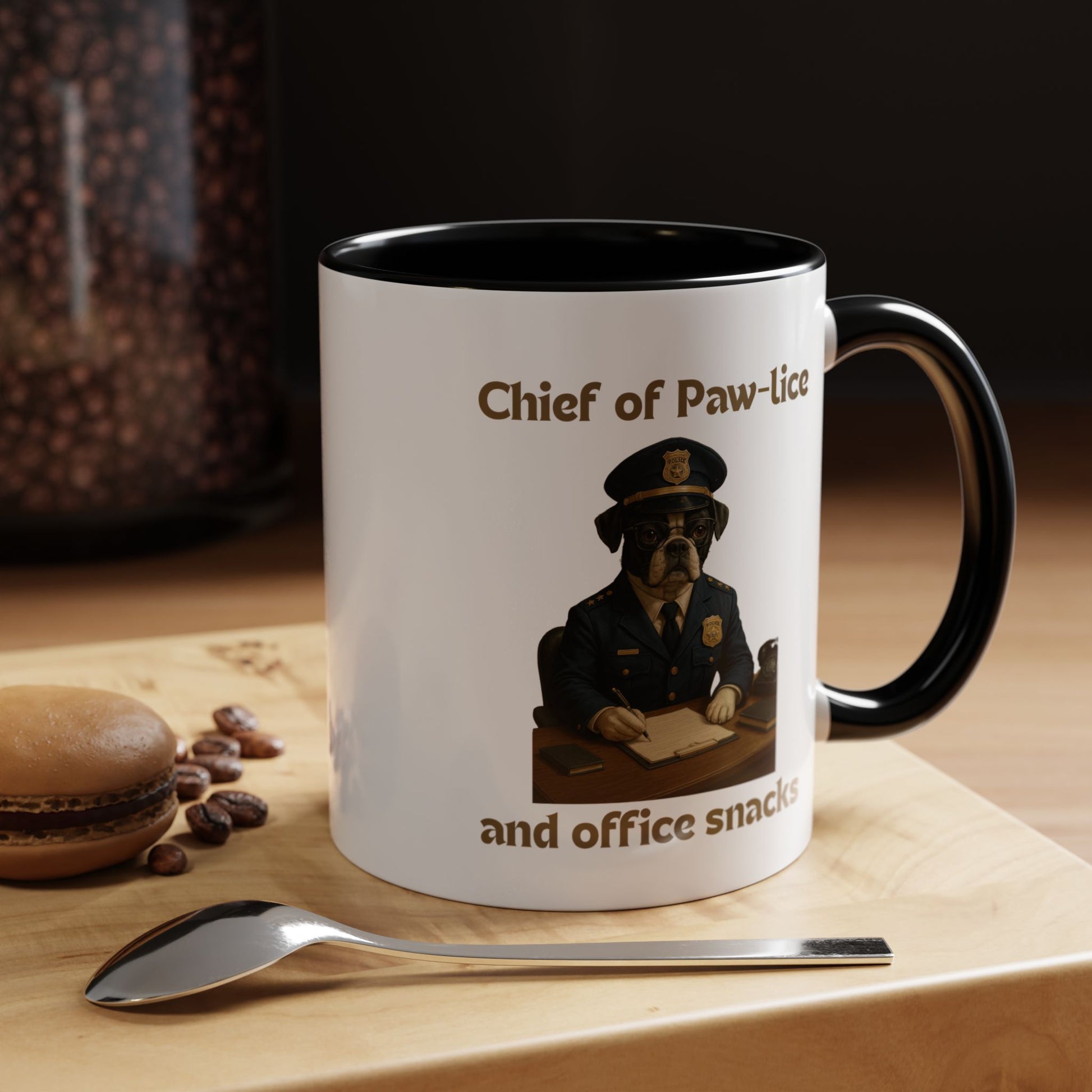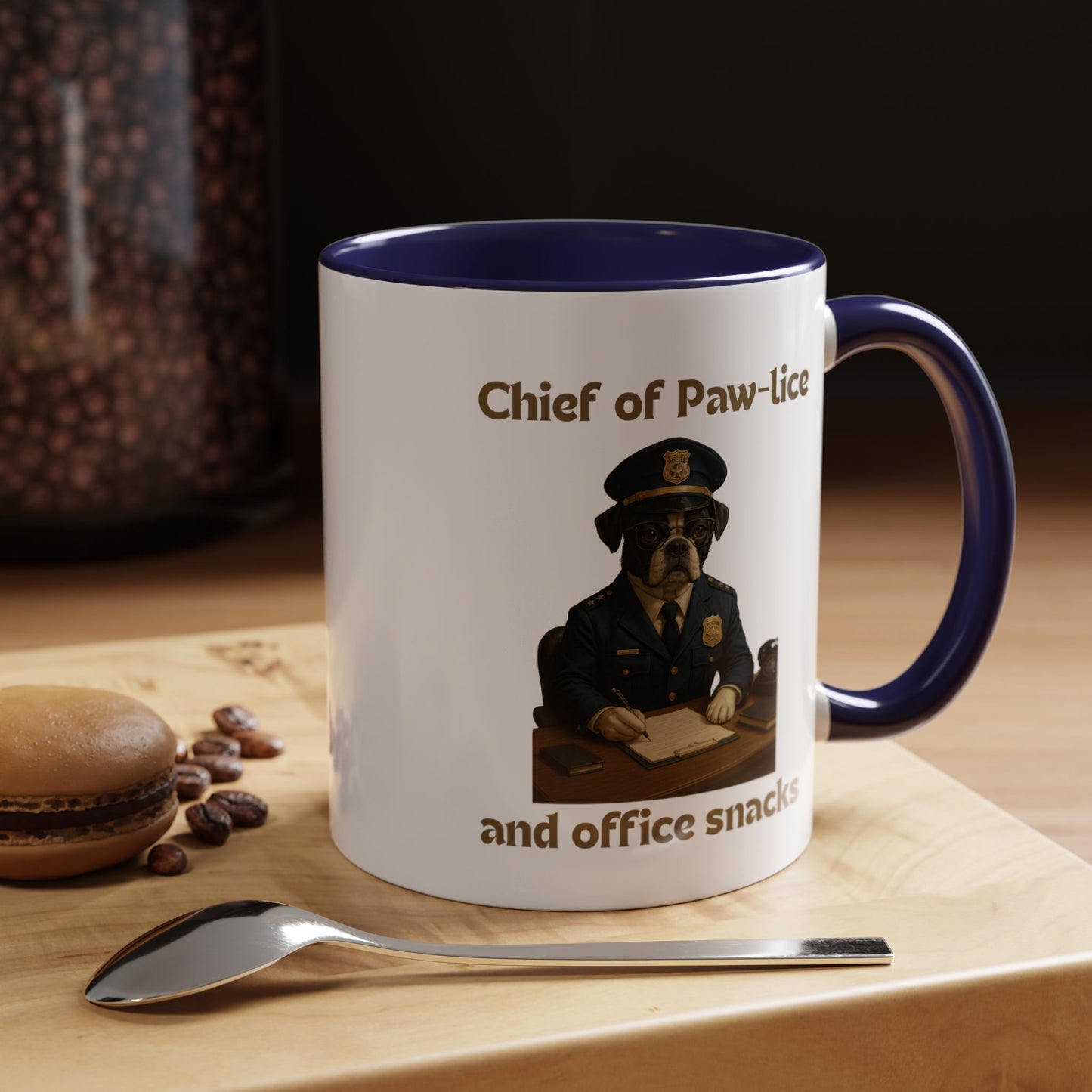 Introducing the hilarious "Chief of Paw-lice" - a whimsical art piece that transforms a Boston Terrier into a distinguished police chief. The portrait depicts a serious-looking dog wearing an official navy blue police uniform, complete with a peaked cap adorned with a golden police badge. Seated at a wooden desk, the canine officer is meticulously writing in an open notebook, surrounded by books and an old-fashioned rotary telephone. The image is a clever play on words, combining "paw" with "police" to create a humorous anthropomorphic scene that brings canine charm to law enforcement. The dog's stern expression and professional attire contrast delightfully with the playful concept, creating a comedic visual that is sure to bring a smile to viewers. The artwork is rendered in a photorealistic style, with rich, dark tones that give the image a sense of gravitas and importance. Gold lettering at the top and bottom of the image reads "Chief of Paw-lice" and "and office snacks", adding to the comedic effect. This artistic creation skillfully blends humor, anthropomorphism, and professional portraiture to create a memorable and entertaining image that celebrates both dogs and the spirit of law enforcement. The attention to detail in the uniform, the dog's expressive face, and the vintage office setting make this piece a standout conversation starter. Perfect for dog lovers, police humor enthusiasts, and art collectors with a sense of whimsy.