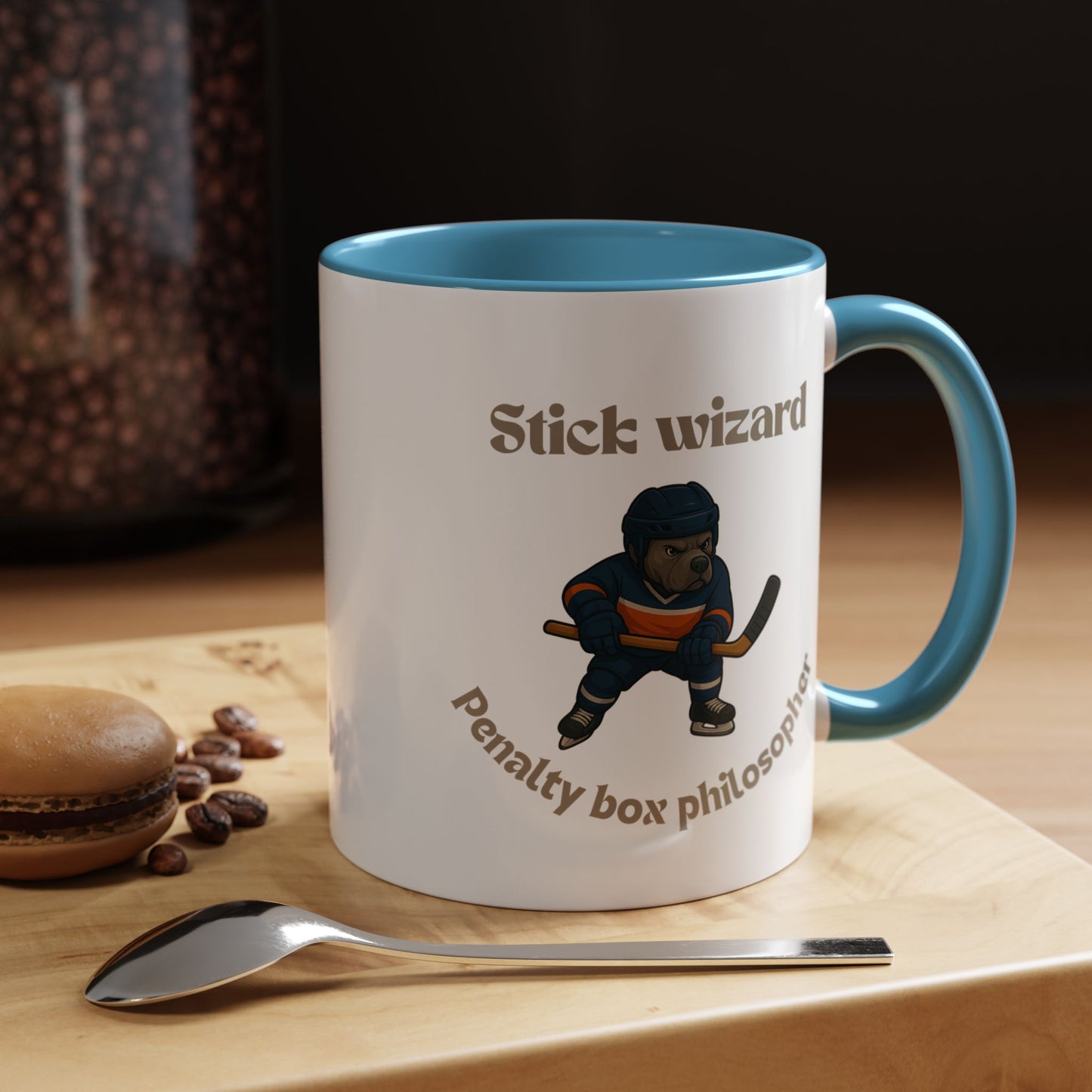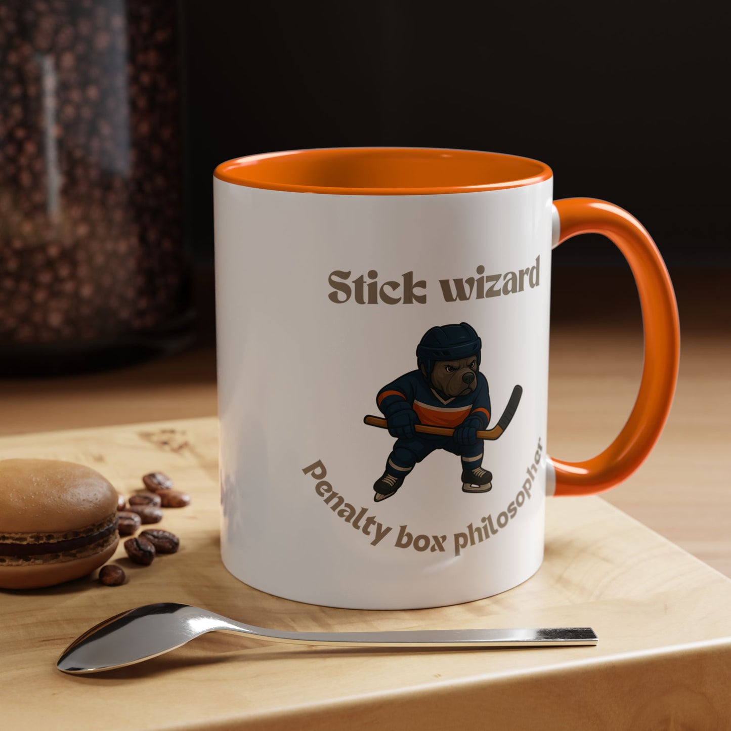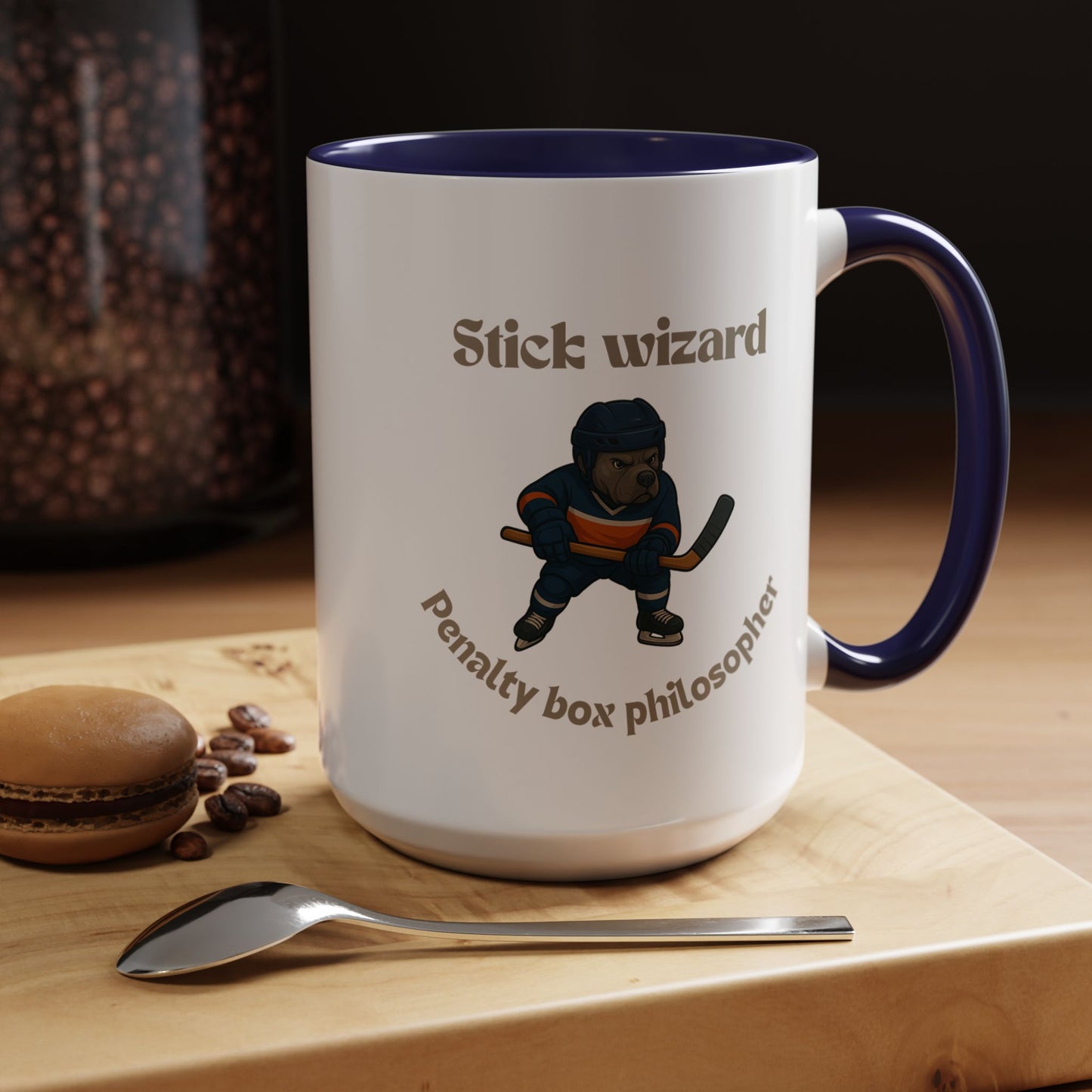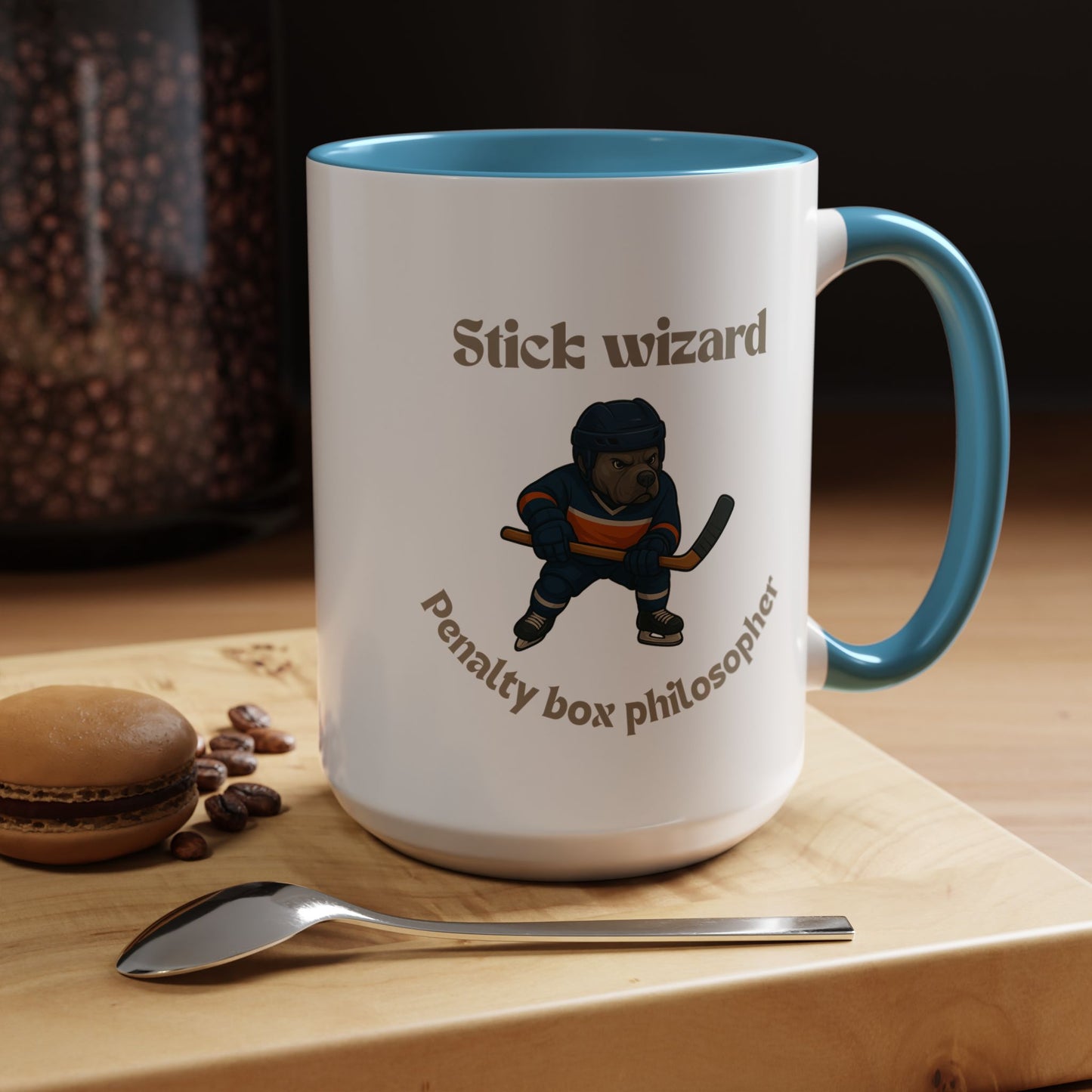The image depicts a humorous hockey-themed graphic featuring an anthropomorphic bulldog as a hockey player, styled as a "Stick Wizard" and "Penalty Box Philosopher". The dog is dressed in a blue and orange hockey uniform, complete with protective gear including a helmet and gloves, and is holding a hockey stick in a ready stance. The character has a stern, focused expression, embodying the tough and competitive spirit of hockey. The illustration is set against a black background, with stylized, vintage-looking text arching around the central figure. The design cleverly plays on the idea of a hockey player as a magical or philosophical entity, transforming the sport into something whimsical and intellectual. The color palette of blue, orange, and white gives the image a classic hockey team aesthetic. The dog's posture suggests readiness and intensity, capturing the essence of a hockey player prepared for action. The graphic style is reminiscent of vintage sports posters or team logos, with a slightly modern, illustrative twist. Overall, the image is a creative and playful take on hockey culture, personifying the sport's grit and strategy through the lens of an anthropomorphic canine character.