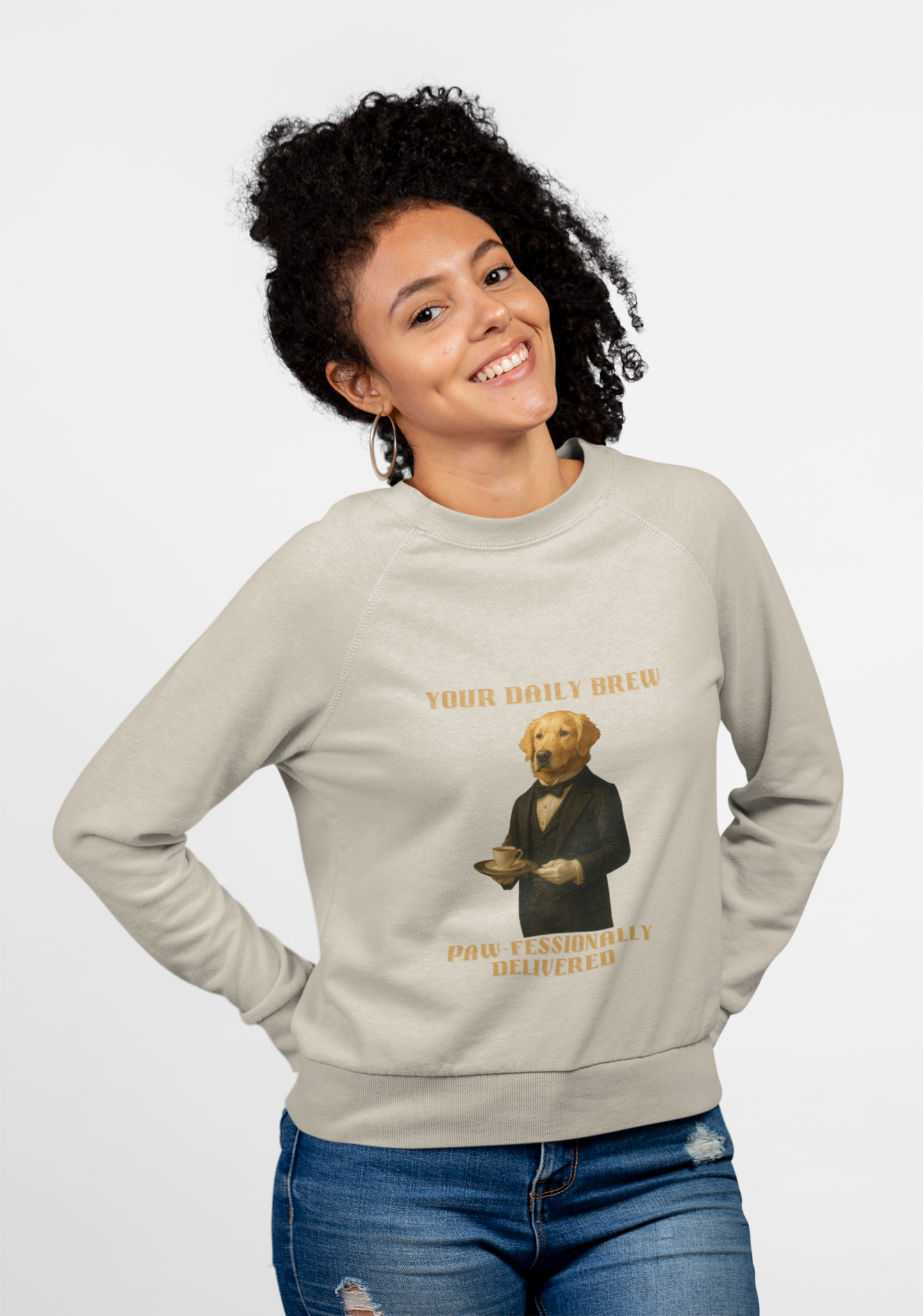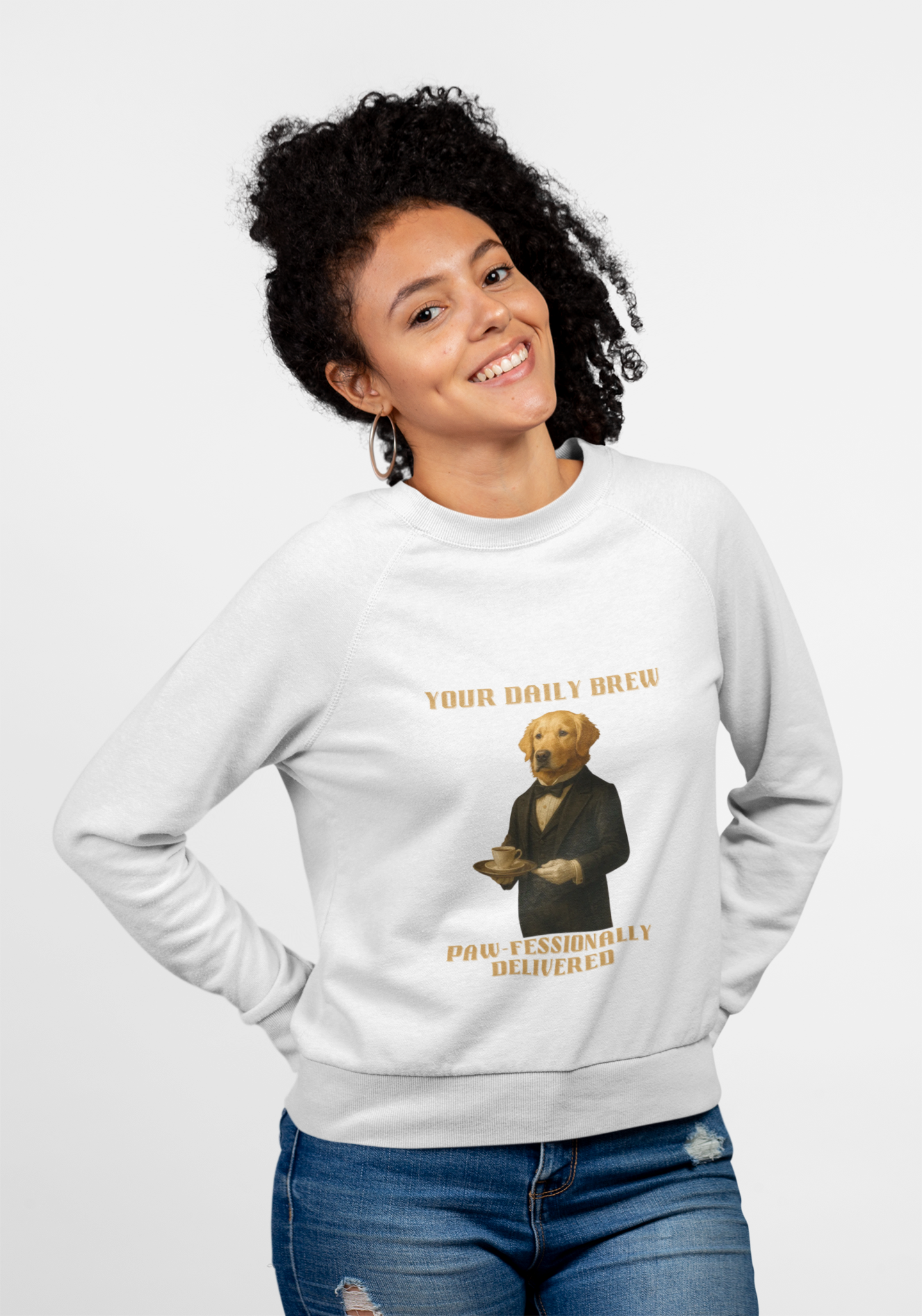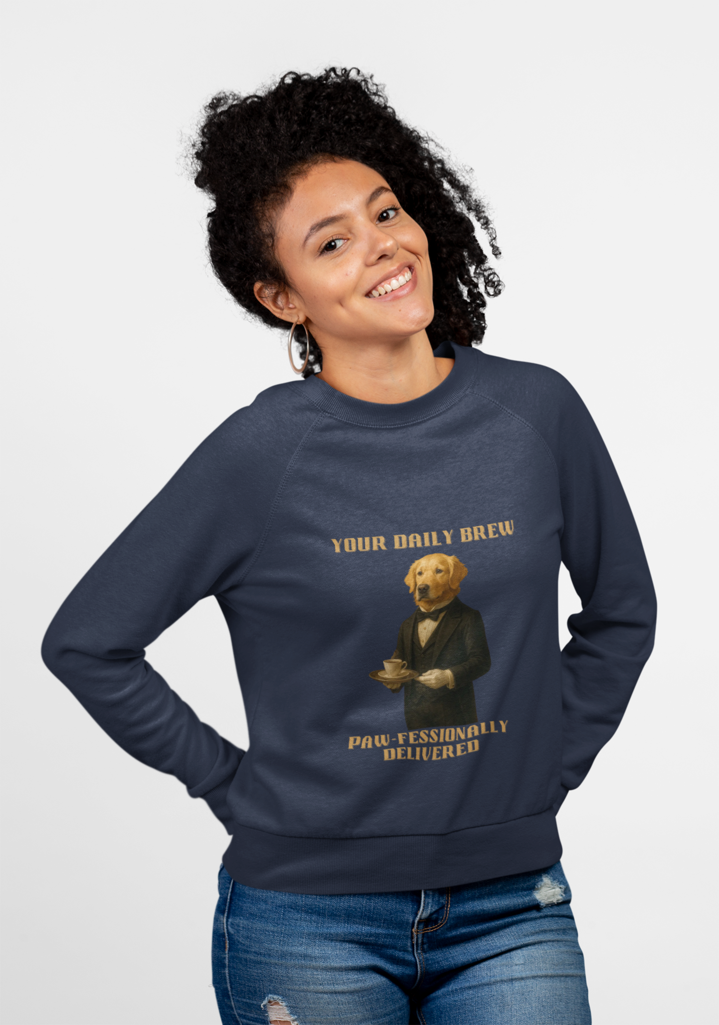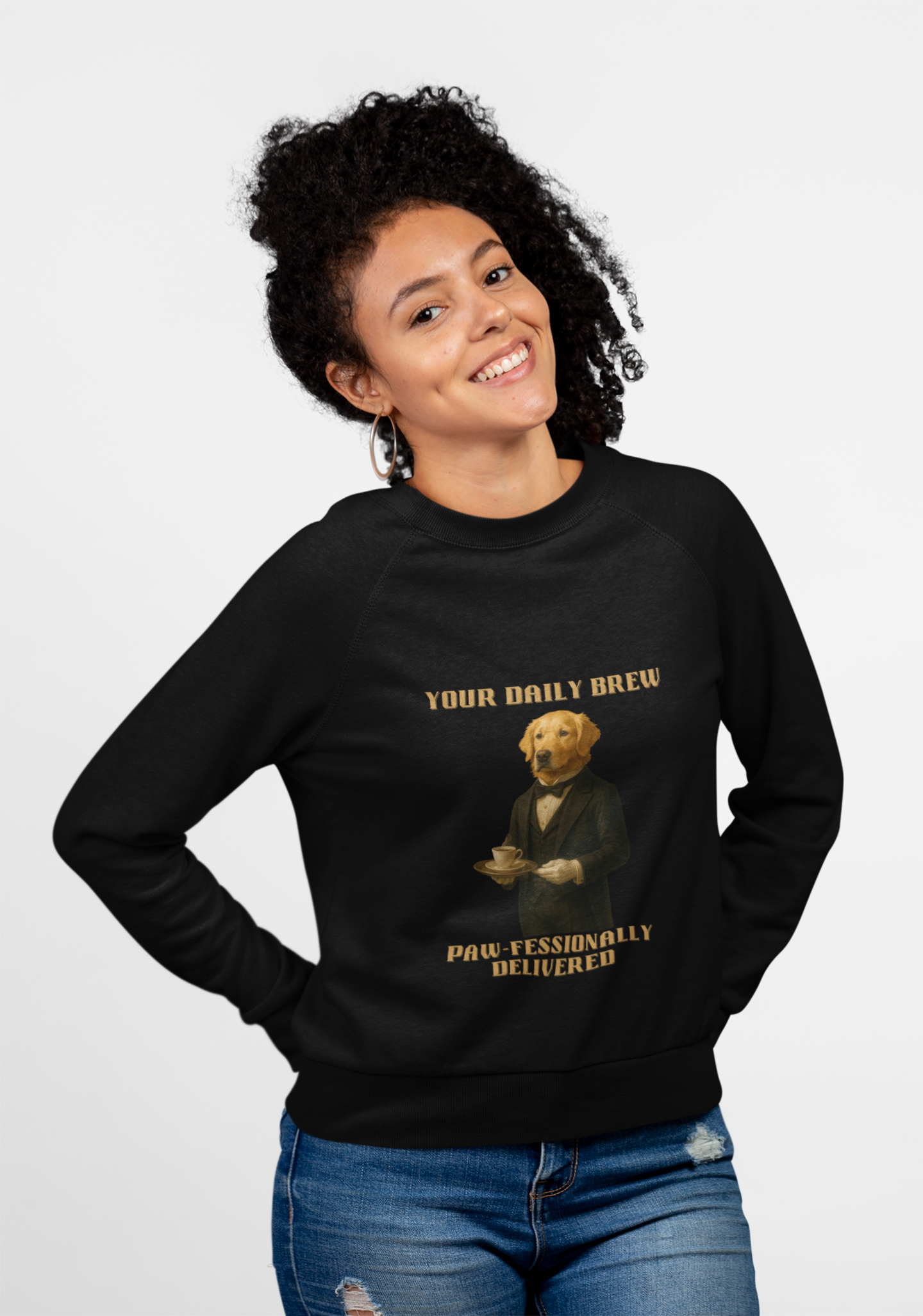 This humorous vintage-style poster features a golden retriever dressed in an elegant black tuxedo and bow tie, serving a cup of coffee on a tray. The image is a playful anthropomorphic illustration titled "Your Daily Brew" with a witty tagline "Paw-fessionally Delivered" at the bottom. The dog is depicted with a sophisticated, dignified pose, holding a tray with a delicate coffee cup and saucer, giving the impression of a refined butler or server. The artwork is rendered in a realistic, painterly style reminiscent of classical portrait paintings, with warm golden tones and detailed textures that bring the canine character to life. The typography and overall design of the poster evoke a sense of vintage elegance mixed with whimsical humor.Fantasy Dog Portraits