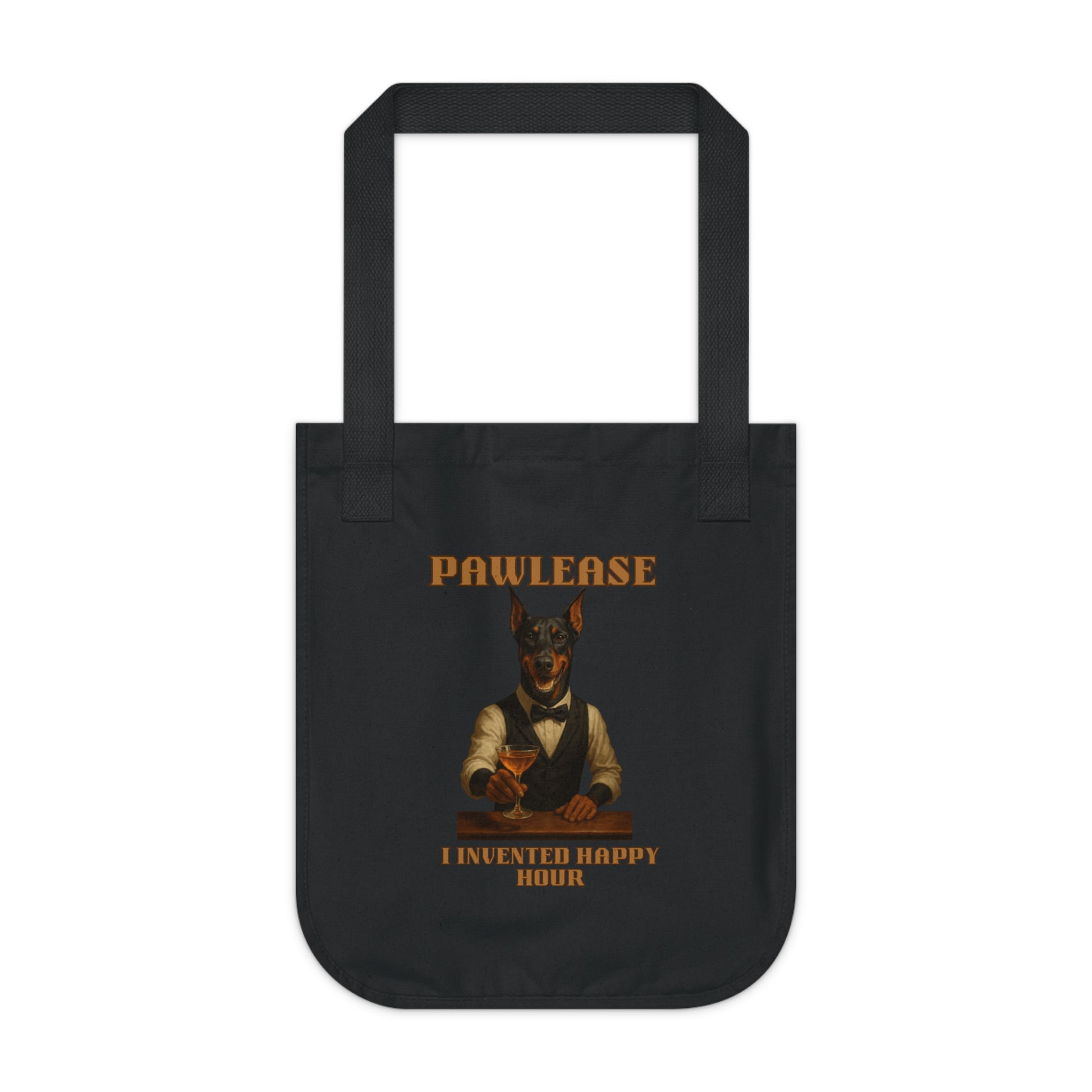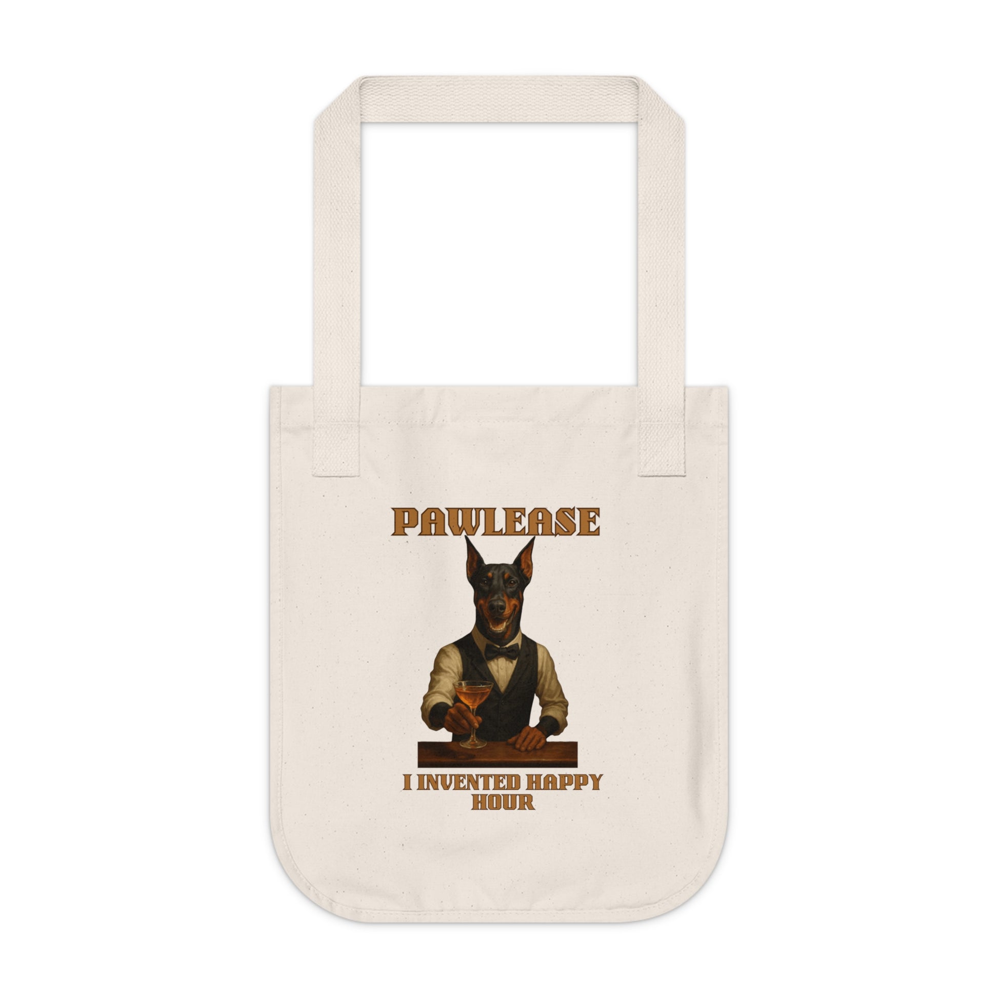 This humorous vintage-style poster features a Doberman Pinscher dressed as a sophisticated bartender, standing behind a bar and holding a cocktail glass. The image, titled "PAWLEASE I INVENTED HAPPY HOUR", depicts the dog wearing a bow tie, vest, and dress shirt, with a playful and anthropomorphic twist. The artwork is rendered in a detailed, painterly style reminiscent of classic advertising posters, with bold typography emphasizing the witty caption. The dog's expression is jovial and welcoming, with a wide smile that adds to the comedic effect of the illustration. The poster combines elements of classic bar imagery with a whimsical canine protagonist, creating a memorable and amusing visual pun.Fantasy Dog Portraits
