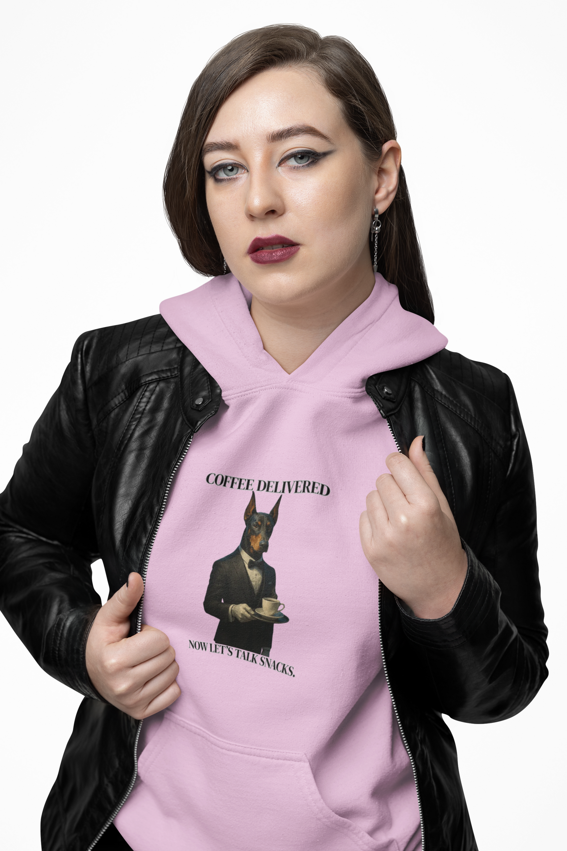This humorous graphic features a Doberman Pinscher dressed in a sophisticated white tuxedo with a bowtie, standing in a waiter's pose and holding a coffee cup and saucer. The image is titled "COFFEE DELIVERED" with a tagline below reading "NOW LET'S TALK SNACKS." The dog's head is realistically rendered, maintaining the distinctive Doberman features of pointed ears and alert expression, while its body is stylized in formal serving attire. The poster uses a graphic design approach that anthropomorphizes the dog, giving it a dignified and professional appearance as a coffee server. The typography is bold and prominent, emphasizing the playful concept of a dog delivering coffee and ready to discuss treats.Fantasy Dog Portraits