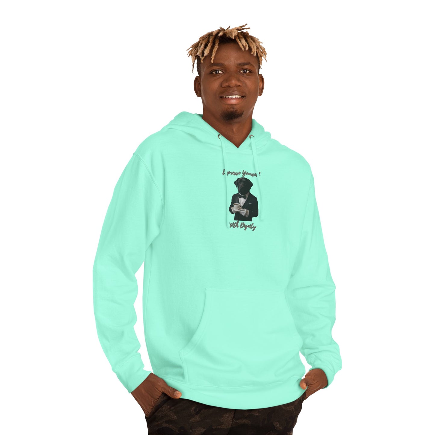 The image showcases a playful and sophisticated digital illustration of a dog dressed in a formal tuxedo with a bow tie, holding a pristine white espresso cup and saucer. The artwork features a stylized black and white portrait of what appears to be a Labrador retriever, with half of the dog's head rendered in a realistic style and the other half in a more graphic, high-contrast approach. The text "Espresso Yourself" is displayed at the top of the image, while "With Dignity" appears at the bottom, emphasizing the humorous yet dignified theme of the composition. The dog's attire and pose suggest a refined, almost human-like demeanor, creating a witty anthropomorphic representation. The image blends photographic elements with digital art techniques to create a visually striking and amusing portrait.Fantasy Dog Portraits