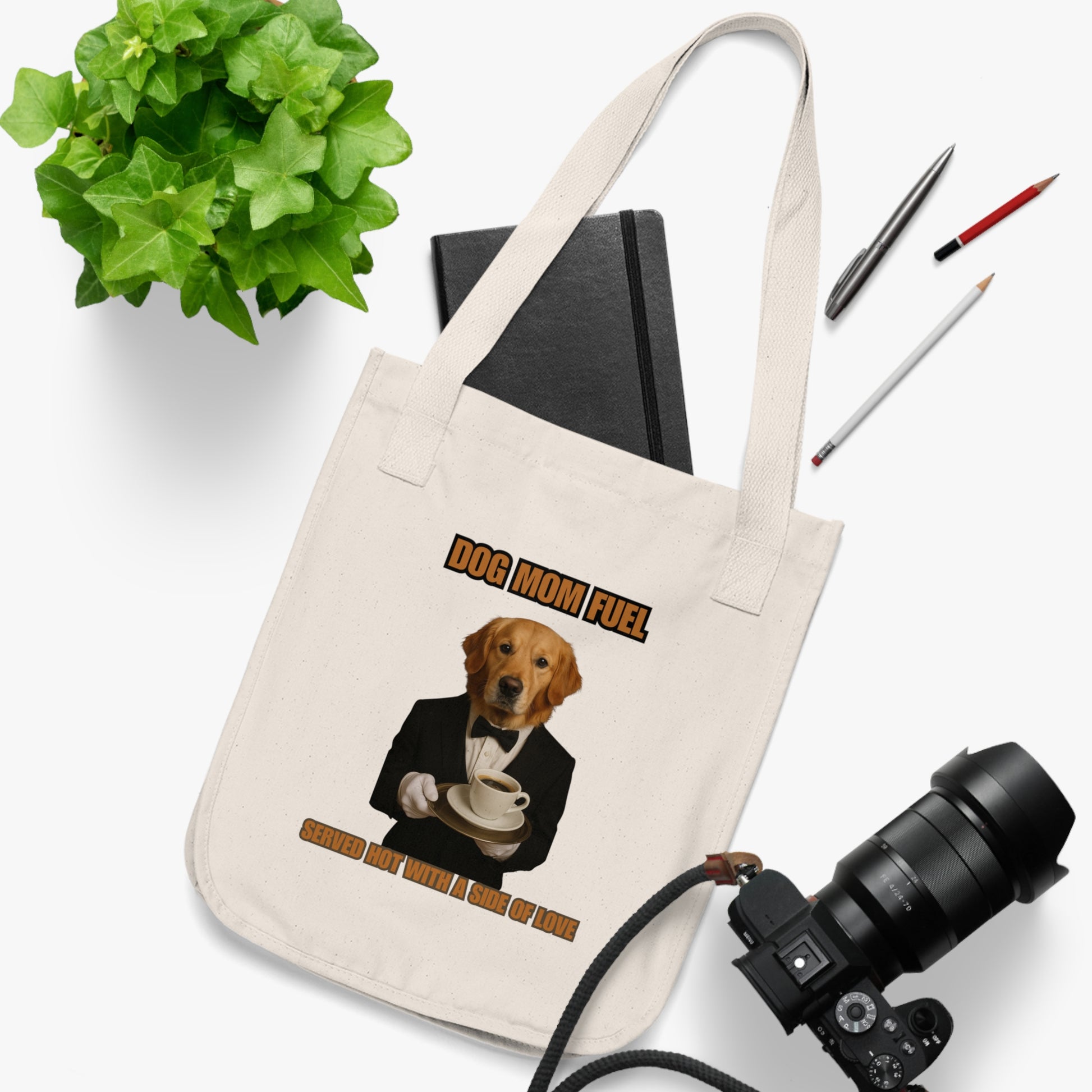 The image is a humorous, stylized portrait of a Golden Retriever dressed in a formal black tuxedo with a bow tie, presenting a cup of coffee. The dog is wearing white gloves and holding a white coffee cup on a saucer, giving the impression of an elegant server or waiter. The background is plain white, focusing attention on the well-groomed dog and its sophisticated attire. Text above and below the image reads "DOG MOM FUEL" and "SERVED HOT WITH A SIDE OF LOVE" in a golden, serif font. The photographic style is clean and crisp, with the dog positioned in a professional, portrait-like manner that adds to the comedic effect of the anthropomorphic presentation.Fantasy Dog Portraits