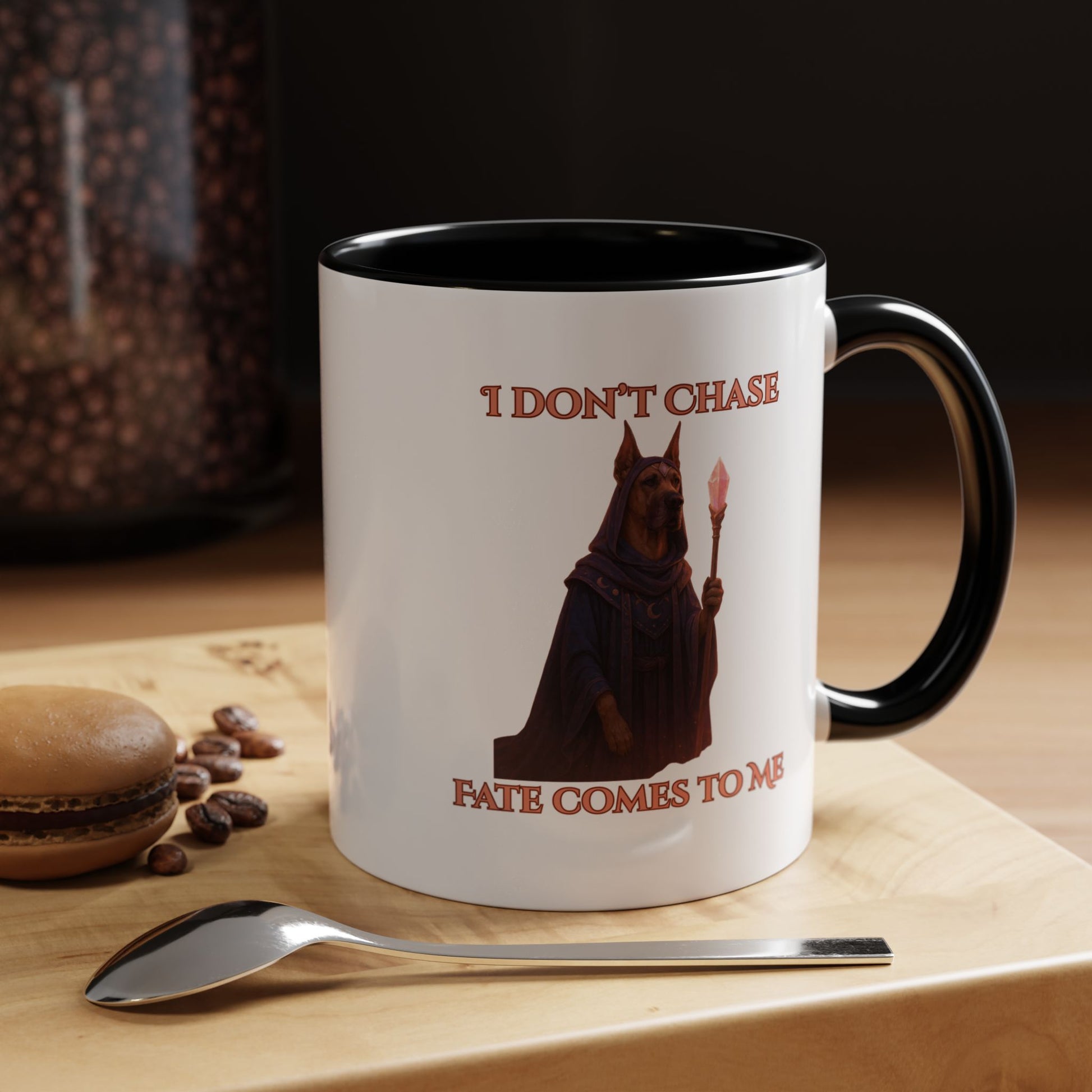 Immerse yourself in the mystical world of this captivating digital artwork featuring a majestic dog transformed into a powerful wizard. Draped in a deep purple robe adorned with celestial moon symbols, the canine sorcerer stands confidently against a black background. The image is dramatically enhanced by glowing red text that reads "I DON'T CHASE, FATE COMES TO ME," adding an air of mystical defiance and supernatural power. The dog, wearing a hooded cloak, grips a luminescent pink crystal staff, symbolizing magical prowess and otherworldly knowledge. Its pose suggests wisdom, strength, and an unshakeable connection to mystical forces beyond ordinary perception. The artwork brilliantly blends fantasy elements with anthropomorphic representation, creating a striking visual narrative that challenges traditional expectations. The color palette of deep purples, blues, and glowing red text creates a sense of mysterious energy and supernatural potential. This image appears to be a meme or motivational artwork that reimagines a dog as a powerful magical being, subverting typical animal imagery. The detailed rendering and imaginative concept make this piece a standout example of digital fantasy art that merges animal characteristics with mythical storytelling. It's a powerful visual metaphor for inner strength, destiny, and the idea that true power comes from within.