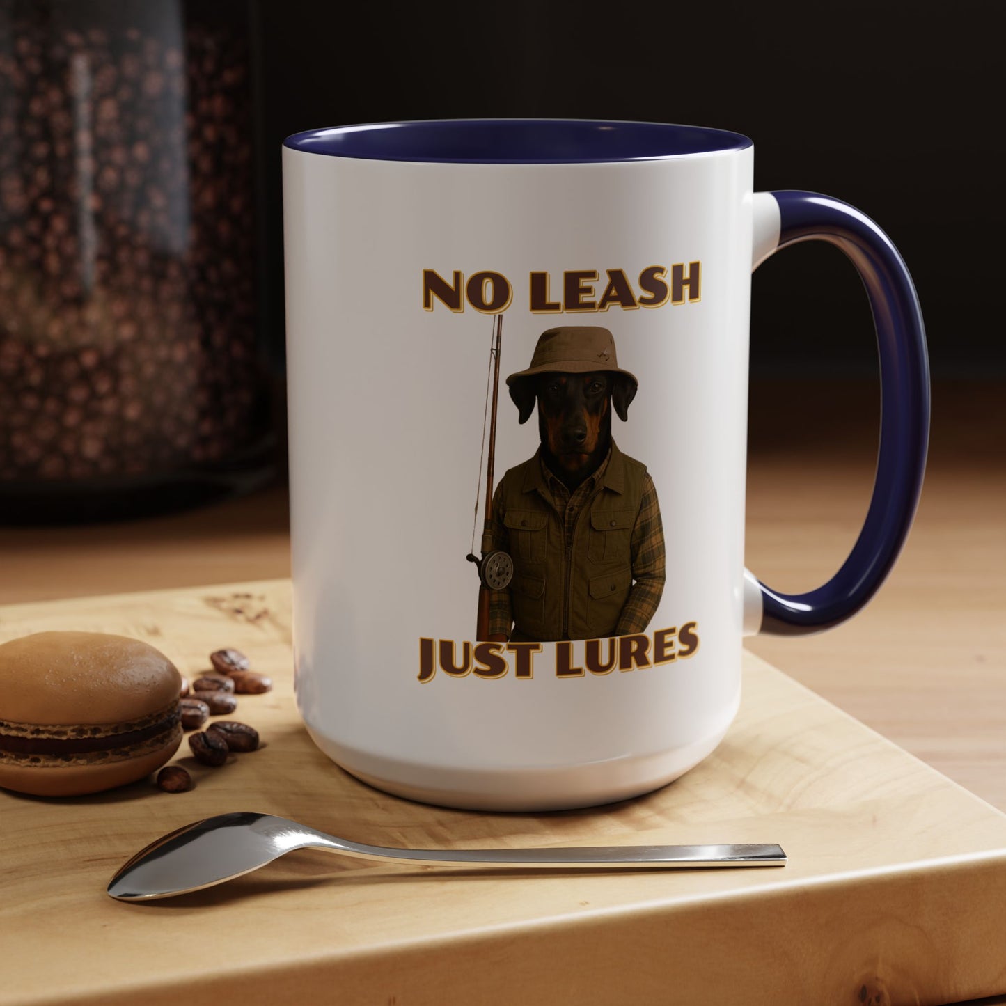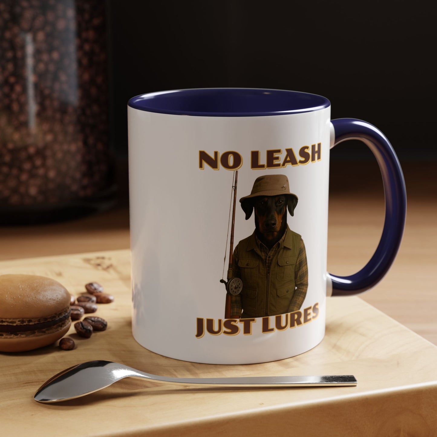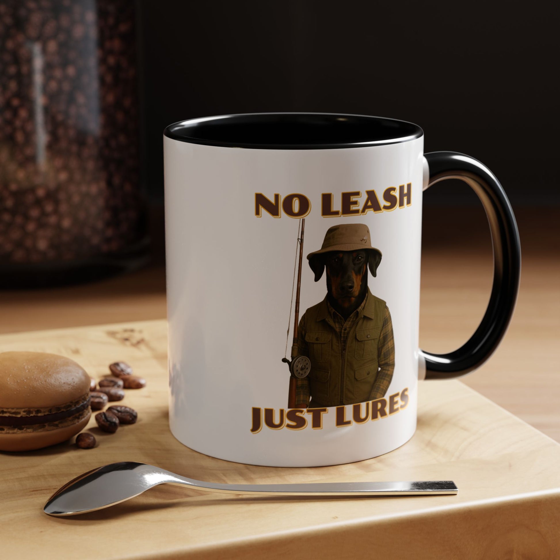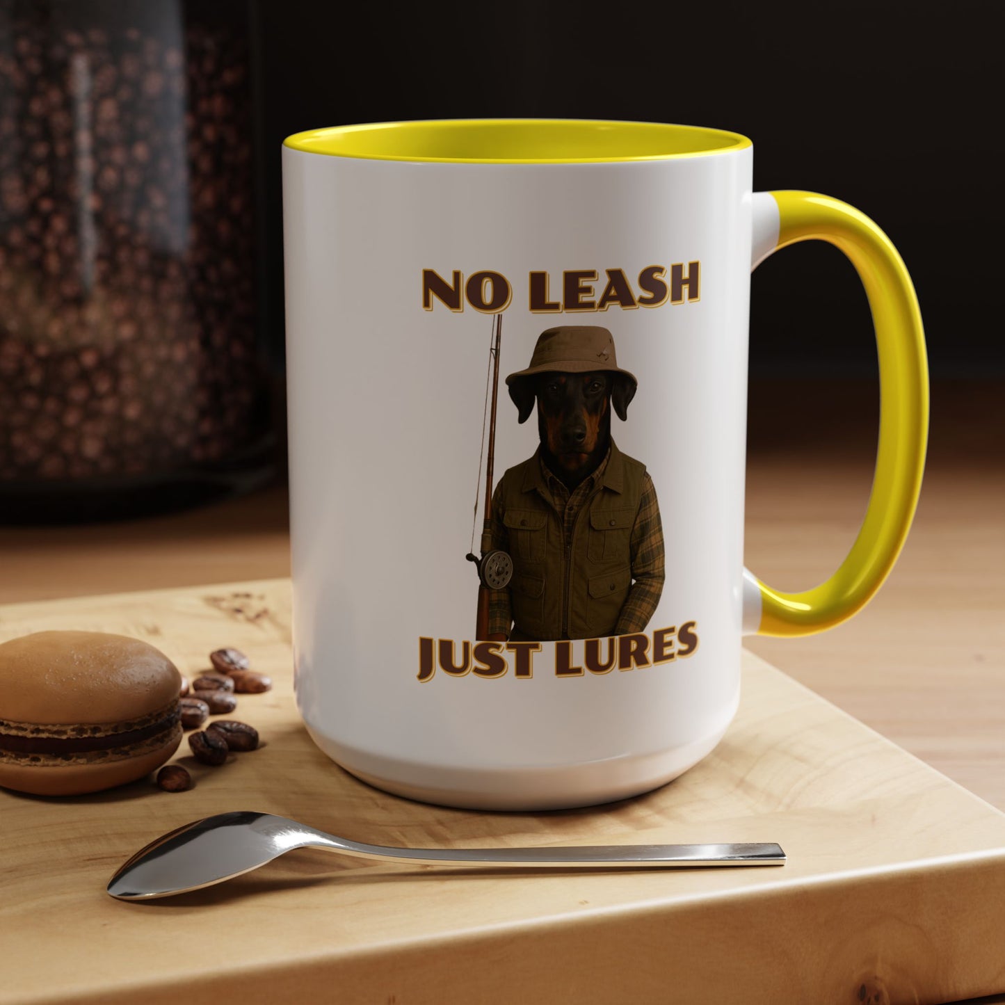 Dive into the humorous world of canine adventure with this witty poster featuring a Doberman dressed as a seasoned fishing enthusiast. The image showcases a dog wearing a classic outdoor outfit, complete with a khaki bucket hat, plaid flannel shirt, and utility vest, holding a fishing rod against a black background. Bold yellow text proclaims "NO LEASH" at the top and "JUST LURES" at the bottom, creating a playful pun that will make dog lovers and fishing enthusiasts chuckle. The dog's serious expression contrasts perfectly with the comedic costume, giving the poster an irresistible charm that speaks to both pet owners and outdoor recreation fans. The carefully crafted photomontage blends animal portraiture with human clothing in a seamless and amusing way, highlighting the creativity of modern digital art. The color palette of olive greens, tans, and yellows evokes a classic outdoor aesthetic, while the high-contrast black background makes the image pop. This poster would make a fantastic conversation piece for a rec room, man cave, or anyone who appreciates clever animal-themed humor. The attention to detail in the dog's outfit and pose suggests a professional approach to this whimsical concept. Perfect for those who love fishing, dogs, or simply enjoy a good visual joke, this image is sure to bring a smile to viewers' faces. The poster successfully transforms a typical hunting/fishing theme into a delightful piece of anthropomorphic art.