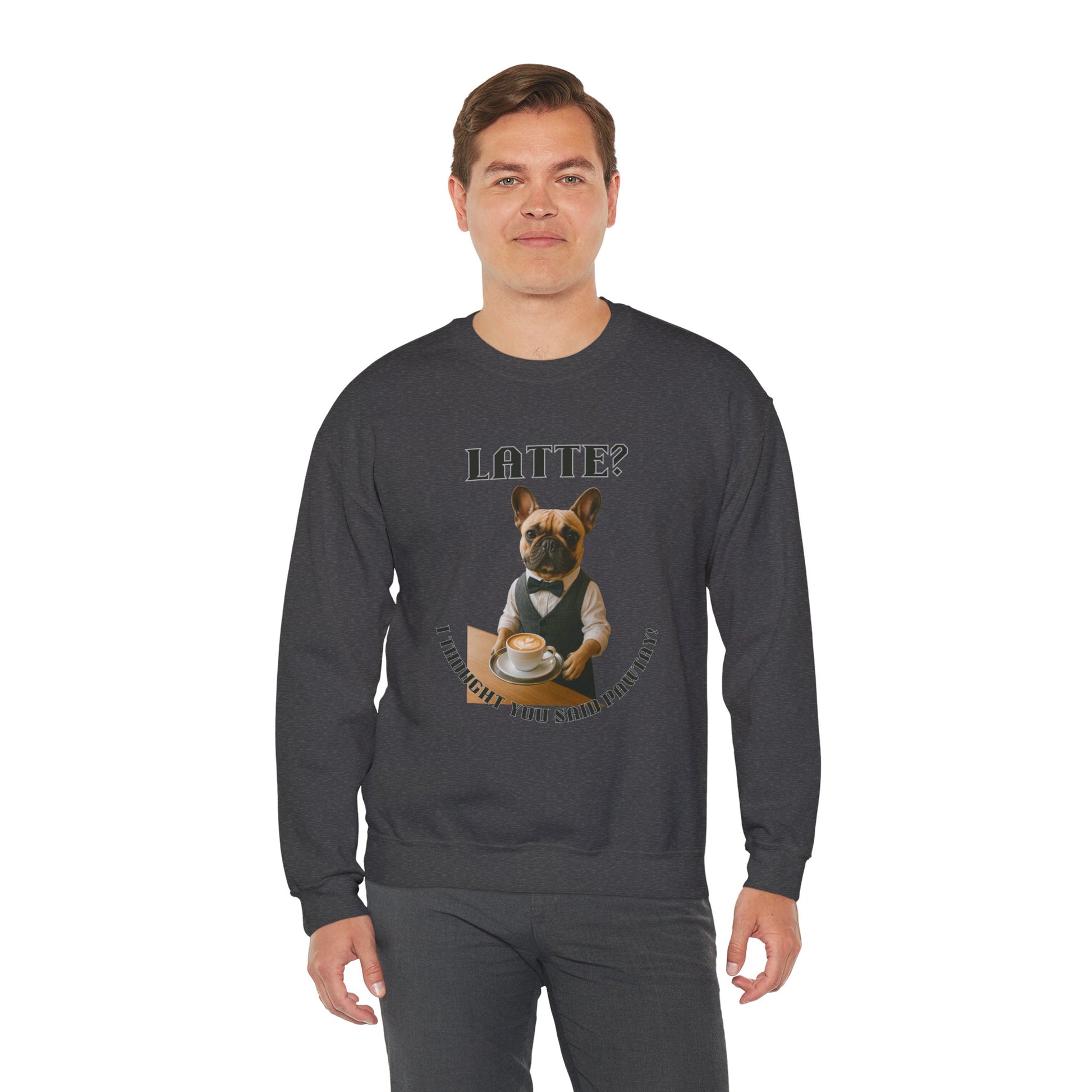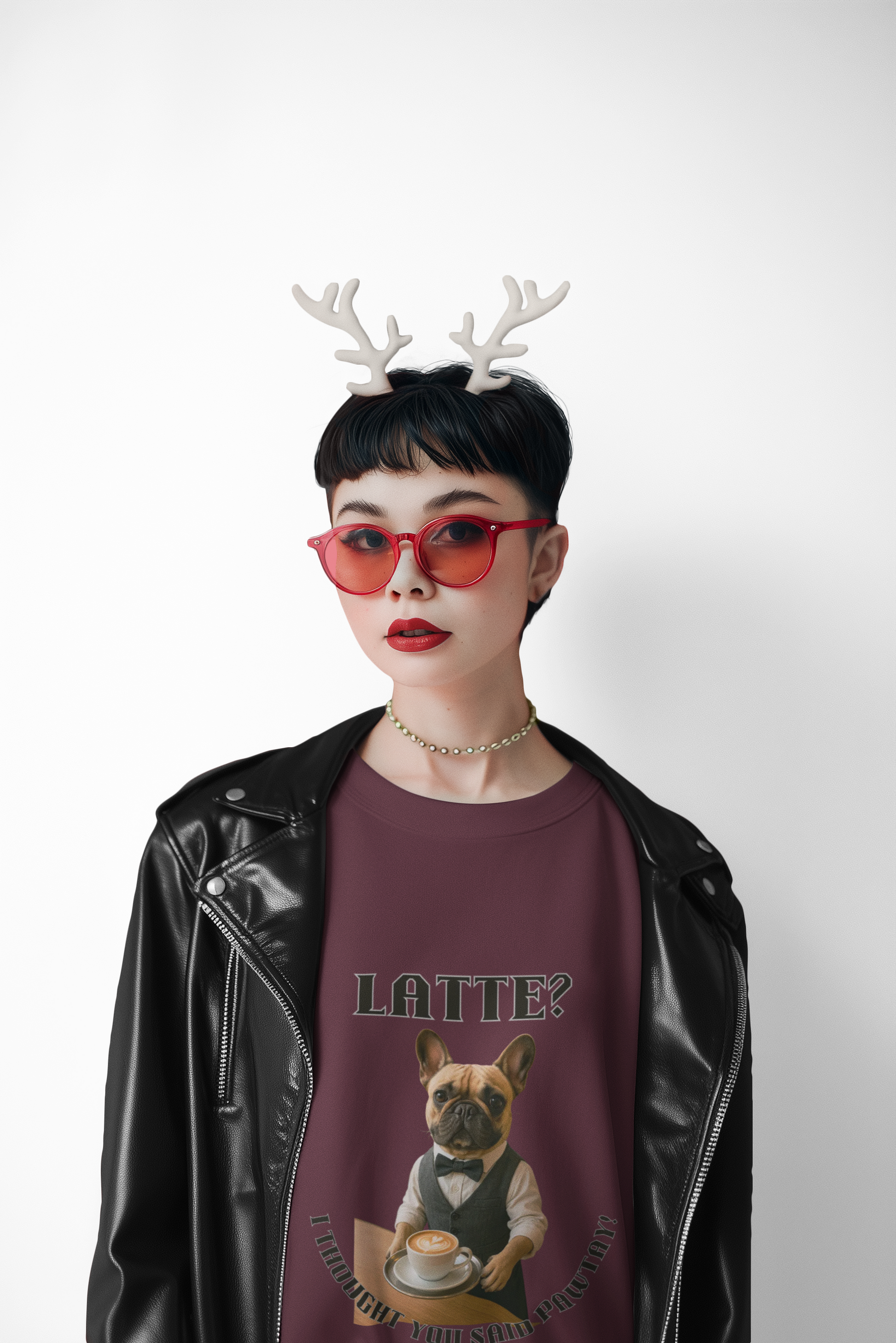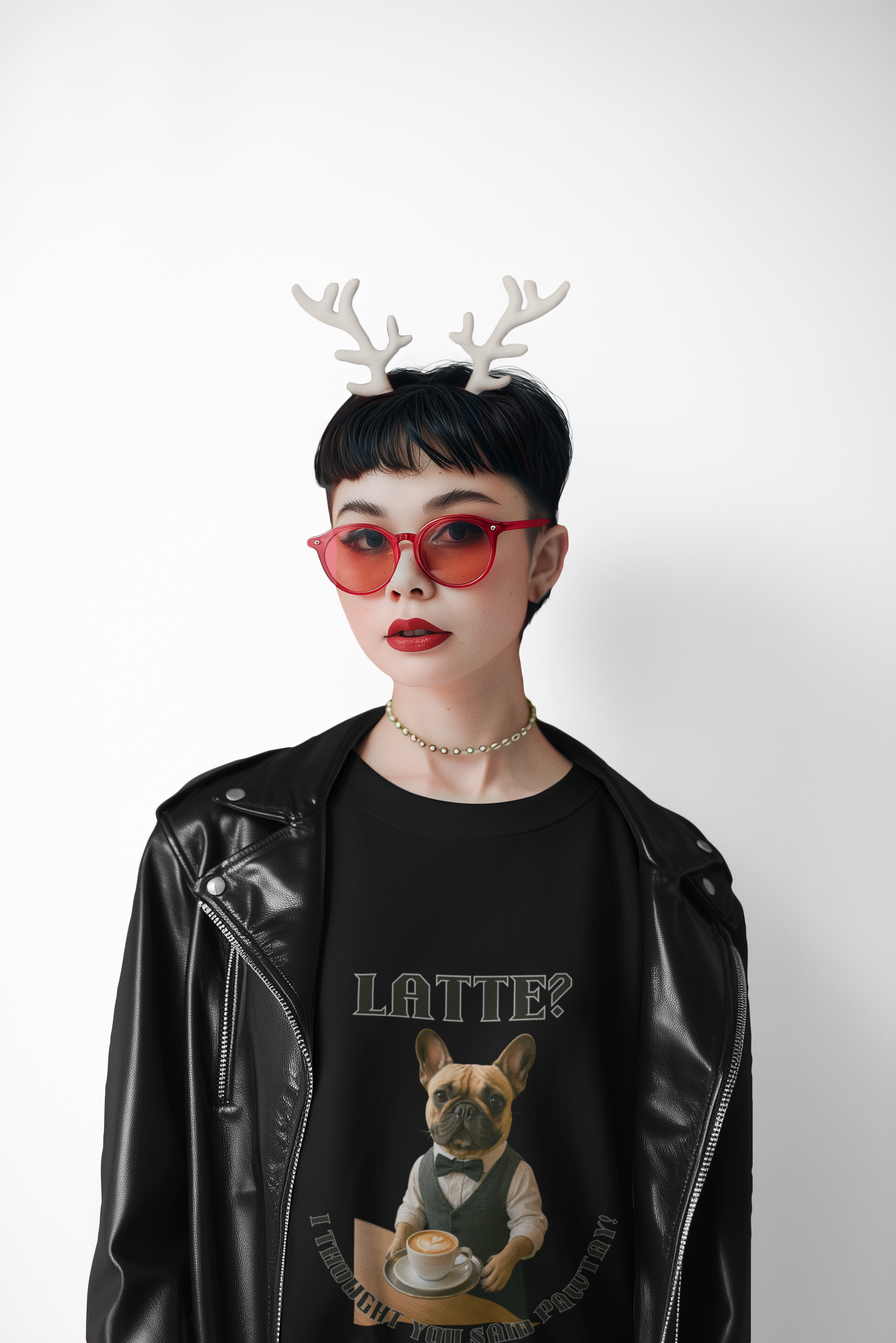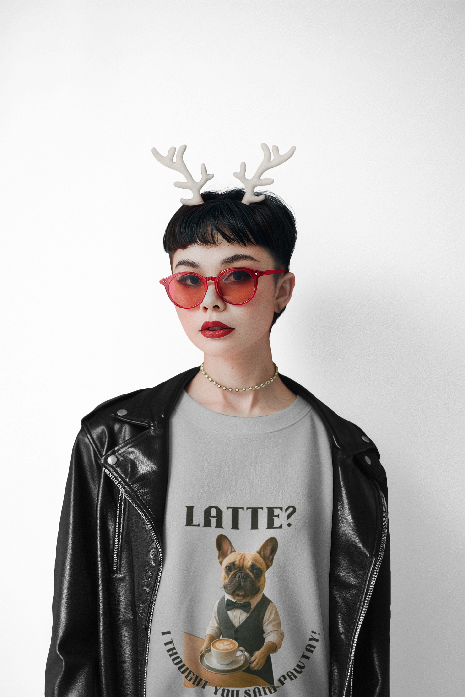 This whimsical image features a French Bulldog dressed as a sophisticated barista, wearing a gray vest, white shirt, and black bow tie. The dog is holding a wooden tray with an artfully prepared latte, complete with intricate latte art in the cup. The text "LATTE?" is prominently displayed at the top of the image, with a curved text at the bottom reading "I THOUGHT YOU SAID PAWLATTE!" The photograph has a clean, professional studio-style aesthetic with a white background, highlighting the dog's charming and humorous pose. The image is a clever play on words, combining coffee culture with dog-themed humor in a visually striking and entertaining composition.Fantasy Dog Portraits