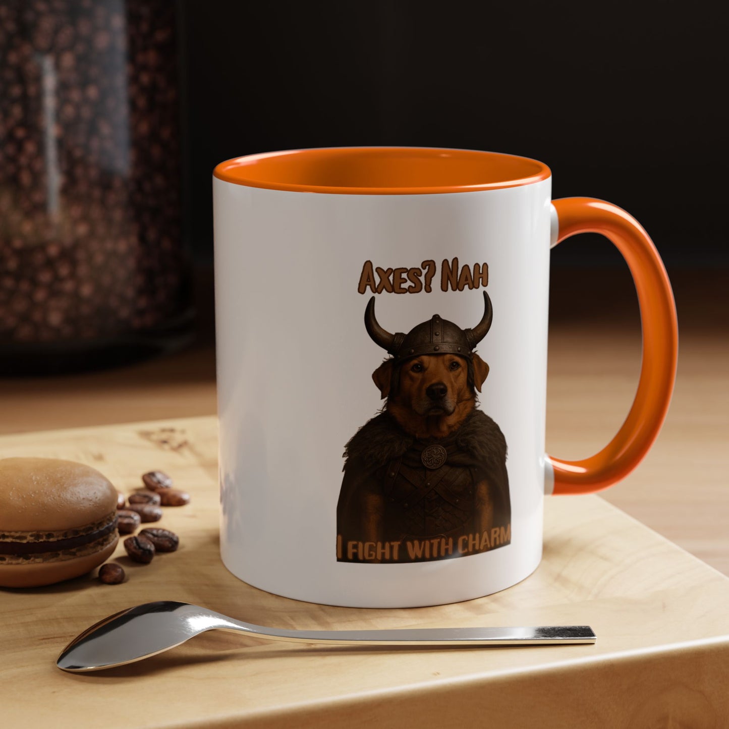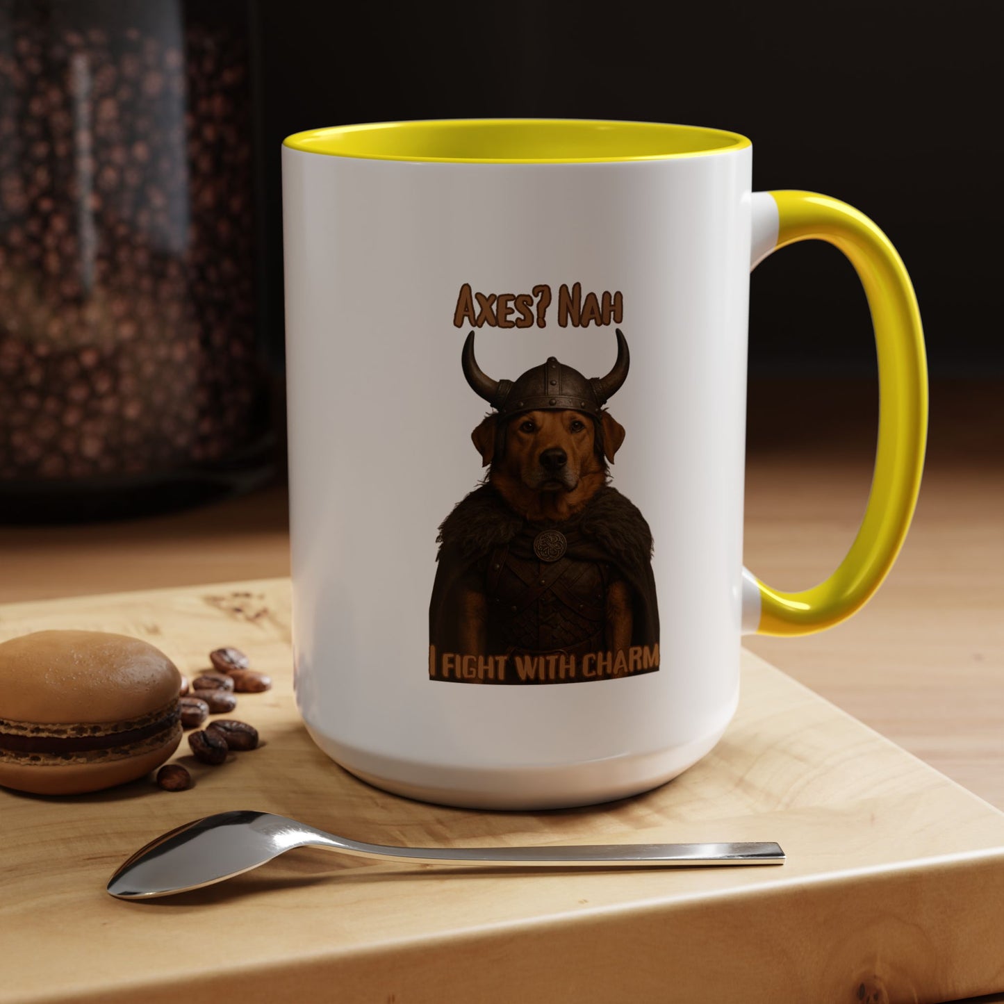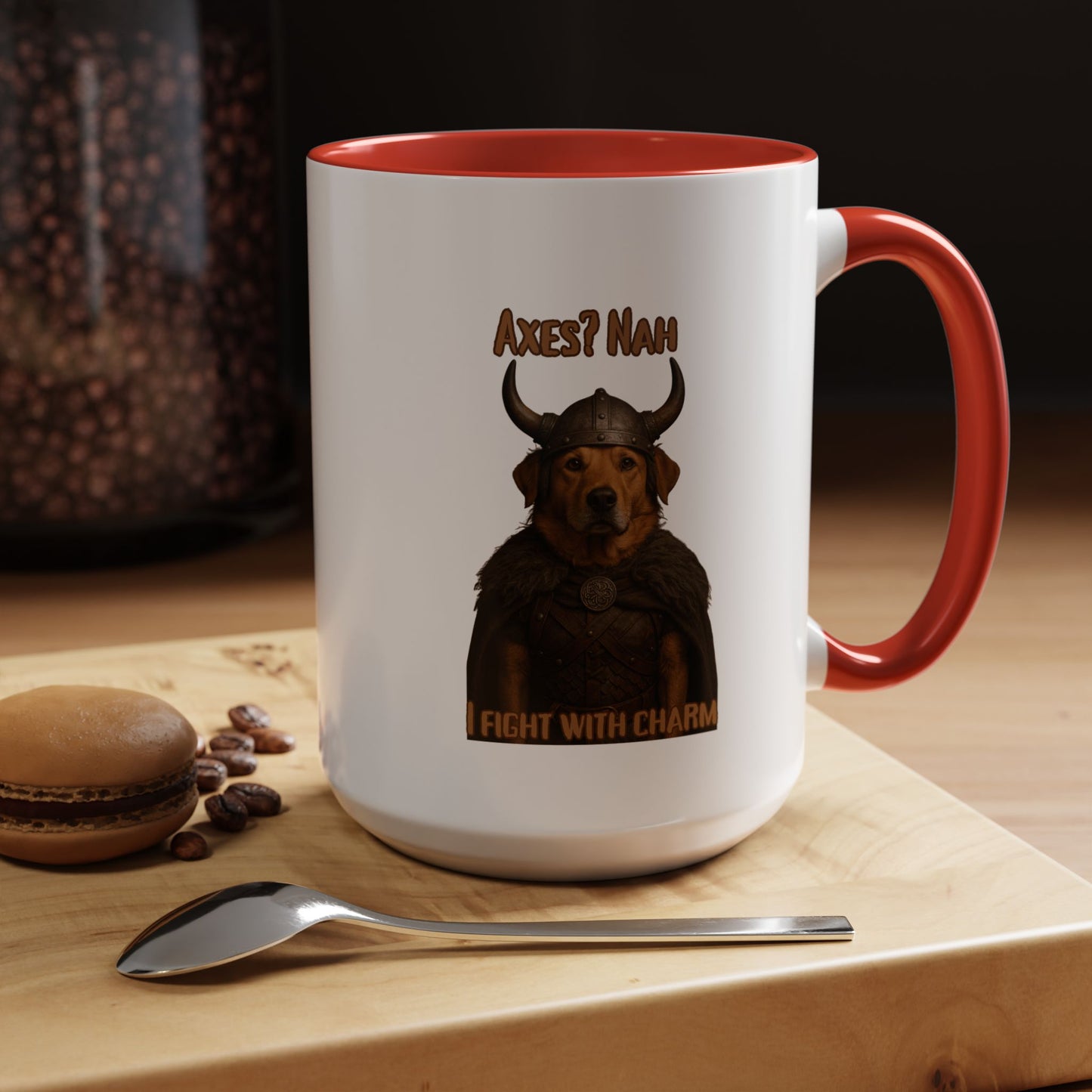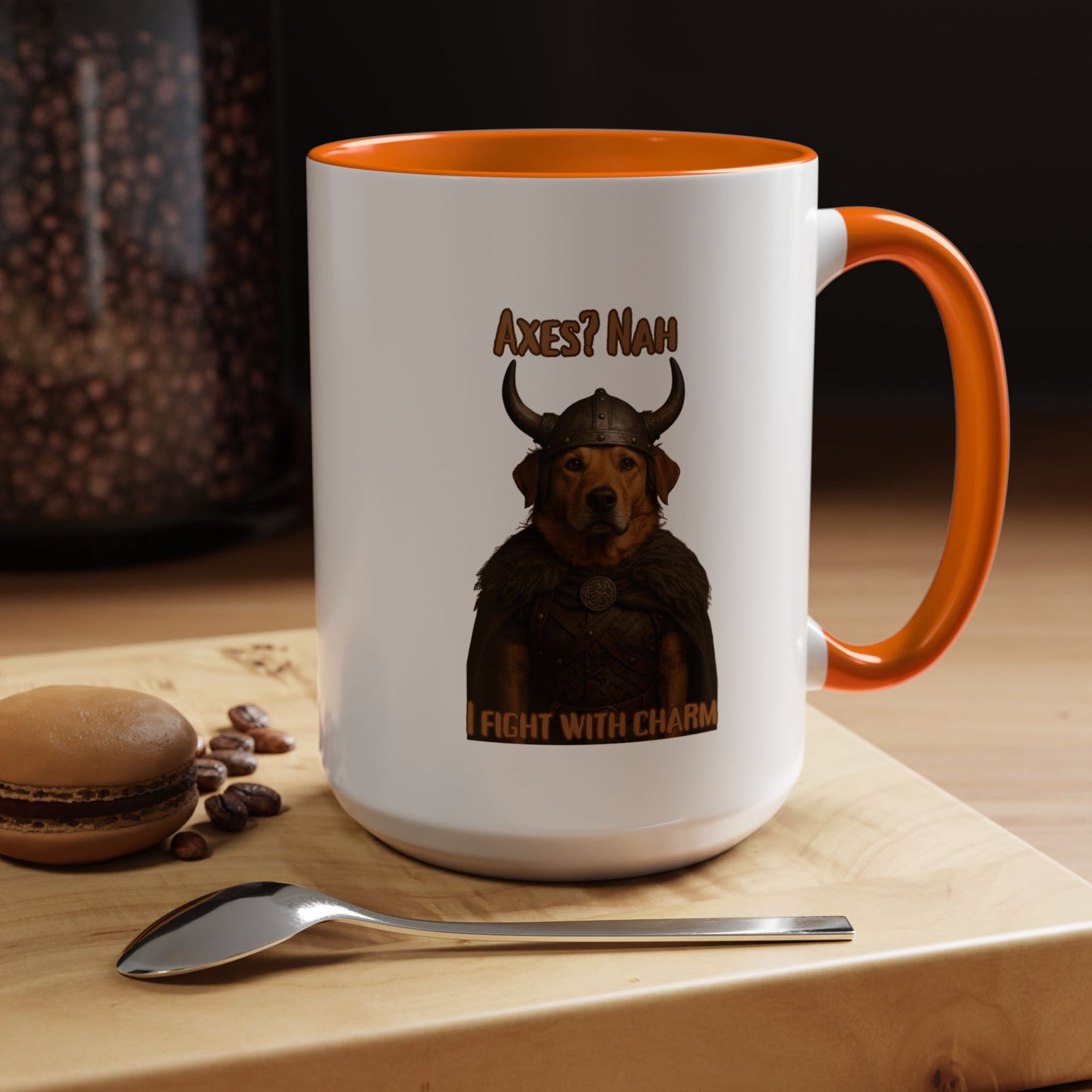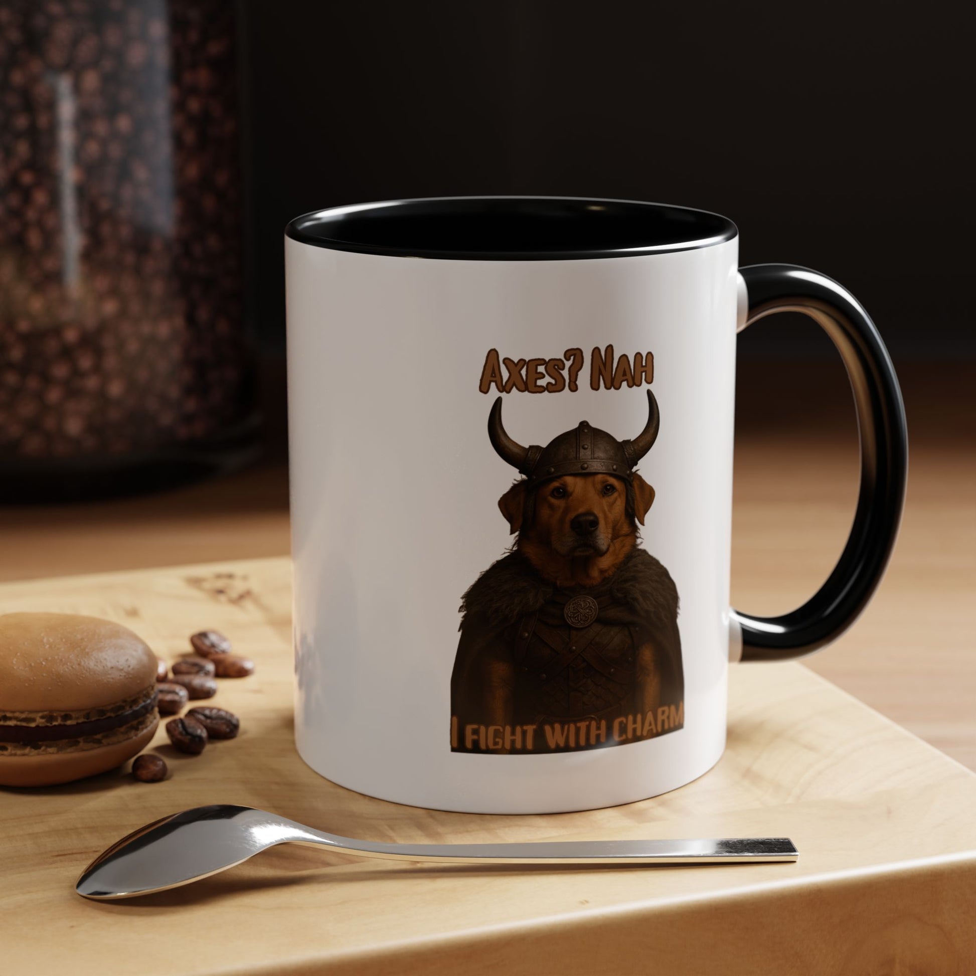 Discover the ultimate fusion of canine charm and Viking swagger in this hilarious, meticulously crafted portrait of a golden retriever transformed into a medieval warrior. Adorned in a classic horned Viking helmet and a rugged fur-lined cape, this charismatic canine strikes a pose that's equal parts adorable and fierce. The dog's expressive eyes and stoic demeanor perfectly complement the witty text overlay reading "AXES? NAH, I FIGHT WITH CHARM" - a playful twist on traditional Viking imagery. The high-contrast black background highlights every intricate detail of the dog's costume, from the textured metallic helmet to the intricately designed leather armor. This viral-worthy image seamlessly blends humor, fantasy, and pet photography, creating a meme-worthy masterpiece that will resonate with dog lovers, history enthusiasts, and comedy fans alike. The carefully constructed costume transforms an ordinary golden retriever into an extraordinary Viking warrior, complete with a Celtic-inspired medallion and layered armor. Professional lighting and expert photo editing bring out the rich golden tones of the dog's fur, creating a striking visual that demands attention. The clever wordplay and unexpected juxtaposition of a cute dog in fierce warrior attire make this image both endearing and memorable. Perfect for social media sharing, this photo captures the imagination and brings a smile to viewers of all ages. Whether you're a dog lover, a fan of historical humor, or simply appreciate creative photography, this Viking dog portrait is sure to charm and delight.