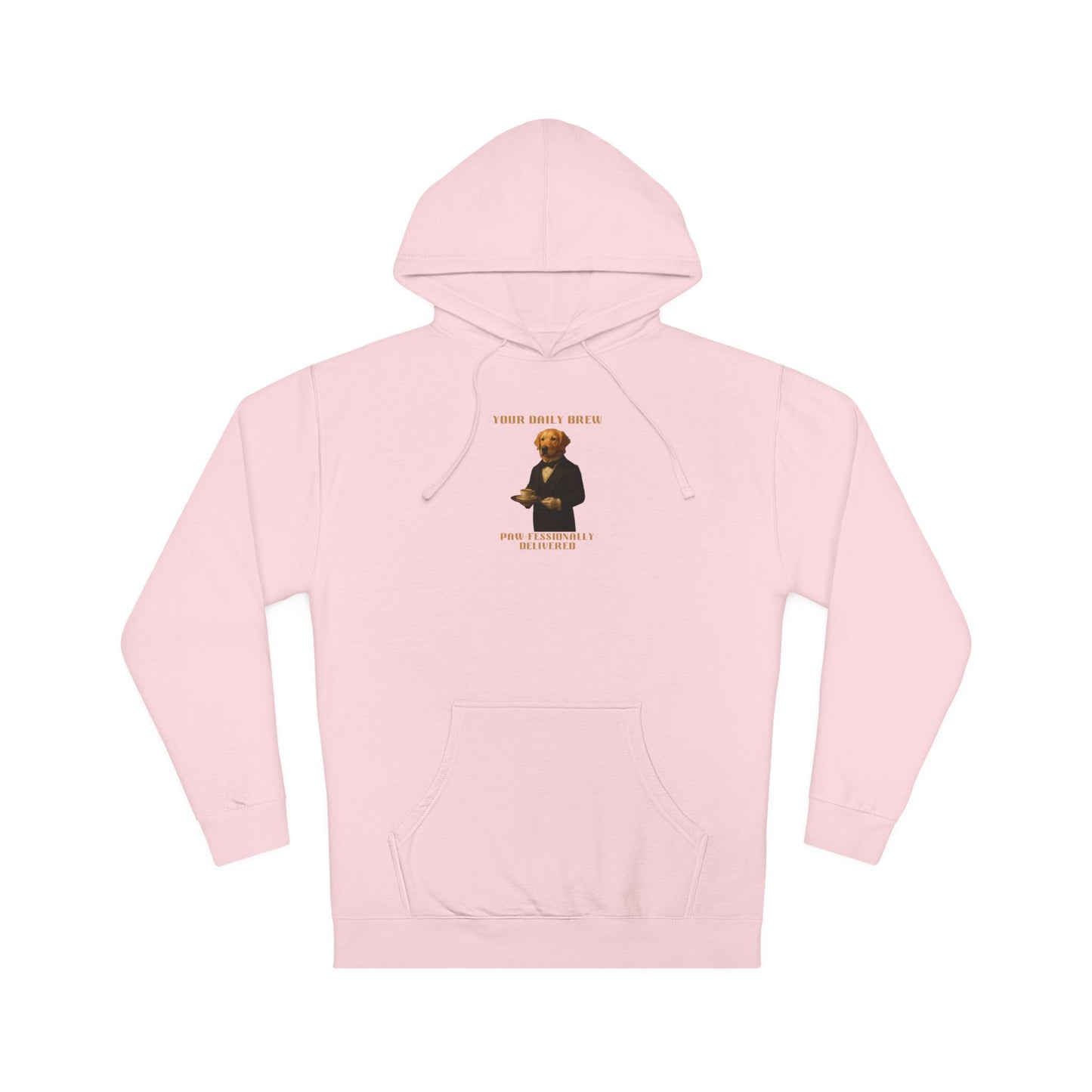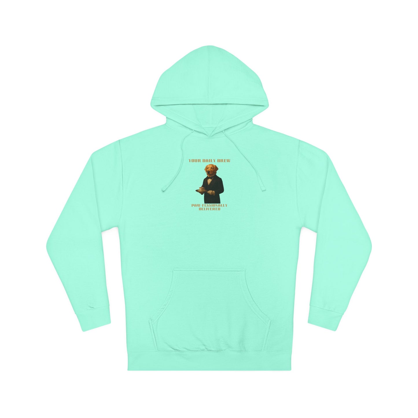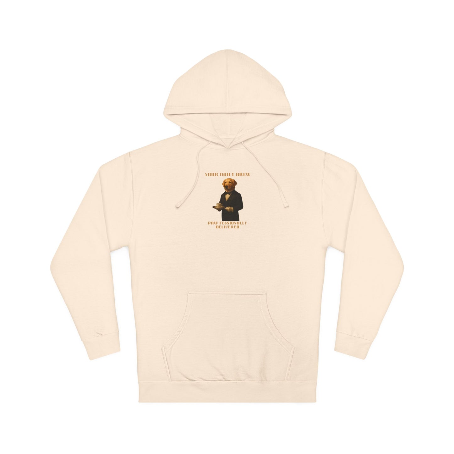 Discover "Your Daily Brew" with this whimsical, professionally styled poster featuring an anthropomorphic Golden Retriever dressed in an elegant white tuxedo and black bow tie. The sophisticated canine waiter holds a delicate coffee cup and saucer, embodying the playful concept of "Paw-fessionally Delivered" coffee service. The image blends photorealistic artwork with a humorous twist, depicting the dog as a refined server ready to present the morning's caffeine fix. Stylized golden typography emphasizes the clever wordplay and professional demeanor of the canine character. The poster combines humor, artistic illustration, and a playful take on gourmet coffee service into a single, eye-catching design.Fantasy Dog Portraits