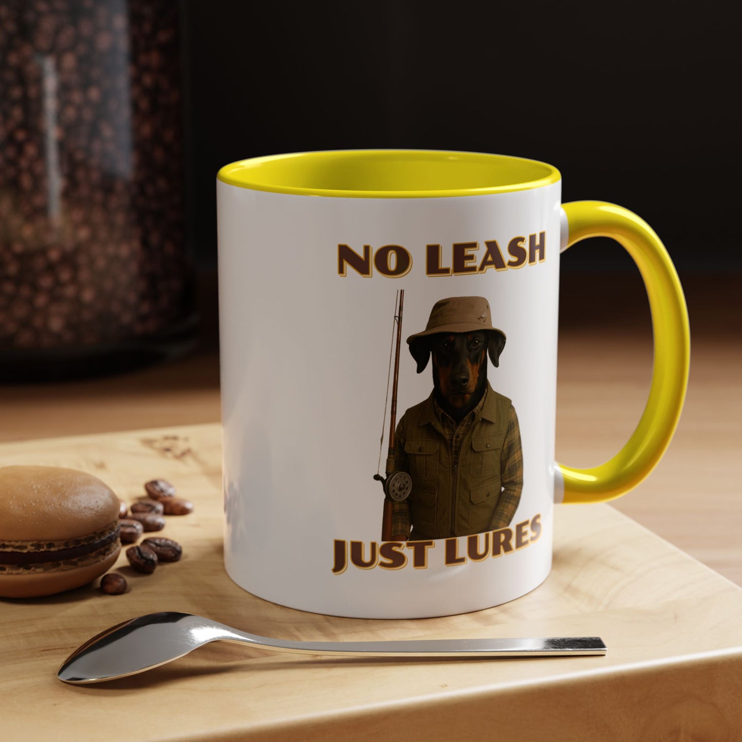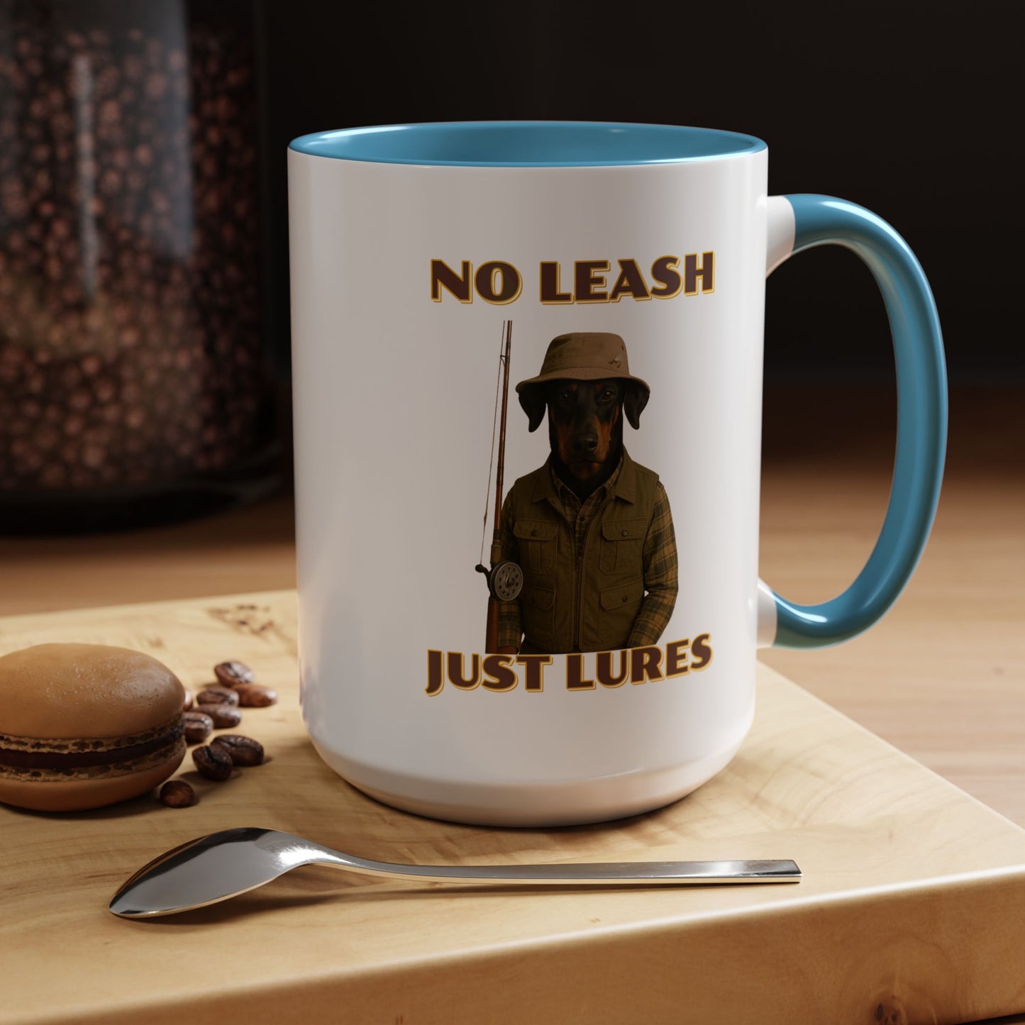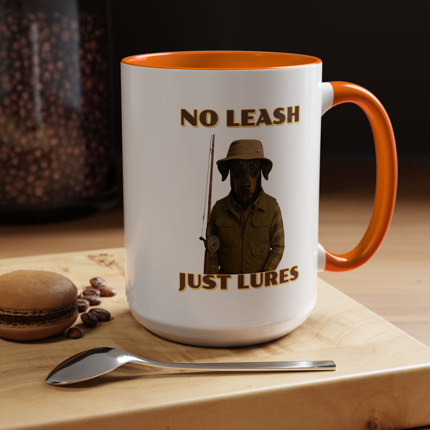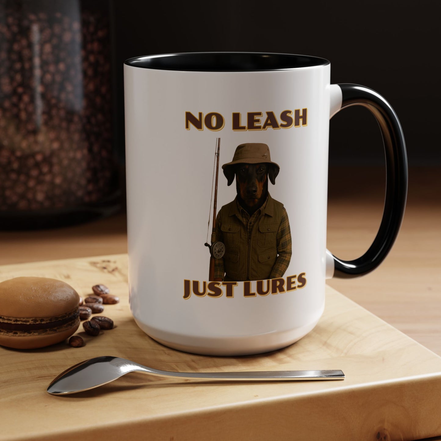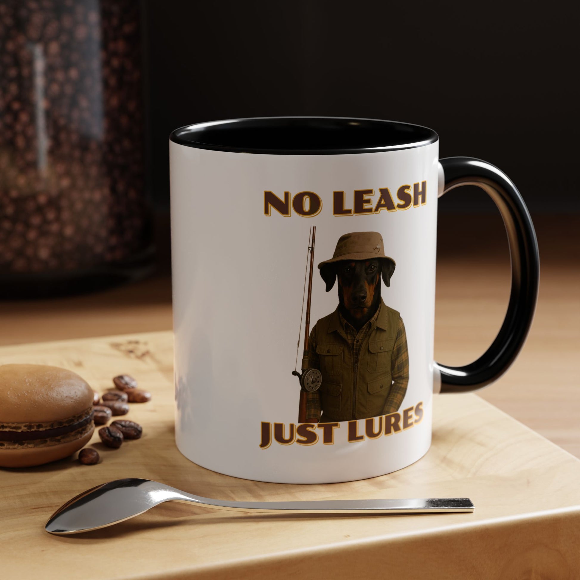 This humorous vintage-style poster features a black and tan dog dressed as an outdoorsman, wearing a khaki bucket hat, plaid flannel shirt, and fishing vest, holding a fishing rod against a black background. The image is a playful parody of hunting and fishing culture, with bold yellow text reading "NO LEASH" at the top and "JUST LURES" at the bottom. The dog appears serious and stoic, embodying the stereotypical rugged sportsman aesthetic with its carefully styled outfit and professional pose. The graphic design mimics classic outdoor adventure posters, complete with a nostalgic color palette and retro typography that gives the image a timeless, tongue-in-cheek appeal. The dog's breed looks like a Doberman or similar short-haired breed, and its expression suggests a no-nonsense attitude typical of seasoned anglers and hunters. The photoshopped combination of a dog's head with human clothing creates a comical visual that plays on the idea of anthropomorphized animals and outdoor recreation stereotypes. The poster's high-contrast design and witty concept make it a memorable piece of humorous art that would likely appeal to dog lovers, fishing enthusiasts, and those who appreciate quirky visual humor. The detailed costume and professional photography elevate the image from a simple meme to a sophisticated piece of comedic graphic design. The clever wordplay in the text "No Leash, Just Lures" adds an extra layer of humor to the already amusing image. Overall, the poster successfully blends comedy, nostalgia, and creative visual storytelling in a single, eye-catching composition.