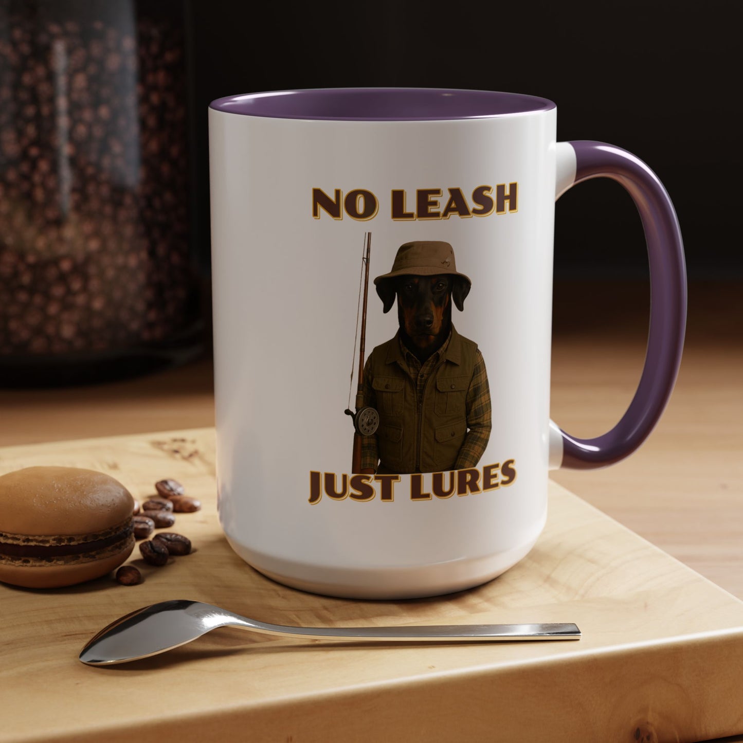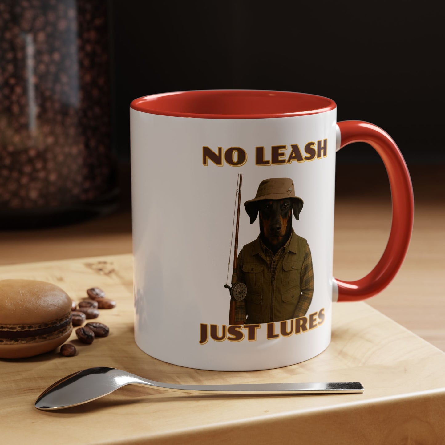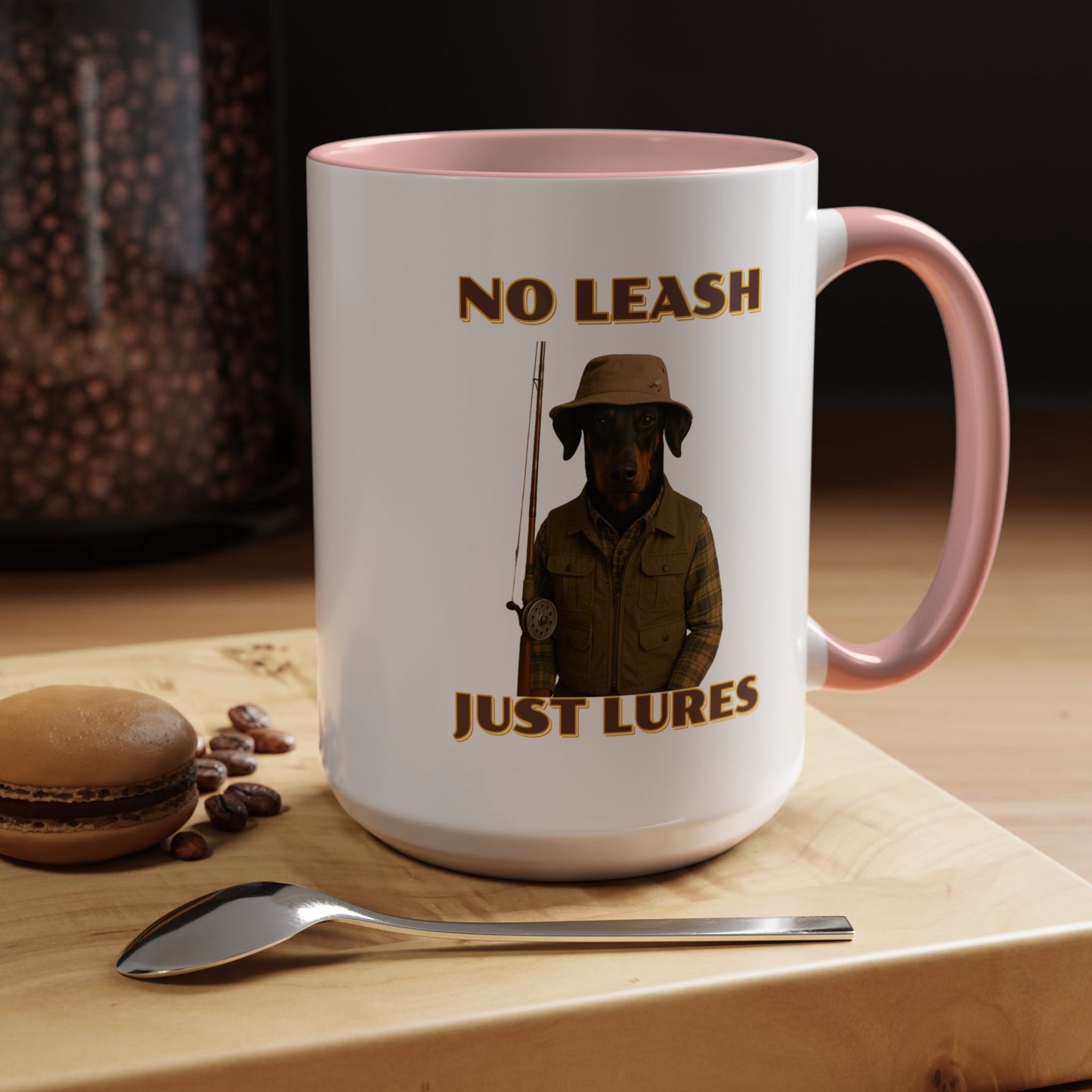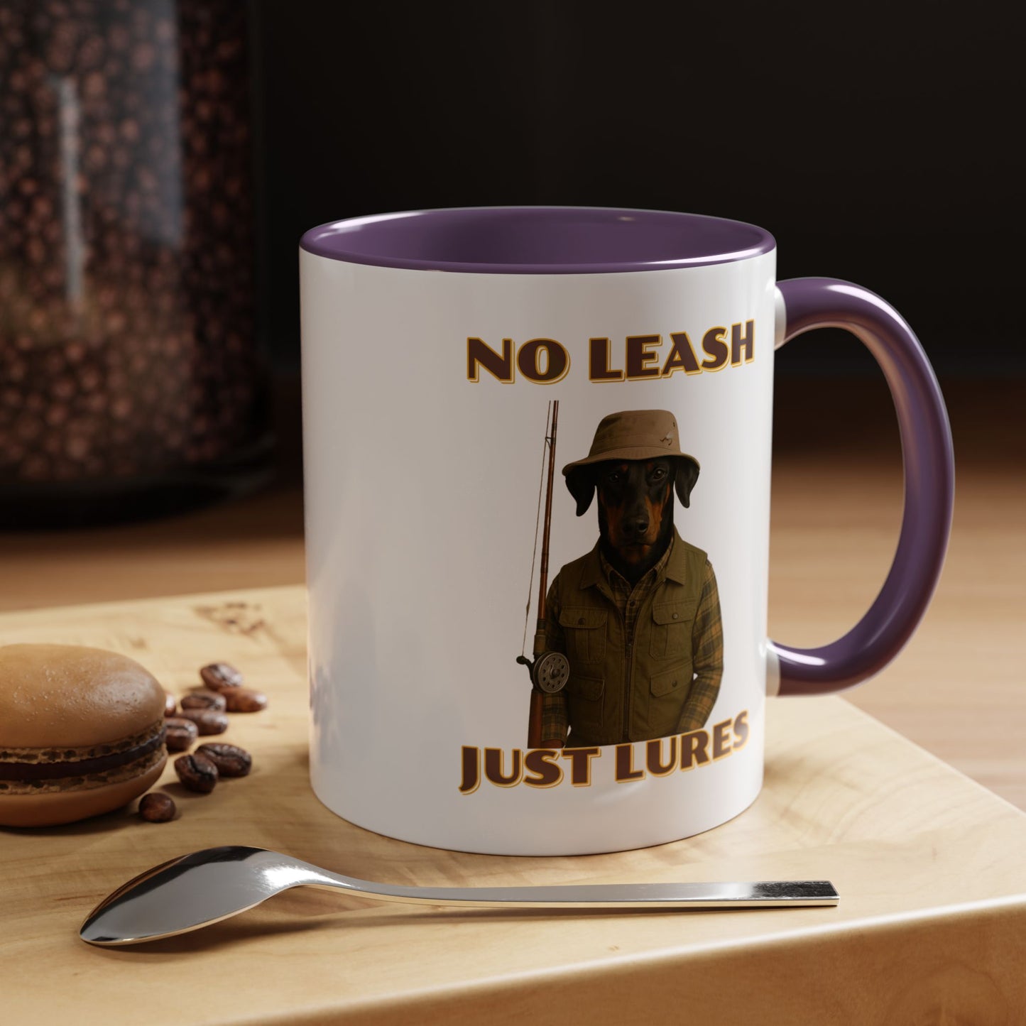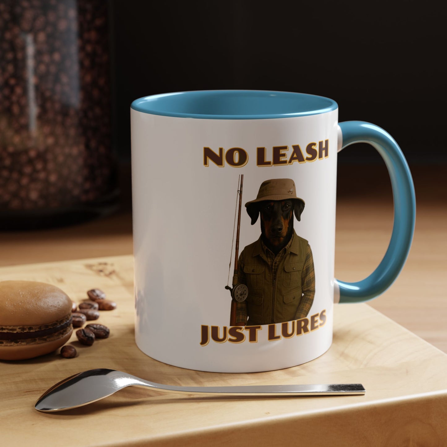 This humorous vintage-style poster features a black and tan dog dressed as an outdoorsman, wearing a khaki bucket hat, plaid flannel shirt, and fishing vest, holding a fishing rod against a black background. The image is a playful parody of hunting and fishing culture, with bold yellow text reading "NO LEASH" at the top and "JUST LURES" at the bottom. The dog appears serious and stoic, embodying the stereotypical rugged sportsman aesthetic with its carefully styled outfit and professional pose. The graphic design mimics classic outdoor adventure posters, complete with a nostalgic color palette and retro typography that gives the image a timeless, tongue-in-cheek appeal. The dog's breed looks like a Doberman or similar short-haired breed, and its expression suggests a no-nonsense attitude typical of seasoned anglers and hunters. The photoshopped combination of a dog's head with human clothing creates a comical visual that plays on the idea of anthropomorphized animals and outdoor recreation stereotypes. The poster's high-contrast design and witty concept make it a memorable piece of humorous art that would likely appeal to dog lovers, fishing enthusiasts, and those who appreciate quirky visual humor. The detailed costume and professional photography elevate the image from a simple meme to a sophisticated piece of comedic graphic design. The clever wordplay in the text "No Leash, Just Lures" adds an extra layer of humor to the already amusing image. Overall, the poster successfully blends comedy, nostalgia, and creative visual storytelling in a single, eye-catching composition.