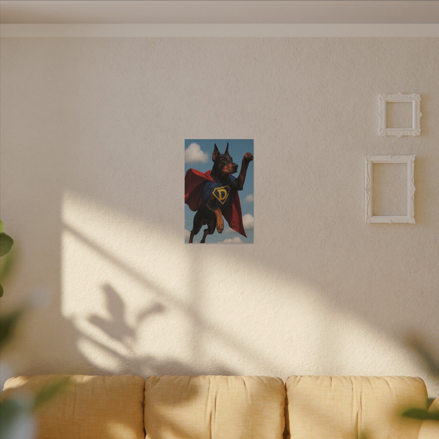 Introducing the ultimate canine superhero: a Doberman Pinscher dressed in a stunning superhero costume, complete with a blue and yellow "D" emblem and a flowing red cape. This heroic dog strikes a powerful pose against a backdrop of fluffy white clouds and a vibrant blue sky, embodying courage and strength. The dog's sleek black and tan coat gleams in the sunlight, highlighting its muscular physique and heroic stance. With one paw raised dramatically, the Doberman looks determined and ready to save the day, capturing the imagination of dog lovers and comic book fans alike. The costume is meticulously designed, featuring a superhero-style logo that transforms the noble Doberman into a crime-fighting champion. The dynamic composition of the image creates a sense of movement and excitement, making the dog appear to be mid-flight and ready to leap into action. Every detail, from the dog's alert ears to the billowing cape, suggests power, agility, and unwavering heroism. This playful and creative photograph reimagines the Doberman breed as a superhero guardian, showcasing the intelligence and noble spirit of these magnificent dogs. The high-quality image celebrates the bond between humans and their four-legged companions, while also providing a whimsical and entertaining visual treat. It's a perfect representation of how dogs can capture our hearts and imaginations, turning an ordinary pet into an extraordinary superhero.