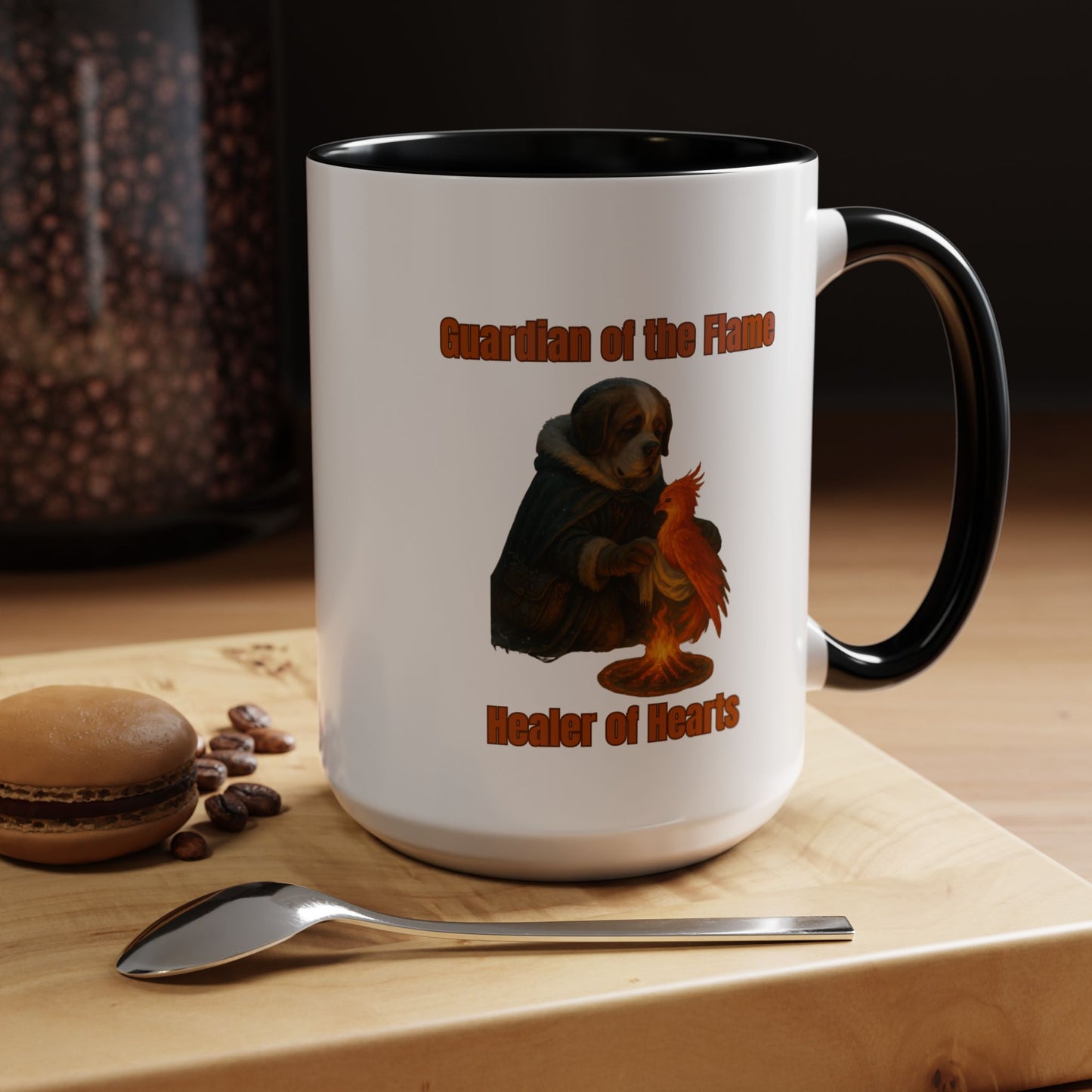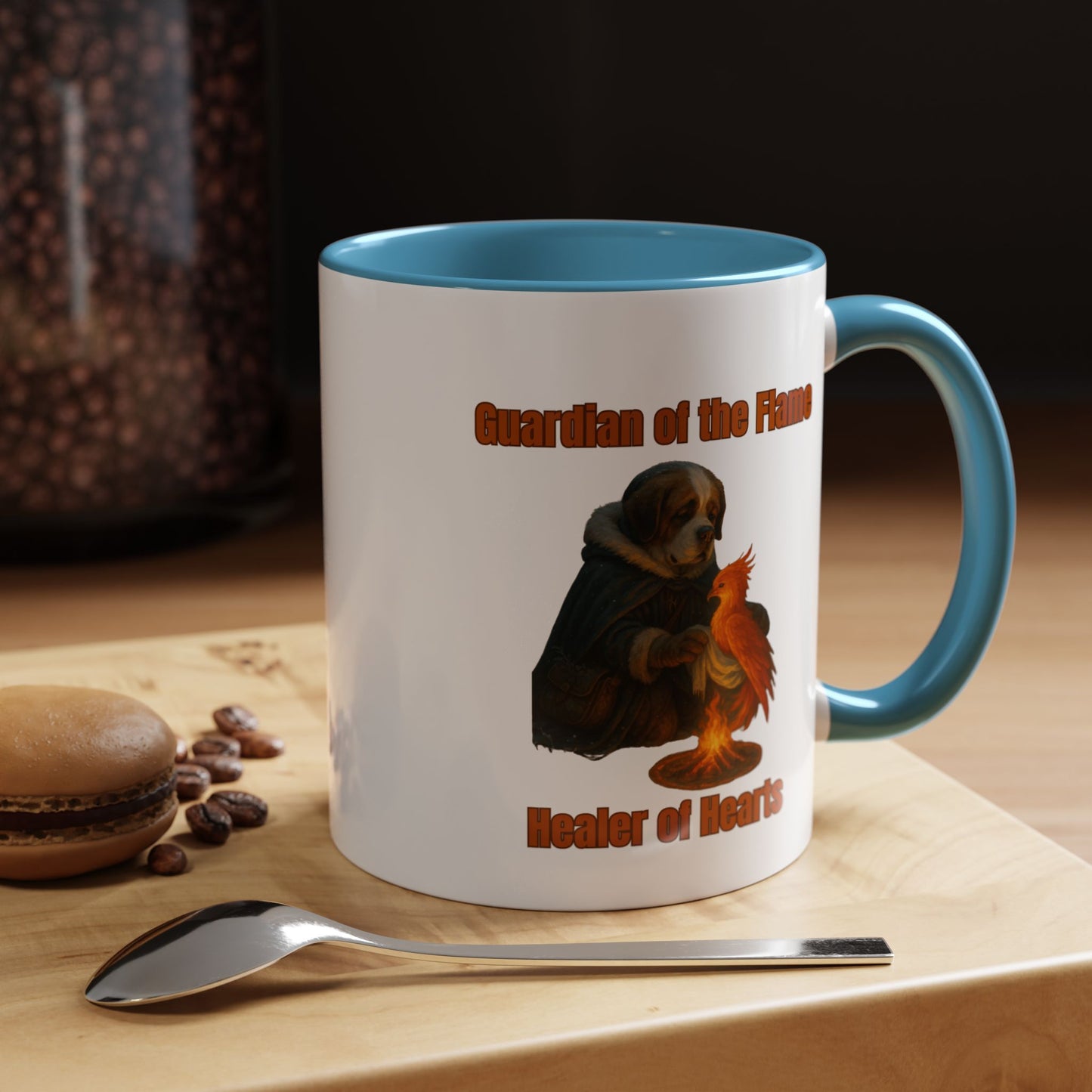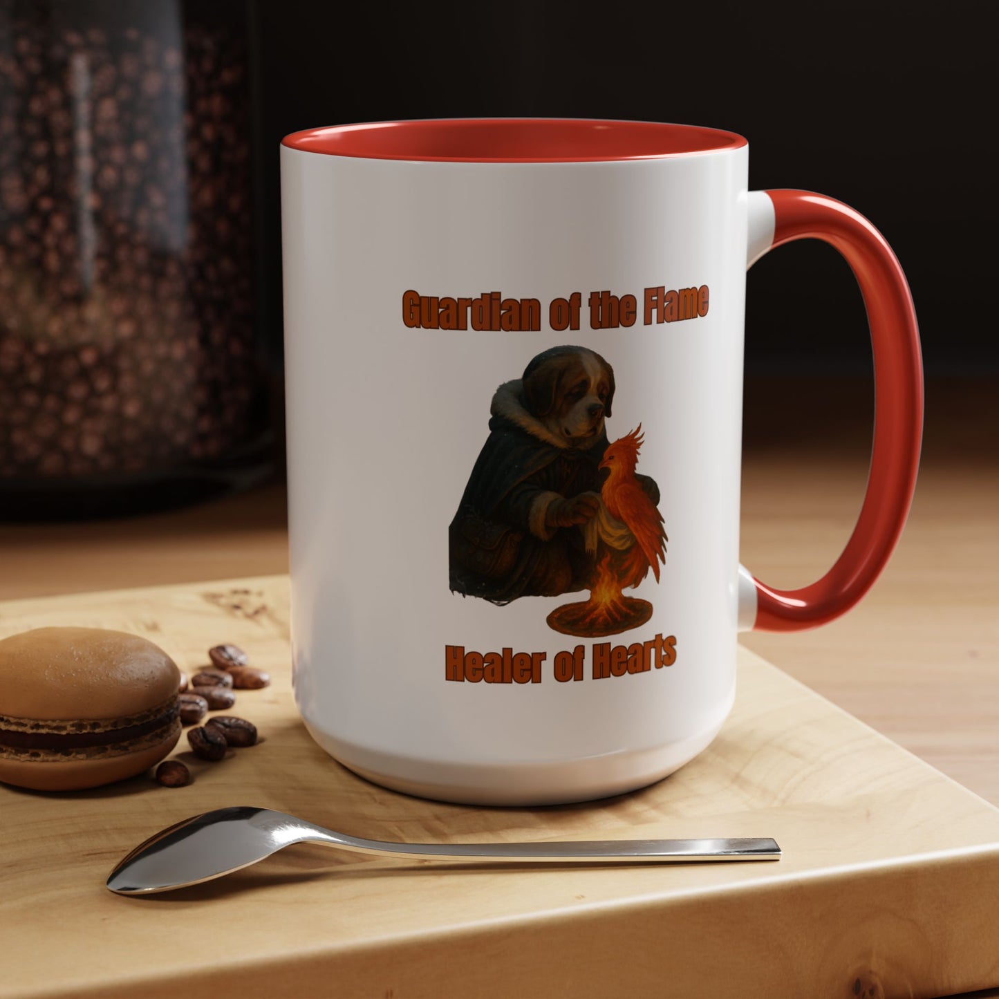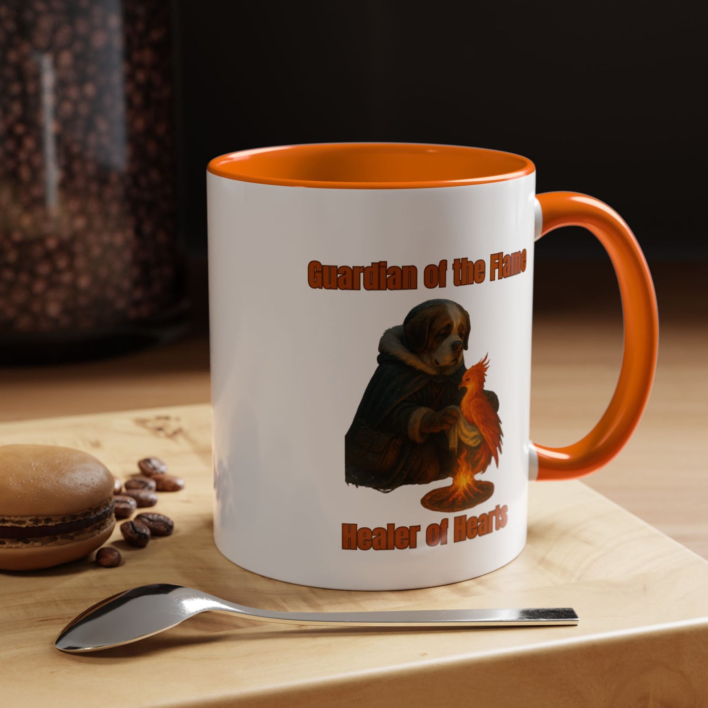 Guardian of the Flame, Healer of Hearts" is a captivating fantasy artwork featuring a loyal canine companion dressed in a fur-lined cloak, sitting beside a vibrant phoenix perched near a glowing flame. The image evokes a sense of mystical protection and companionship, with rich, warm orange and deep blue-gray tones creating a dramatic contrast against a black background. The dog appears wise and compassionate, embodying the role of a guardian with its protective posture and gentle demeanor. The phoenix, rendered in brilliant orange-red hues, symbolizes rebirth, healing, and transformative power, its flames burning brightly on a circular platform. The artwork suggests a profound bond between the two magical beings, hinting at themes of loyalty, healing, and spiritual connection. The typography, bold and emblazoned in matching orange, reinforces the heroic and mythical nature of the scene. Every detail, from the textured cloak to the luminous feathers of the phoenix, is meticulously crafted to draw the viewer into this enchanting narrative. The composition speaks to the archetypal roles of protection, restoration, and the deep, unspoken understanding between mystical companions. This image would resonate with fantasy art lovers, mythology enthusiasts, and those who appreciate allegorical representations of companionship and inner strength. The artwork masterfully blends elements of fantasy, symbolism, and emotional depth to create a powerful visual story.