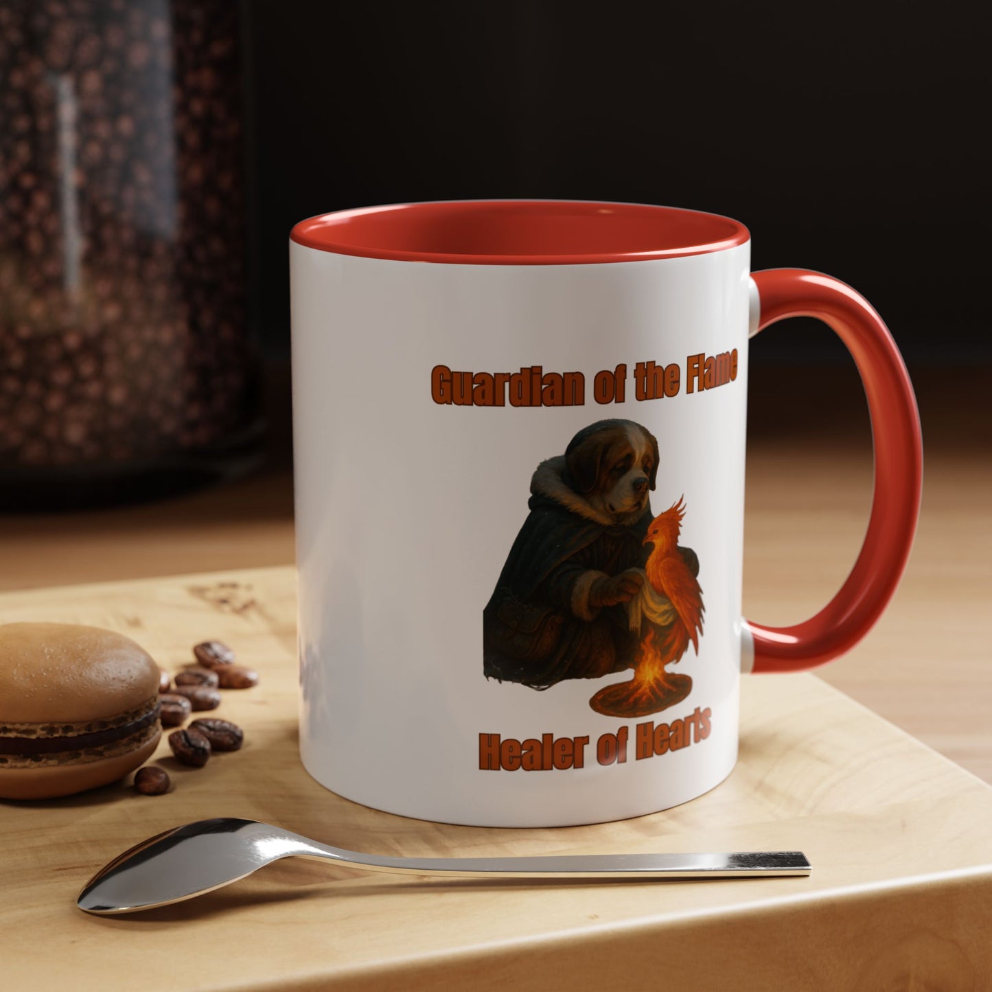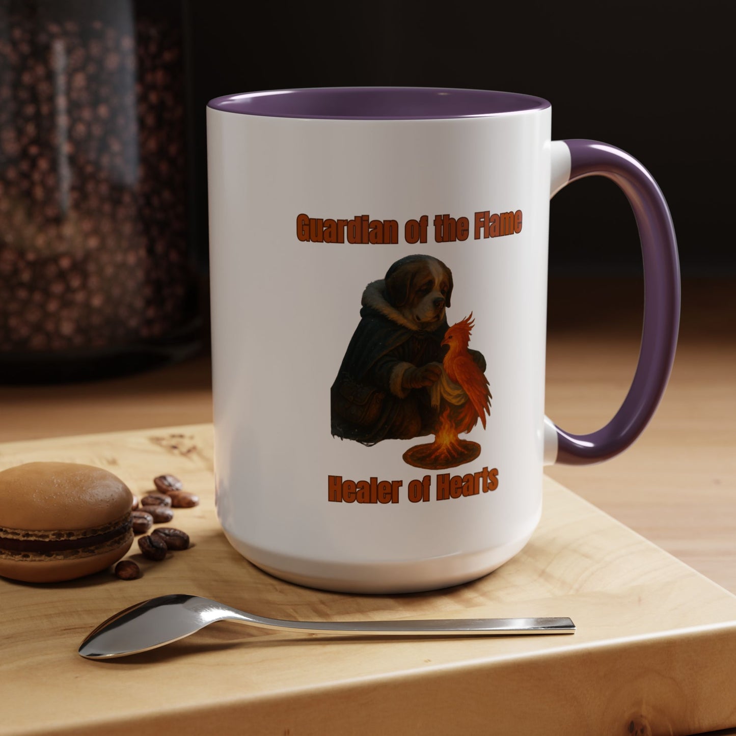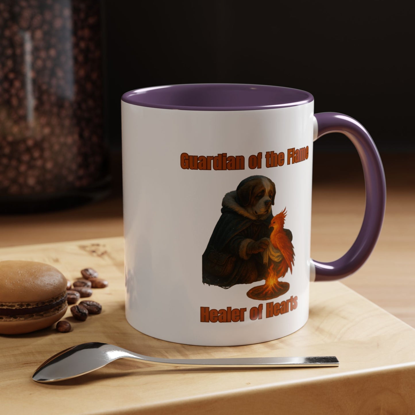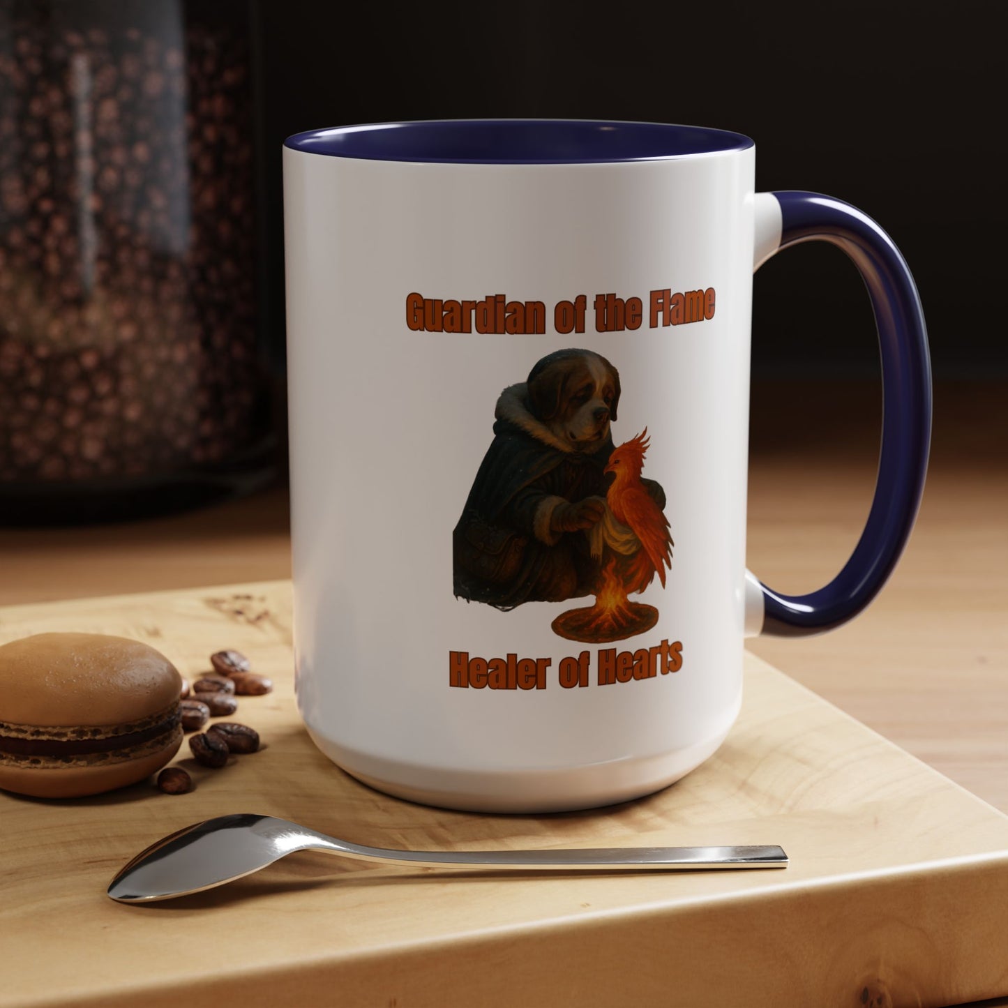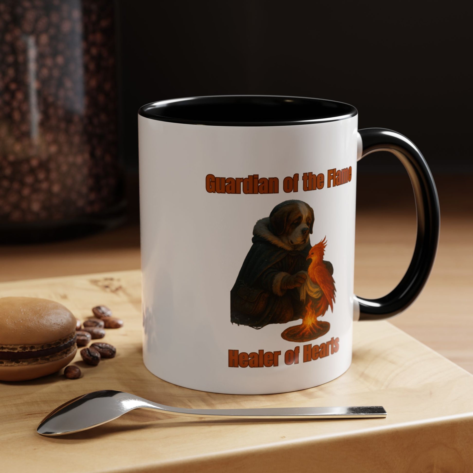 Guardian of the Flame, Healer of Hearts" is a captivating fantasy artwork featuring a loyal canine companion dressed in a fur-lined cloak, sitting beside a vibrant phoenix perched near a glowing flame. The image evokes a sense of mystical protection and companionship, with rich, warm orange and deep blue-gray tones creating a dramatic contrast against a black background. The dog appears wise and compassionate, embodying the role of a guardian with its protective posture and gentle demeanor. The phoenix, rendered in brilliant orange-red hues, symbolizes rebirth, healing, and transformative power, its flames burning brightly on a circular platform. The artwork suggests a profound bond between the two magical beings, hinting at themes of loyalty, healing, and spiritual connection. The typography, bold and emblazoned in matching orange, reinforces the heroic and mythical nature of the scene. Every detail, from the textured cloak to the luminous feathers of the phoenix, is meticulously crafted to draw the viewer into this enchanting narrative. The composition speaks to the archetypal roles of protection, restoration, and the deep, unspoken understanding between mystical companions. This image would resonate with fantasy art lovers, mythology enthusiasts, and those who appreciate allegorical representations of companionship and inner strength. The artwork masterfully blends elements of fantasy, symbolism, and emotional depth to create a powerful visual story.