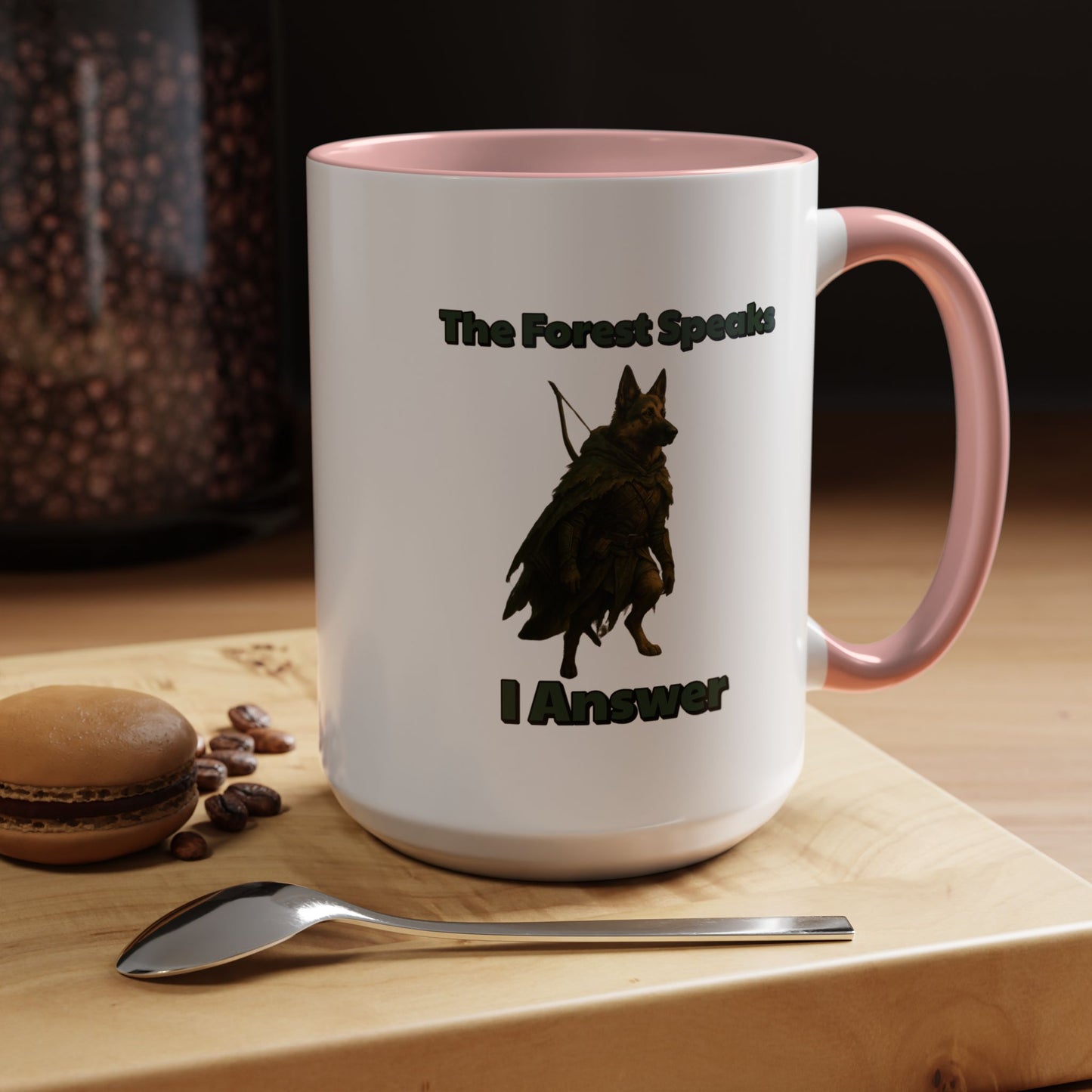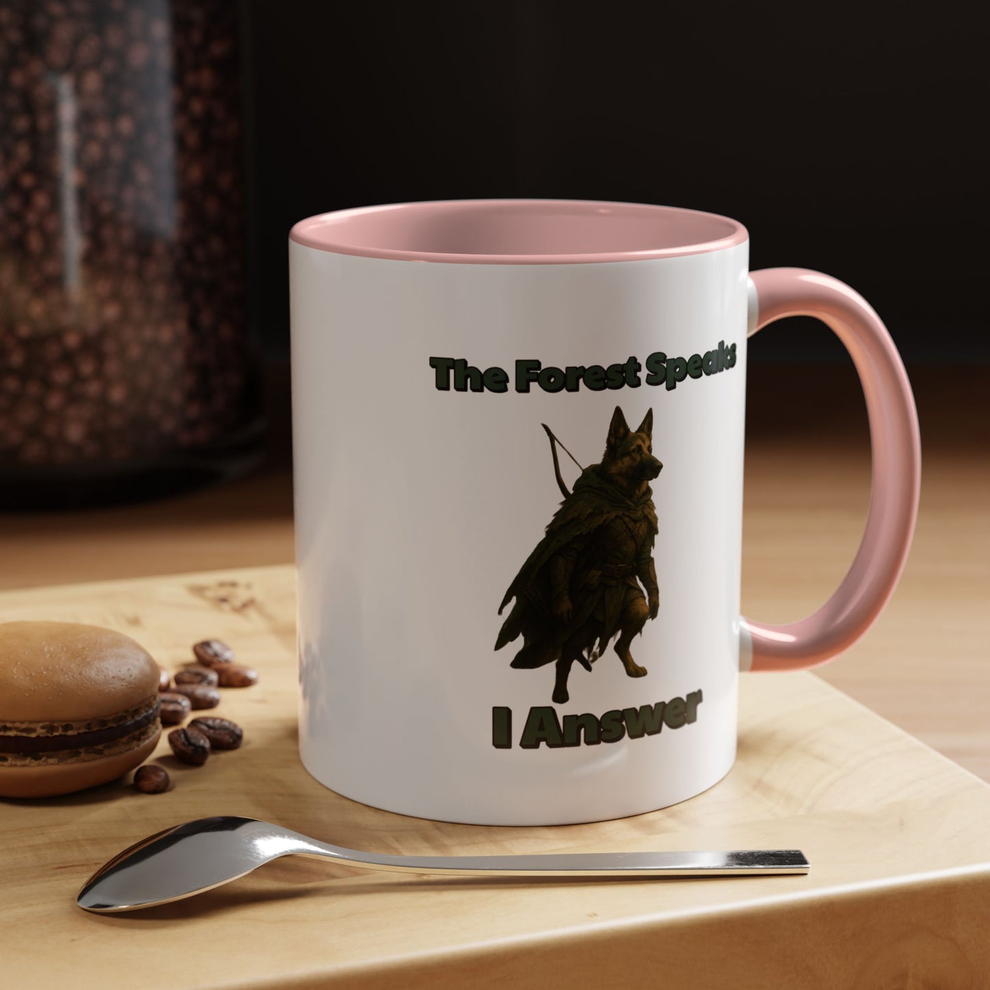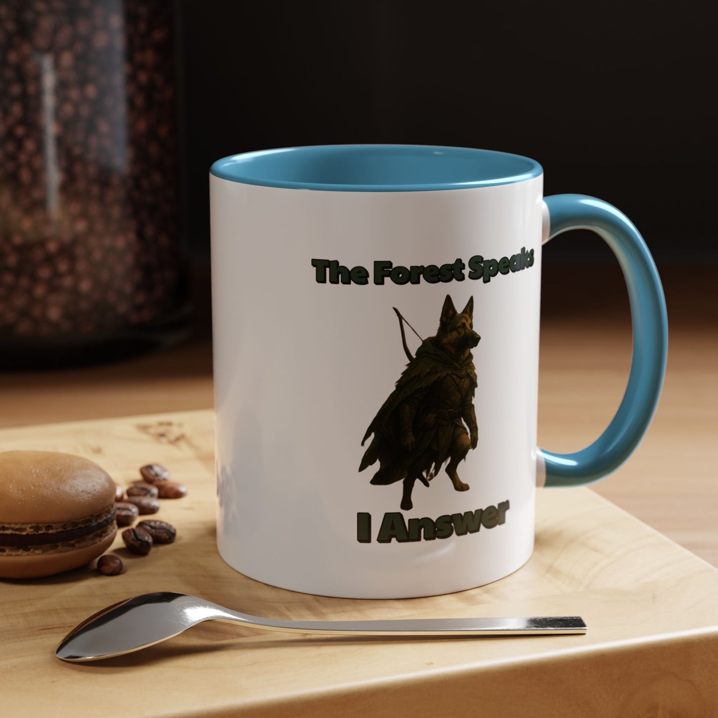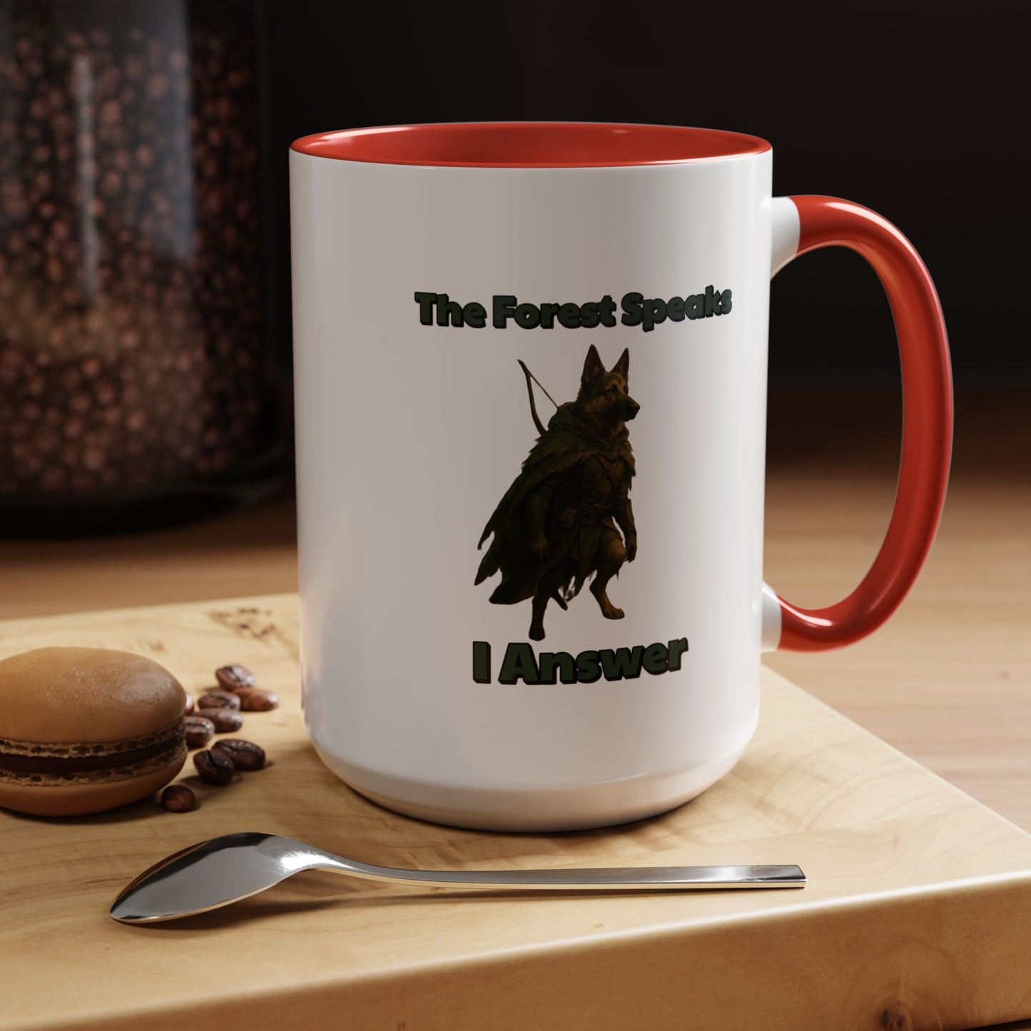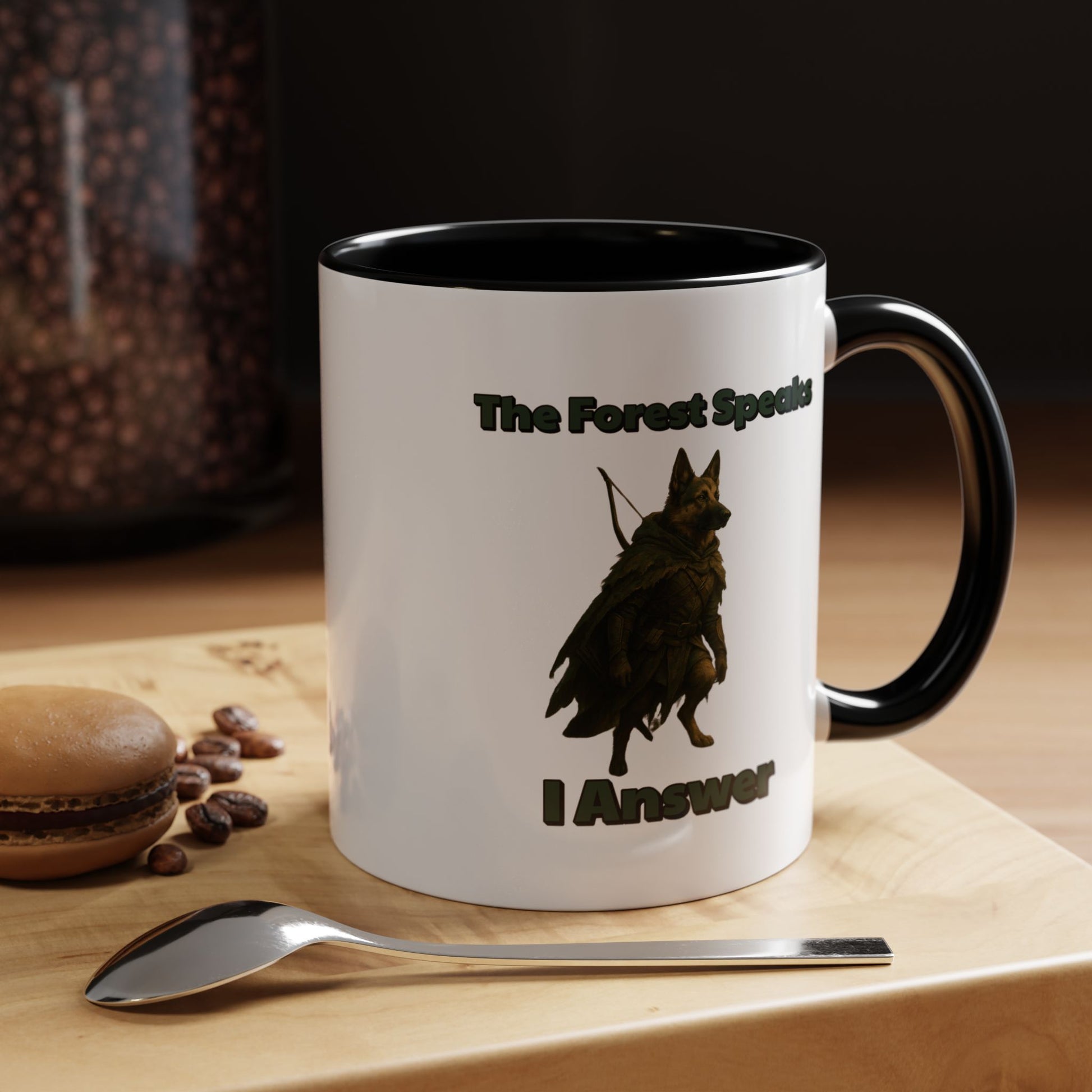 In this striking digital artwork, a German Shepherd is reimagined as a mystical forest guardian, dressed in a tattered green cloak and standing upright with an archer's bow slung across its back. The image, titled "The Forest Speaks, I Answer," evokes a powerful narrative of wilderness, mystery, and companionship. The dog's pose is both regal and alert, suggesting a readiness to defend or communicate with the unseen forces of the forest. Dark green and earthy tones dominate the composition, creating a moody and atmospheric backdrop that enhances the creature's mythical appearance. The canine's fur is richly detailed, with subtle variations in color that suggest depth and texture, while its gaze is focused and intense, hinting at an intelligence beyond ordinary perception. The design blends elements of fantasy and naturalism, transforming a familiar animal into a sentinel of the woodland realm. The graphic's typography is bold and understated, using a deep green font that complements the overall color palette and thematic elements. This image appears to be part of a larger narrative or artistic series exploring the connection between animals, nature, and mystical storytelling. The artwork challenges viewers to reconsider the traditional boundaries between the natural and supernatural worlds. Its compelling visual metaphor suggests that nature has its own language, and some beings are uniquely equipped to understand and interpret it.