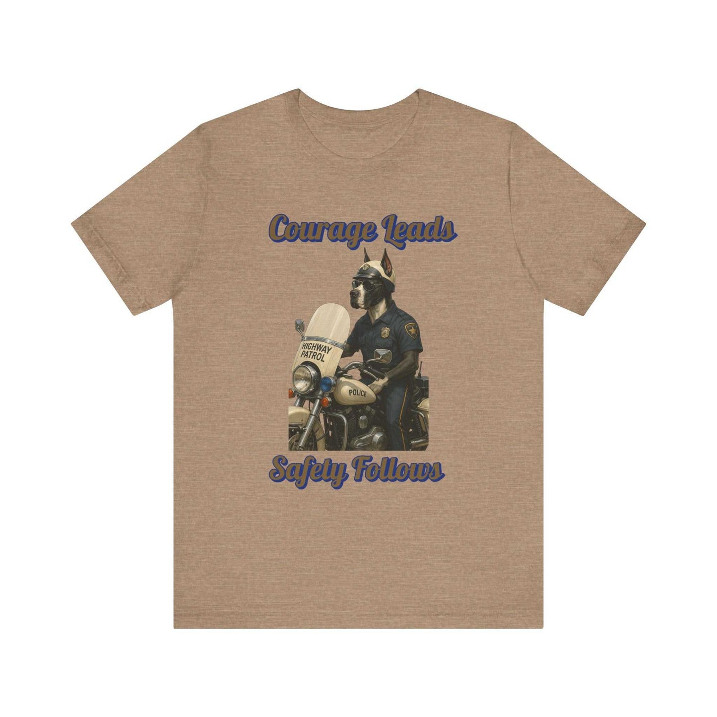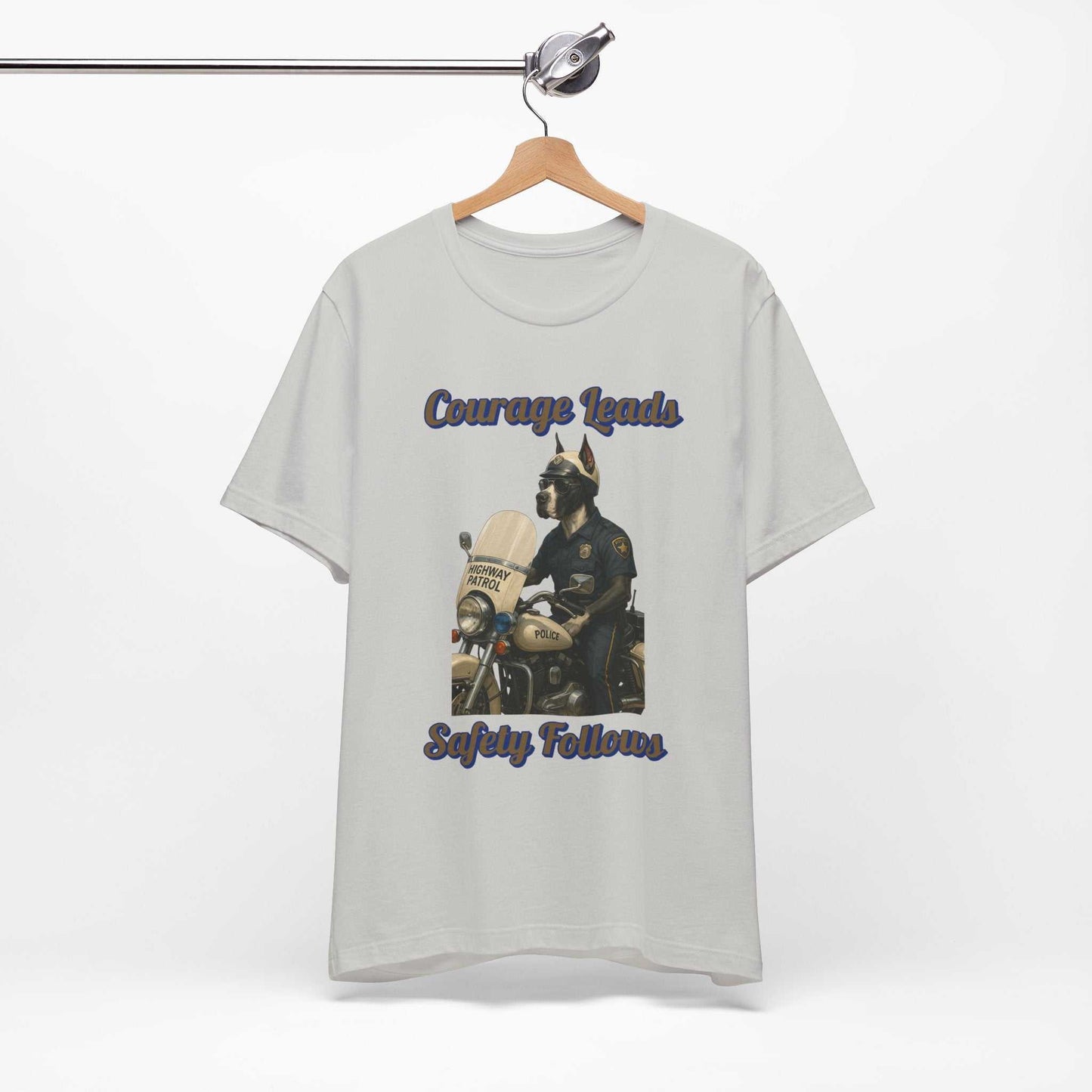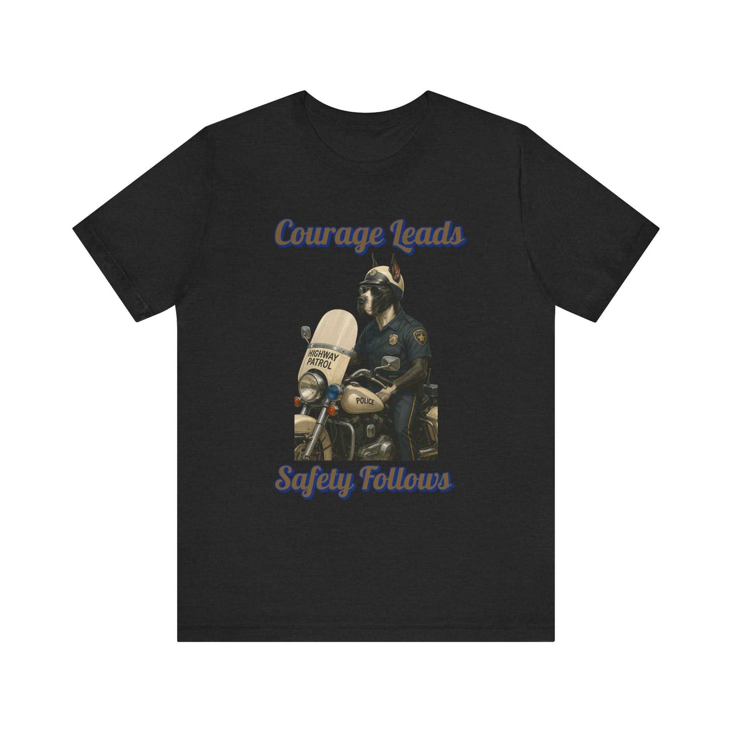 This striking illustration depicts an anthropomorphic dog as a highway patrol officer, embodying the message "Courage Leads, Safety Follows." The artwork features a muscular canine figure dressed in a classic police uniform, complete with a badge, sunglasses, and a police cap. He stands beside a vintage police motorcycle, specifically a Highway Patrol bike with authentic details like the "Police" marking on the fuel tank. The image is set against a black background, which dramatically highlights the cream and blue color palette of the motorcycle and officer's uniform. The artistic style is highly detailed and realistic, rendering the dog character with impressive precision and personality. Sunlight and shadows are masterfully used to create depth and emphasize the contours of the motorcycle and the officer's muscular physique. The text "Courage Leads, Safety Follows" curves around the image, reinforcing the inspirational theme of law enforcement's commitment to public safety. The illustration serves as a powerful metaphor for the bravery and dedication of police officers who work to protect communities. Every element of the image, from the chrome motorcycle parts to the textured fabric of the uniform, is meticulously crafted to create a compelling visual narrative. The artwork celebrates the noble profession of law enforcement through its heroic and dignified portrayal of a highway patrol officer.Fantasy Dog Portraits