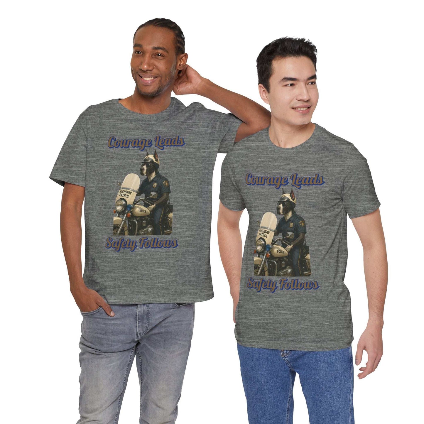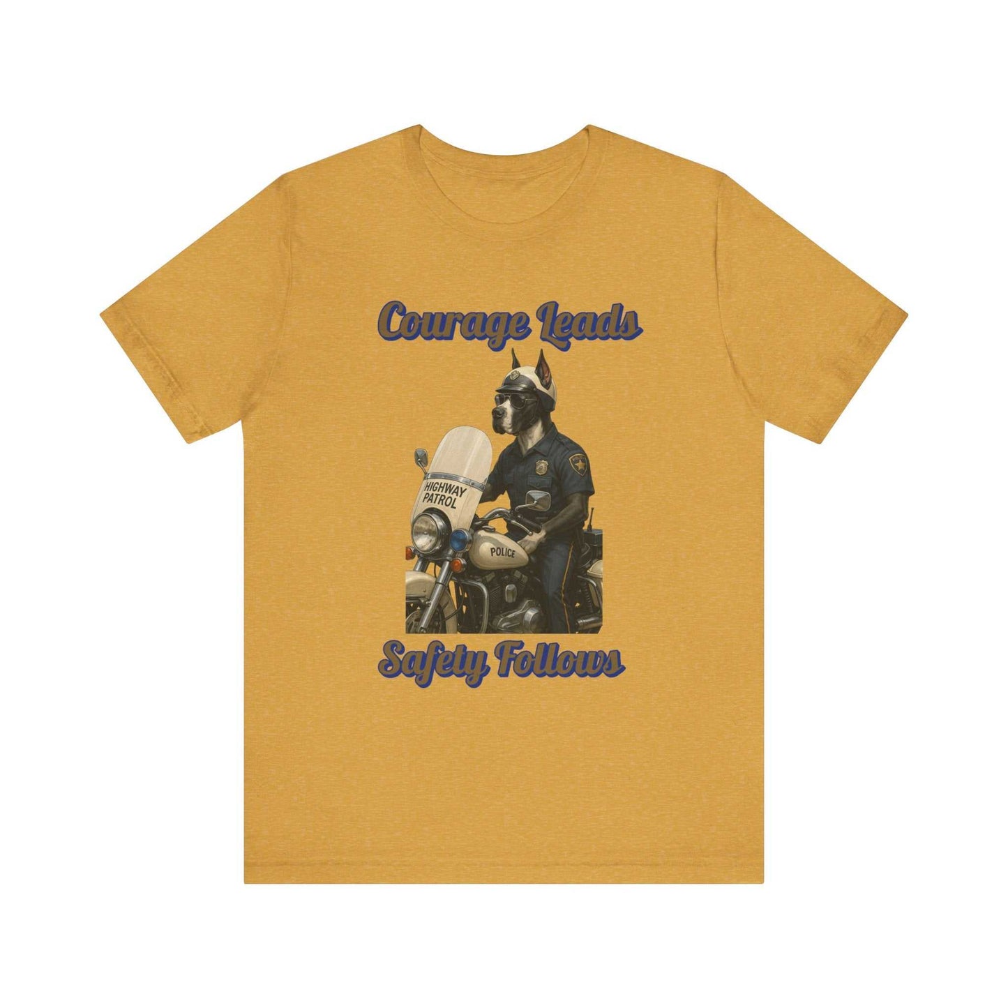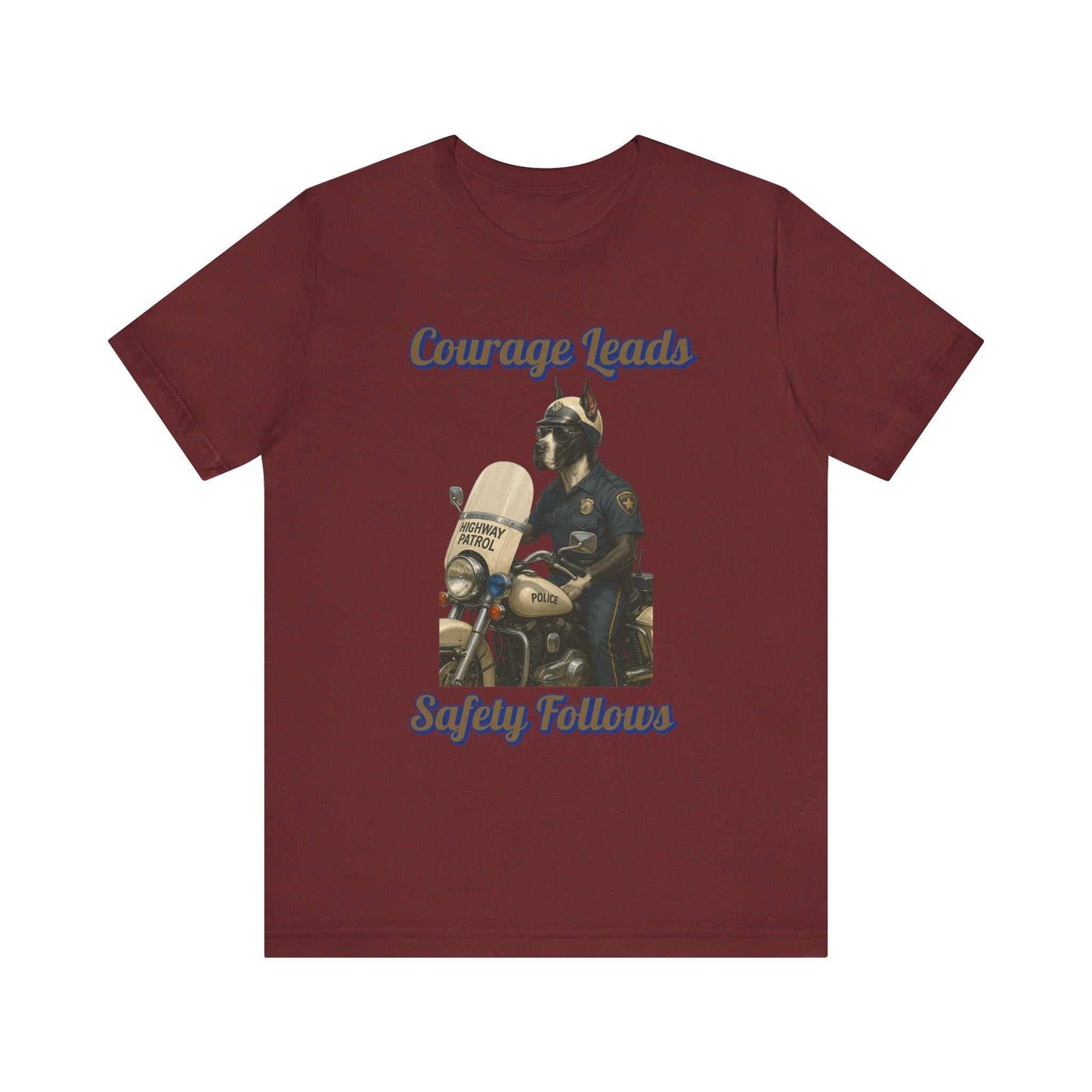 This striking illustration depicts an anthropomorphic dog as a highway patrol officer, embodying the message "Courage Leads, Safety Follows." The artwork features a muscular canine figure dressed in a classic police uniform, complete with a badge, sunglasses, and a police cap. He stands beside a vintage police motorcycle, specifically a Highway Patrol bike with authentic details like the "Police" marking on the fuel tank. The image is set against a black background, which dramatically highlights the cream and blue color palette of the motorcycle and officer's uniform. The artistic style is highly detailed and realistic, rendering the dog character with impressive precision and personality. Sunlight and shadows are masterfully used to create depth and emphasize the contours of the motorcycle and the officer's muscular physique. The text "Courage Leads, Safety Follows" curves around the image, reinforcing the inspirational theme of law enforcement's commitment to public safety. The illustration serves as a powerful metaphor for the bravery and dedication of police officers who work to protect communities. Every element of the image, from the chrome motorcycle parts to the textured fabric of the uniform, is meticulously crafted to create a compelling visual narrative. The artwork celebrates the noble profession of law enforcement through its heroic and dignified portrayal of a highway patrol officer.Fantasy Dog Portraits