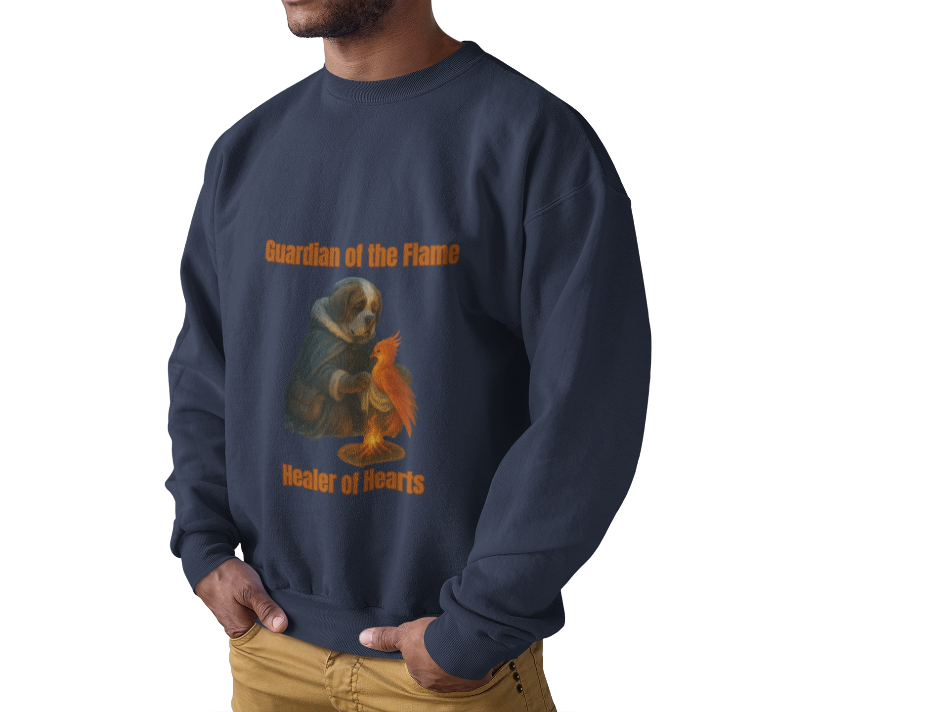 This fantasy-inspired digital artwork portrays a loyal canine companion dressed in a fur-lined cloak, sitting alongside a majestic phoenix-like bird near a glowing flame. The image, titled "Guardian of the Flame, Healer of Hearts," presents a mystical scene with intricate details and a soft, painterly aesthetic. The dog appears wise and protective, gazing thoughtfully at the luminous bird perched beside a small, radiant fire. The artwork suggests a deep bond between the two creatures, evoking themes of companionship, protection, and magical connection. The stylized illustration combines elements of fantasy and mythical storytelling, creating a powerful and emotive visual narrative.Fantasy Dog Portraits