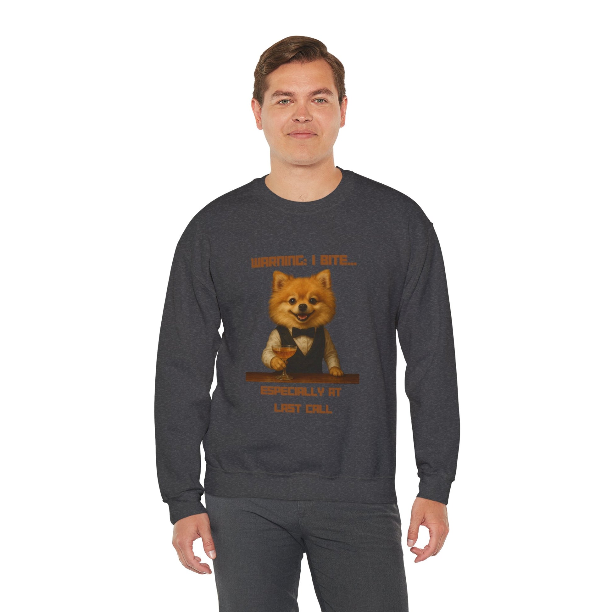 This humorous vintage-style illustration features a Pomeranian dog dressed as a dapper bartender, wearing a black bow tie and white shirt with a black vest. The image has a playful, retro aesthetic with a glitchy, pastel-colored text overlay reading "WARNING: I BITE..." and "ESPECIALLY AT LAST CALL". The fluffy, golden-orange Pomeranian has a mischievous smile and is standing behind a wooden bar, holding a cocktail glass filled with an amber-colored drink. The text suggests a witty warning about the dog's behavior, particularly towards the end of a night of drinking. The illustration combines anthropomorphic humor with a stylized, slightly distressed graphic design approach.Fantasy Dog Portraits