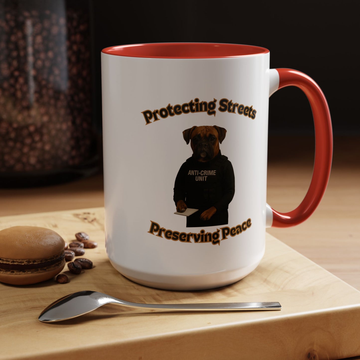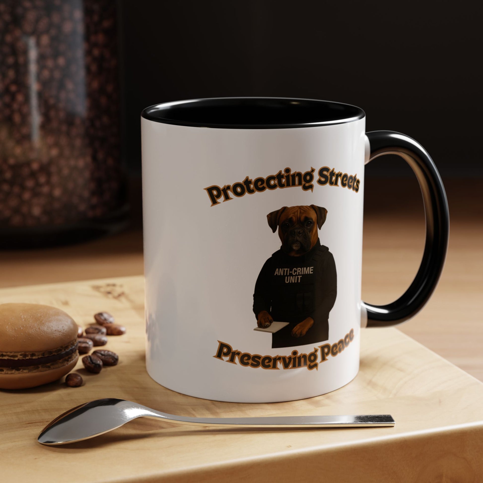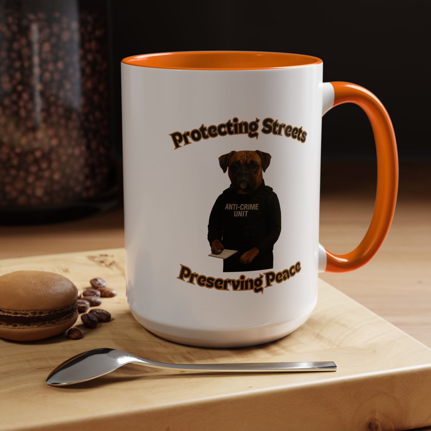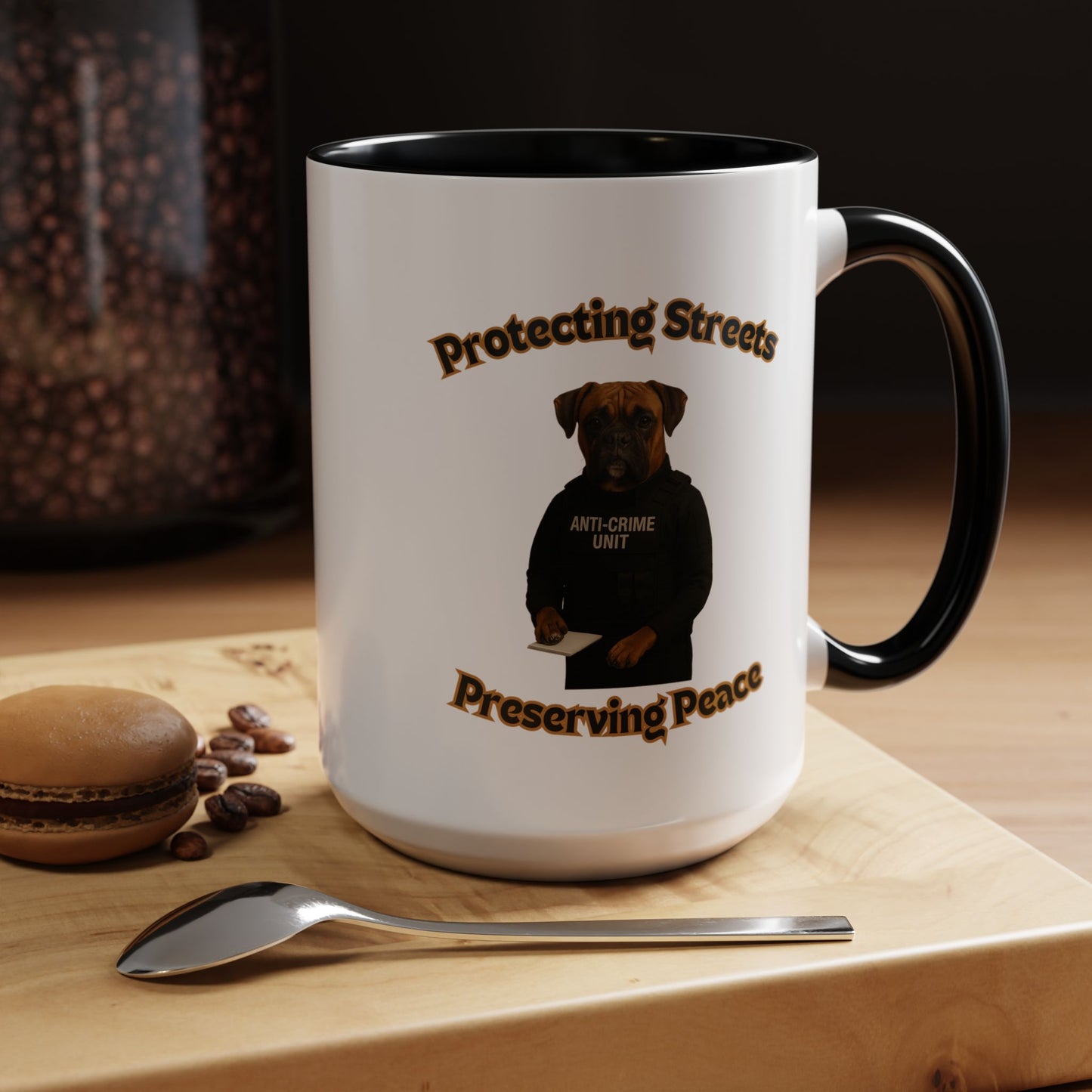 This humorous and impactful image depicts a Boxer dog dressed as a law enforcement officer in an "Anti-Crime Unit" vest, standing against a black background. The photoshopped canine appears serious and professional, holding a notepad with its paw as if ready to document criminal activity. The image is framed by stylized text reading "Protecting Streets" at the top and "Preserving Peace" at the bottom, both in a golden, outlined font. The dog's expressive face and muscular build convey a sense of strength and determination, embodying the role of a dedicated police officer. The high-contrast photography and carefully styled costume create a powerful visual metaphor about community safety and crime prevention. The photograph cleverly anthropomorphizes the dog, giving it a human-like stance and professional demeanor that is both amusing and thought-provoking. The concept playfully suggests that protection and peace-keeping can come in unexpected forms, even from our four-legged companions. The stark black background emphasizes the dog's serious expression and official attire, making the image both comedic and impactful. This creative composition blends humor with a meaningful message about community security and the role of law enforcement. The image serves as a unique and engaging visual commentary on crime prevention and community safety.