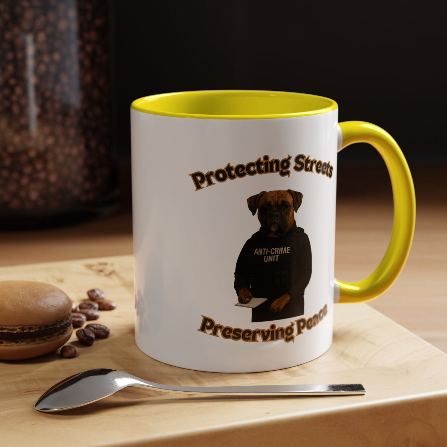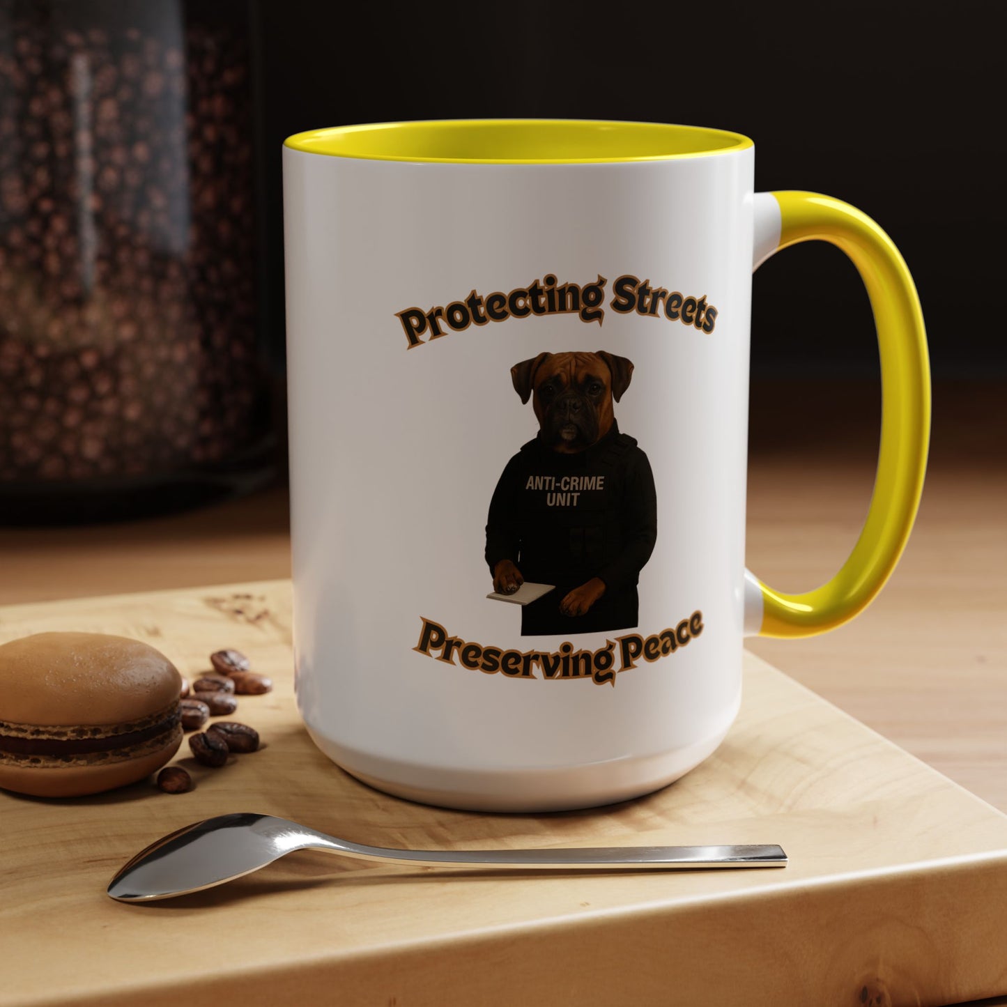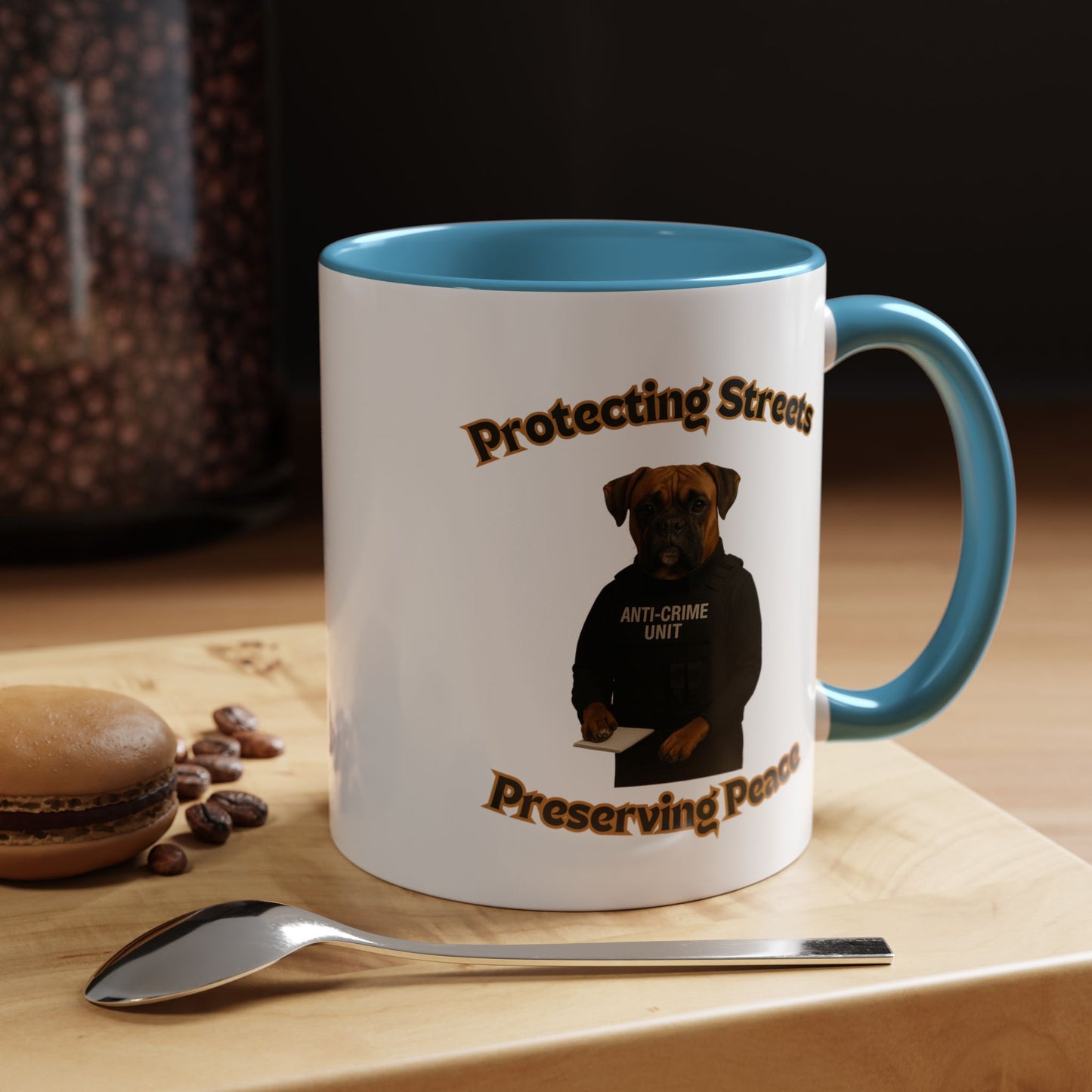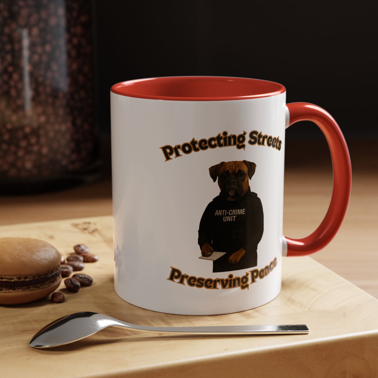 This humorous and impactful image depicts a Boxer dog dressed as a law enforcement officer in an "Anti-Crime Unit" vest, standing against a black background. The photoshopped canine appears serious and professional, holding a notepad with its paw as if ready to document criminal activity. The image is framed by stylized text reading "Protecting Streets" at the top and "Preserving Peace" at the bottom, both in a golden, outlined font. The dog's expressive face and muscular build convey a sense of strength and determination, embodying the role of a dedicated police officer. The high-contrast photography and carefully styled costume create a powerful visual metaphor about community safety and crime prevention. The photograph cleverly anthropomorphizes the dog, giving it a human-like stance and professional demeanor that is both amusing and thought-provoking. The concept playfully suggests that protection and peace-keeping can come in unexpected forms, even from our four-legged companions. The stark black background emphasizes the dog's serious expression and official attire, making the image both comedic and impactful. This creative composition blends humor with a meaningful message about community security and the role of law enforcement. The image serves as a unique and engaging visual commentary on crime prevention and community safety.