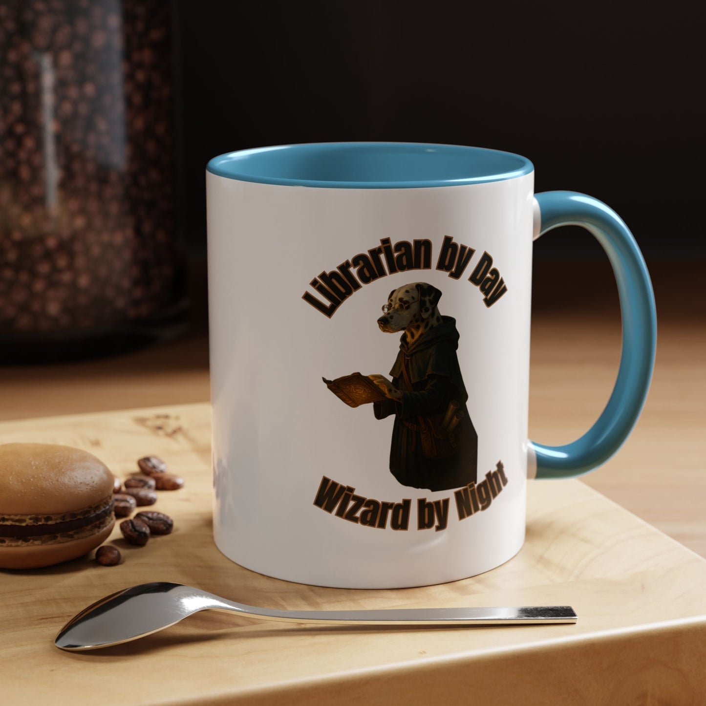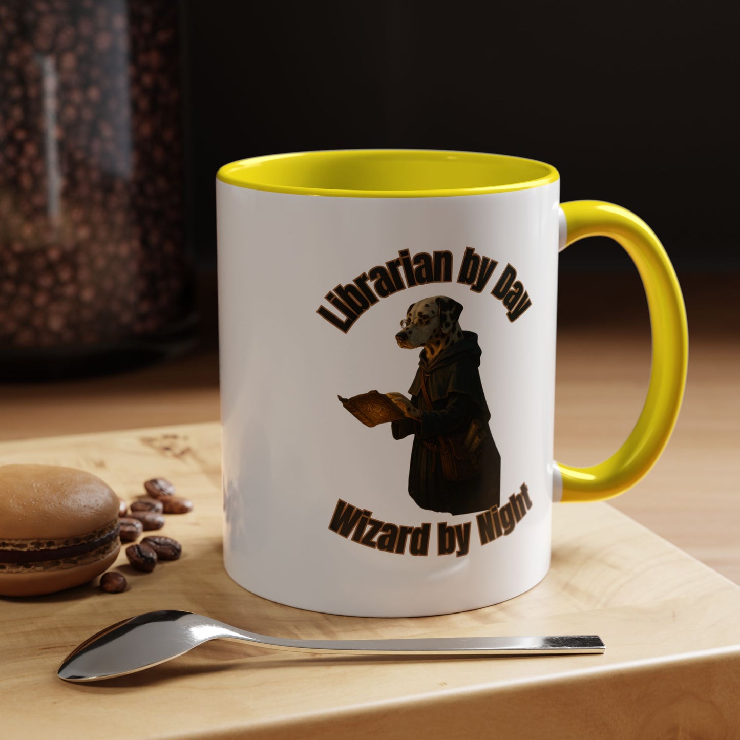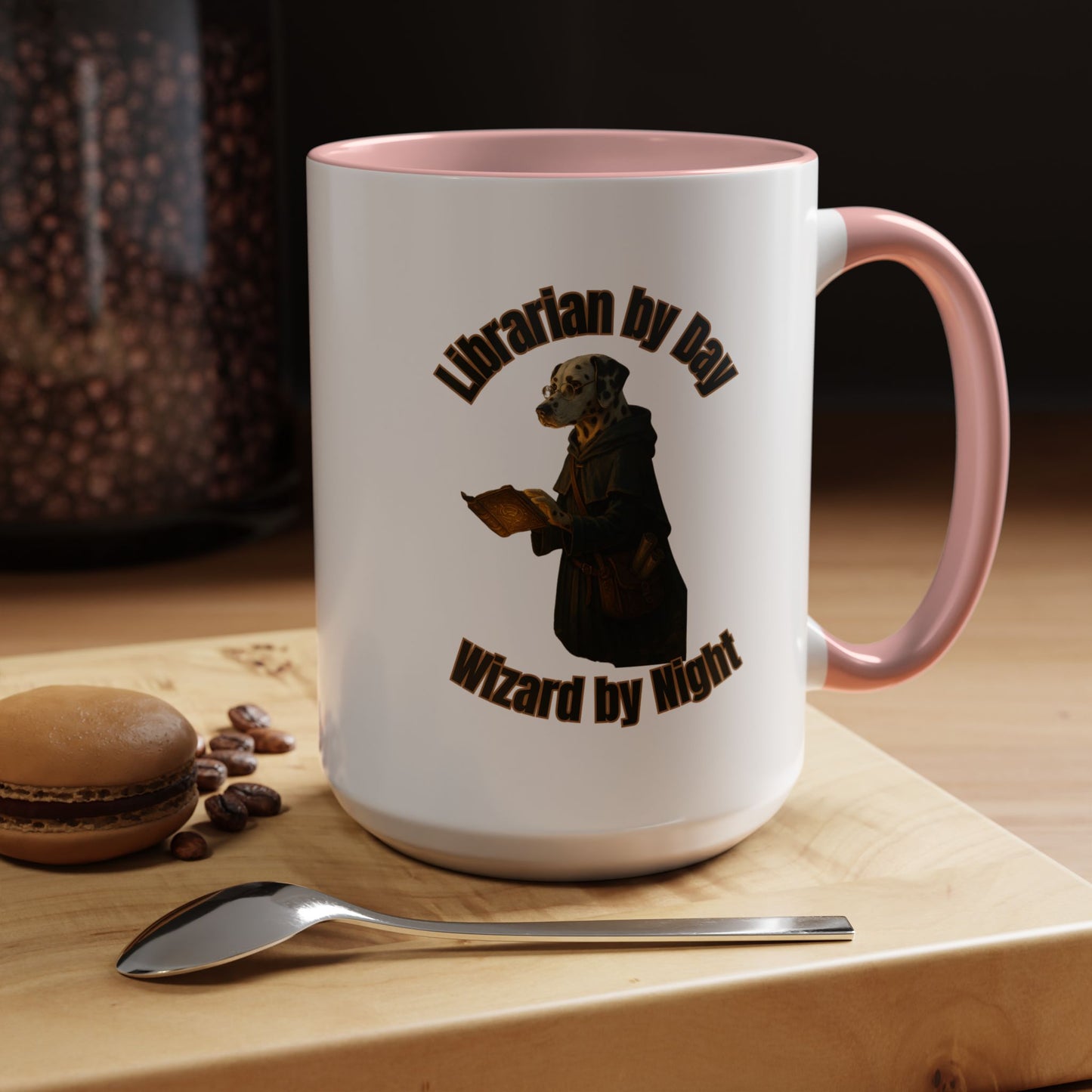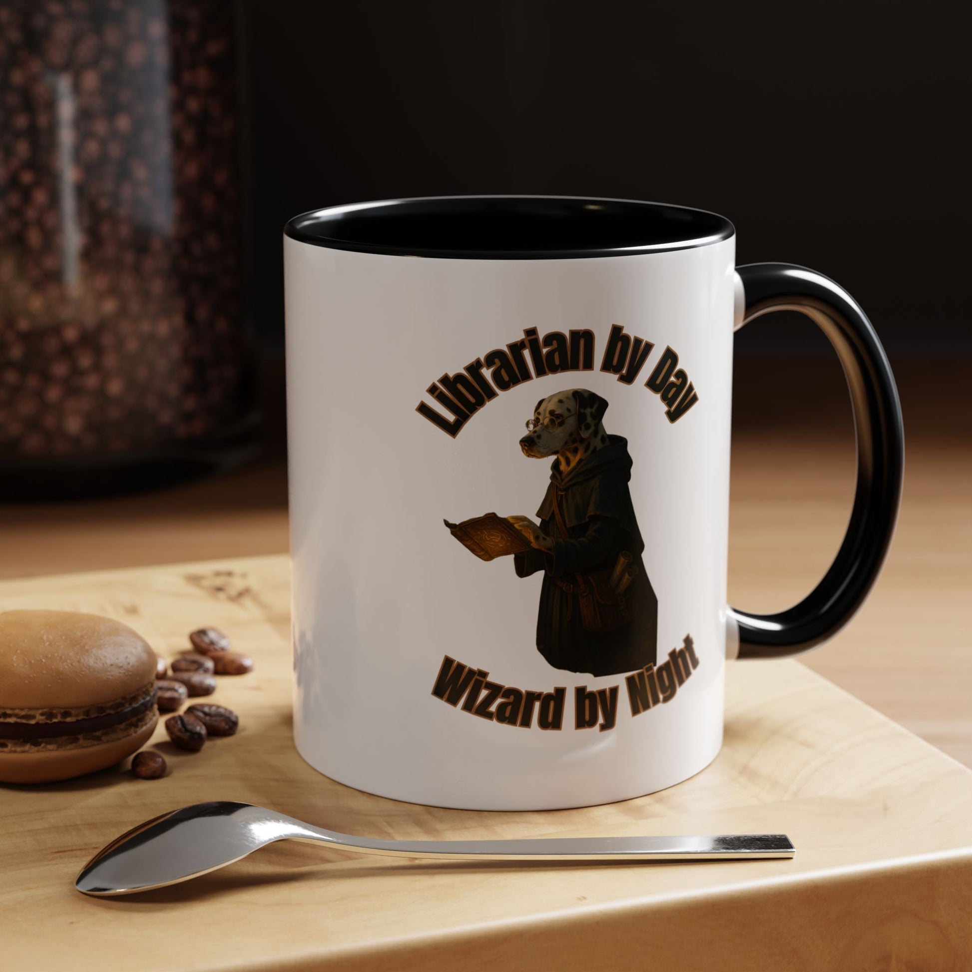 Discover the enchanting world of "Librarian by Day, Wizard by Night," a captivating illustration featuring a scholarly Dalmatian in a mystical setting. This imaginative artwork depicts a dog librarian transformed into a magical wizard, wearing round spectacles and a dark, flowing robe. The canine protagonist holds an ornate, golden-hued book, suggesting a deep connection to both literary and arcane knowledge. Set against a black background, the image creates a dramatic and mysterious atmosphere that draws viewers into its unique narrative. The curved text arching above and below the figure adds a dynamic, vintage poster-like quality to the design. Intricate details in the dog's attire, including a well-worn robe and a side pouch, hint at countless adventures and hidden stories. The warm, golden lighting highlights the texture of the book and the dog's spotted coat, creating a sense of depth and intrigue. This creative piece beautifully blends the worlds of librarianship and wizardry, offering a whimsical reimagining of a book-loving companion. The artwork invites viewers to imagine the secret life of a librarian who transforms into a powerful magical practitioner when night falls. It's a stunning visual metaphor for the transformative power of knowledge and imagination.