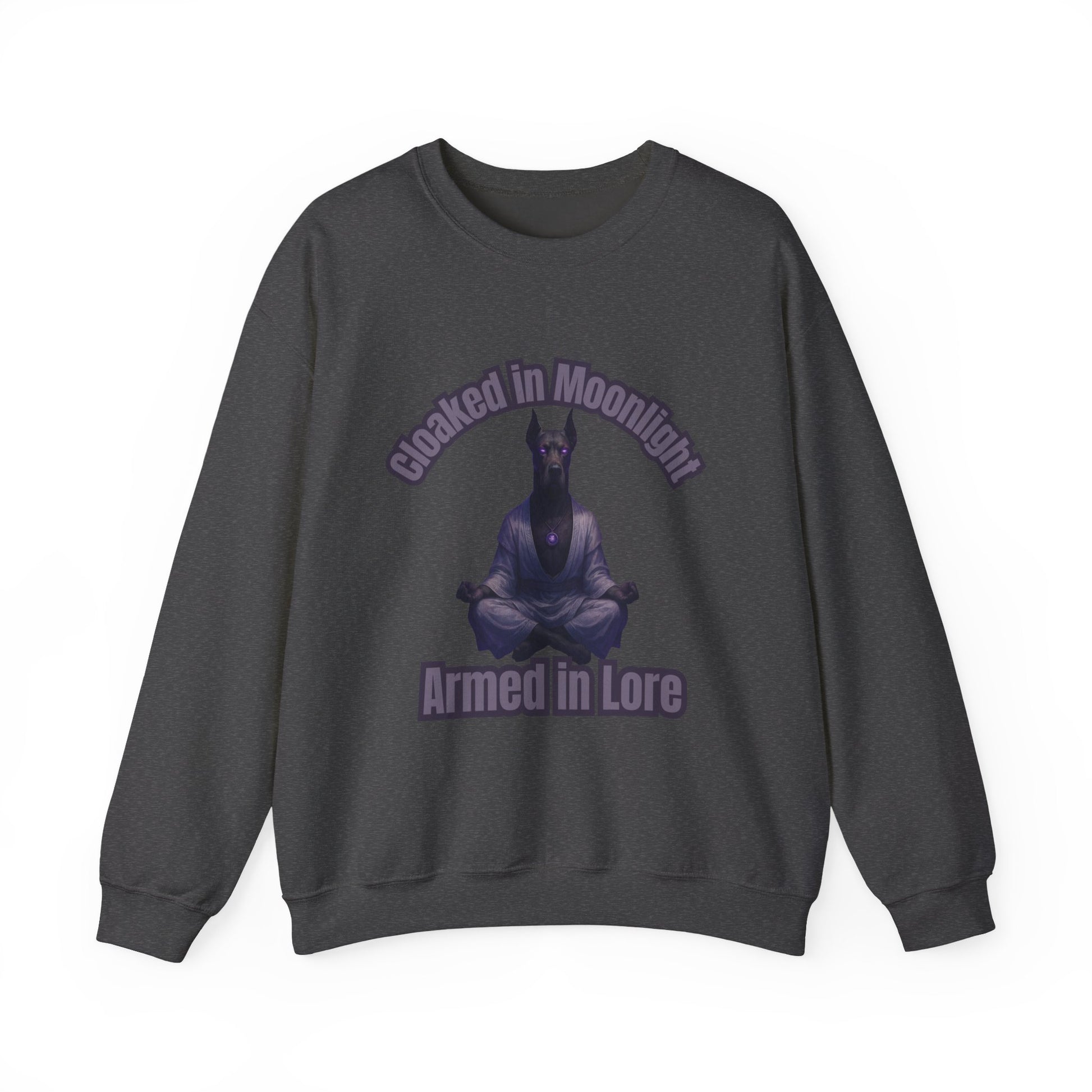 This striking image depicts a Doberman Pinscher seated in a meditative lotus position, wearing a flowing robe typical of spiritual practitioners. The dog has an ethereal, mystical quality with glowing eyes and a pendant necklace, suggesting a supernatural or philosophical theme. The artwork is stylized with a surreal, digital illustration approach that blends animal and human characteristics. Text arches above and below the central figure, reading "Cloaked in Moonlight" and "Armed in Lore" respectively. The composition creates a sense of mysticism, wisdom, and otherworldly power through its unique anthropomorphic representation.Fantasy Dog Portraits