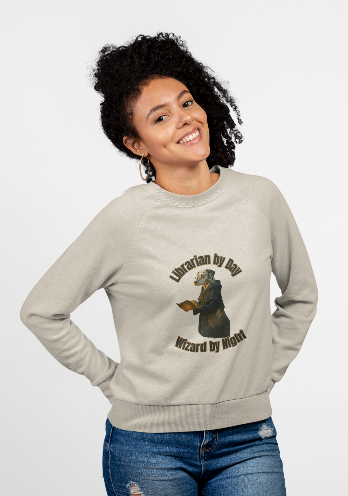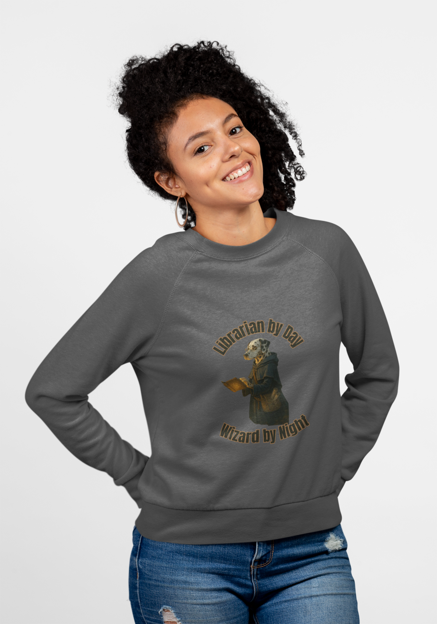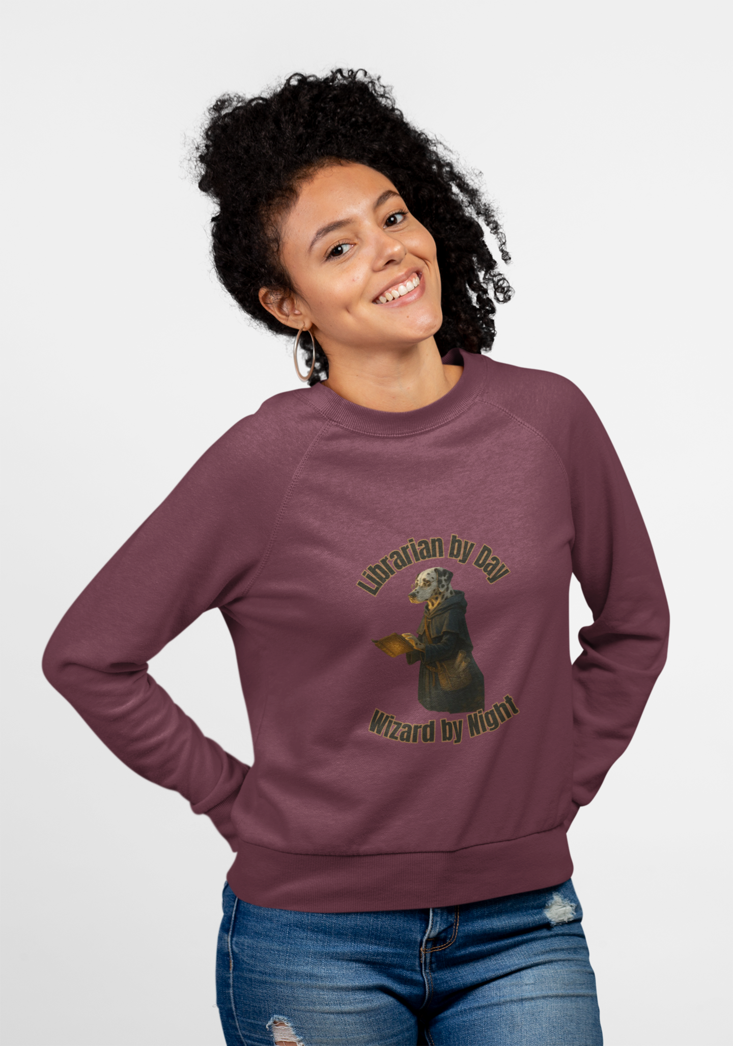This creative graphic depicts a Dalmatian dog dressed as a scholarly librarian and wizard, wearing round glasses and an academic robe while holding an ornate book. The illustration features a whimsical anthropomorphic design with text arching above and below the central figure reading "Librarian by Day" and "Wizard by Night". The artwork presents a playful fusion of library professional and magical practitioner themes, showcasing the dog character in a detailed, stylized rendering. The image appears to be a digital illustration with a vintage or retro aesthetic, blending fantasy and professional imagery. The character is posed in a dignified stance, suggesting both intellectual prowess and magical potential.Fantasy Dog Portraits