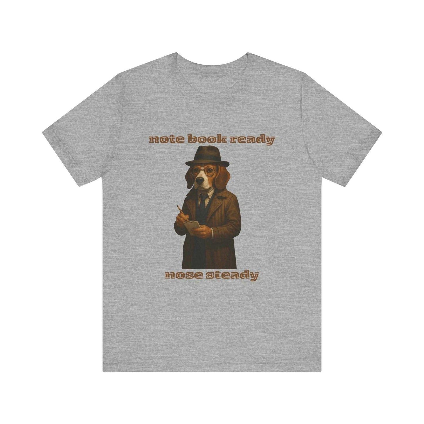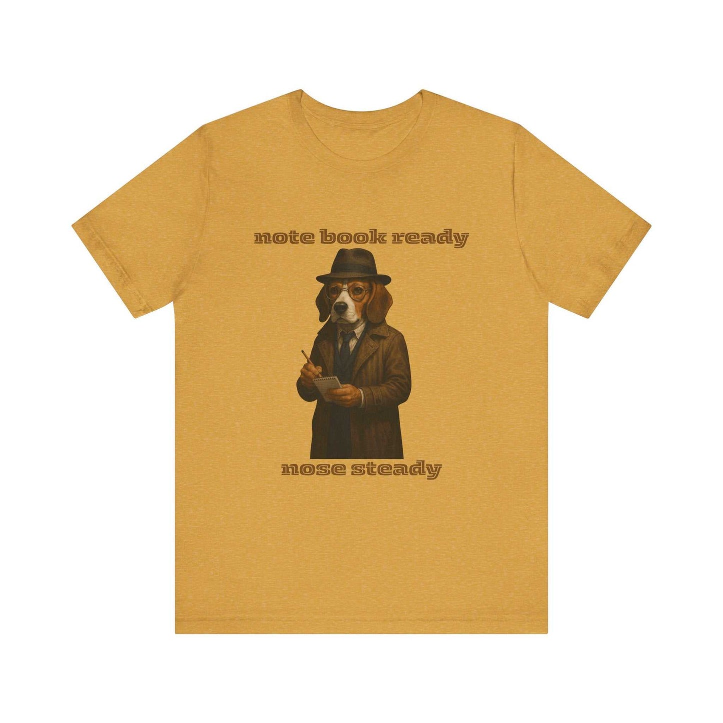 Discover a whimsical art piece that transforms a Beagle into a vintage detective or journalist, complete with a fedora, trench coat, and round glasses. The anthropomorphic dog stands against a black background, holding a notebook and pencil, ready to take notes with professional determination. The image features a nostalgic, sepia-toned color palette that evokes the classic noir aesthetic of mid-20th century investigative work. Clever wordplay adorns the top and bottom of the artwork, reading "note book ready" and "nose steady" - a playful pun that references both the dog's investigative posture and its keen sense of smell. The detailed illustration showcases remarkable artistic skill, with intricate textures in the coat, precise rendering of the dog's fur, and expressive characterization that brings the subject to life. The composition is carefully balanced, drawing the viewer's eye to the central figure and creating a sense of narrative intrigue. This unique artwork blends animal portraiture with human professional styling, creating a charming and humorous visual metaphor about observation, documentation, and investigative spirit. The image appeals to art lovers, dog enthusiasts, and those who appreciate creative anthropomorphic representations. The high-quality rendering and conceptual wit make this piece a standout example of contemporary illustrative art. It successfully transforms an ordinary Beagle into an extraordinary character with personality, profession, and purpose.Fantasy Dog Portraits