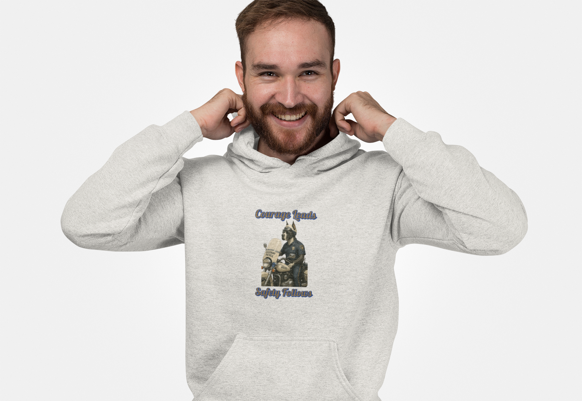 This striking illustration depicts an anthropomorphic dog as a highway patrol police officer, embodying the message "Courage Leads, Safety Follows." The image features a muscular canine figure dressed in a classic police uniform, complete with a badge, dark sunglasses, and a police cap. He stands alongside a vintage police motorcycle, with "Highway Patrol" prominently displayed on the windshield. The artwork is rendered in a detailed, realistic style against a black background, creating a dramatic and powerful visual impact. The color palette consists of muted blues, grays, and cream tones, giving the image a sophisticated and professional feel. The motorcycle appears to be a classic model, meticulously detailed with chrome elements and authentic police markings. The dog's posture suggests authority, discipline, and readiness, symbolizing the dedication of law enforcement officers. The text at the top and bottom of the image, "Courage Leads, Safety Follows," reinforces the theme of protection and public service. This unique artistic representation transforms a traditional law enforcement scene into a compelling narrative about courage, responsibility, and keeping communities safe. The image serves as a creative tribute to highway patrol officers and their critical role in maintaining road safety.Fantasy Dog Portraits