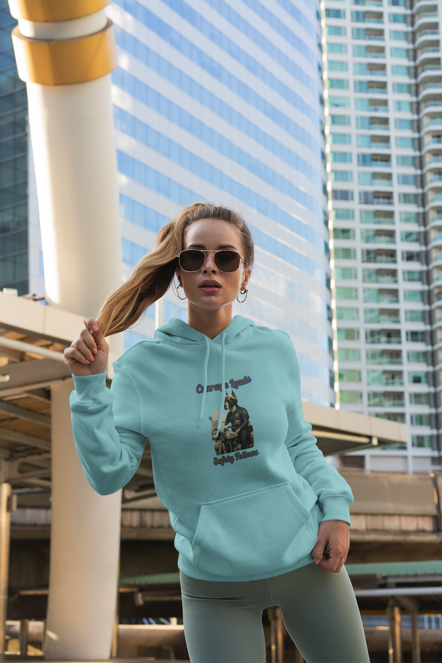 This striking illustration depicts an anthropomorphic dog as a highway patrol police officer, embodying the message "Courage Leads, Safety Follows." The image features a muscular canine figure dressed in a classic police uniform, complete with a badge, dark sunglasses, and a police cap. He stands alongside a vintage police motorcycle, with "Highway Patrol" prominently displayed on the windshield. The artwork is rendered in a detailed, realistic style against a black background, creating a dramatic and powerful visual impact. The color palette consists of muted blues, grays, and cream tones, giving the image a sophisticated and professional feel. The motorcycle appears to be a classic model, meticulously detailed with chrome elements and authentic police markings. The dog's posture suggests authority, discipline, and readiness, symbolizing the dedication of law enforcement officers. The text at the top and bottom of the image, "Courage Leads, Safety Follows," reinforces the theme of protection and public service. This unique artistic representation transforms a traditional law enforcement scene into a compelling narrative about courage, responsibility, and keeping communities safe. The image serves as a creative tribute to highway patrol officers and their critical role in maintaining road safety.Fantasy Dog Portraits