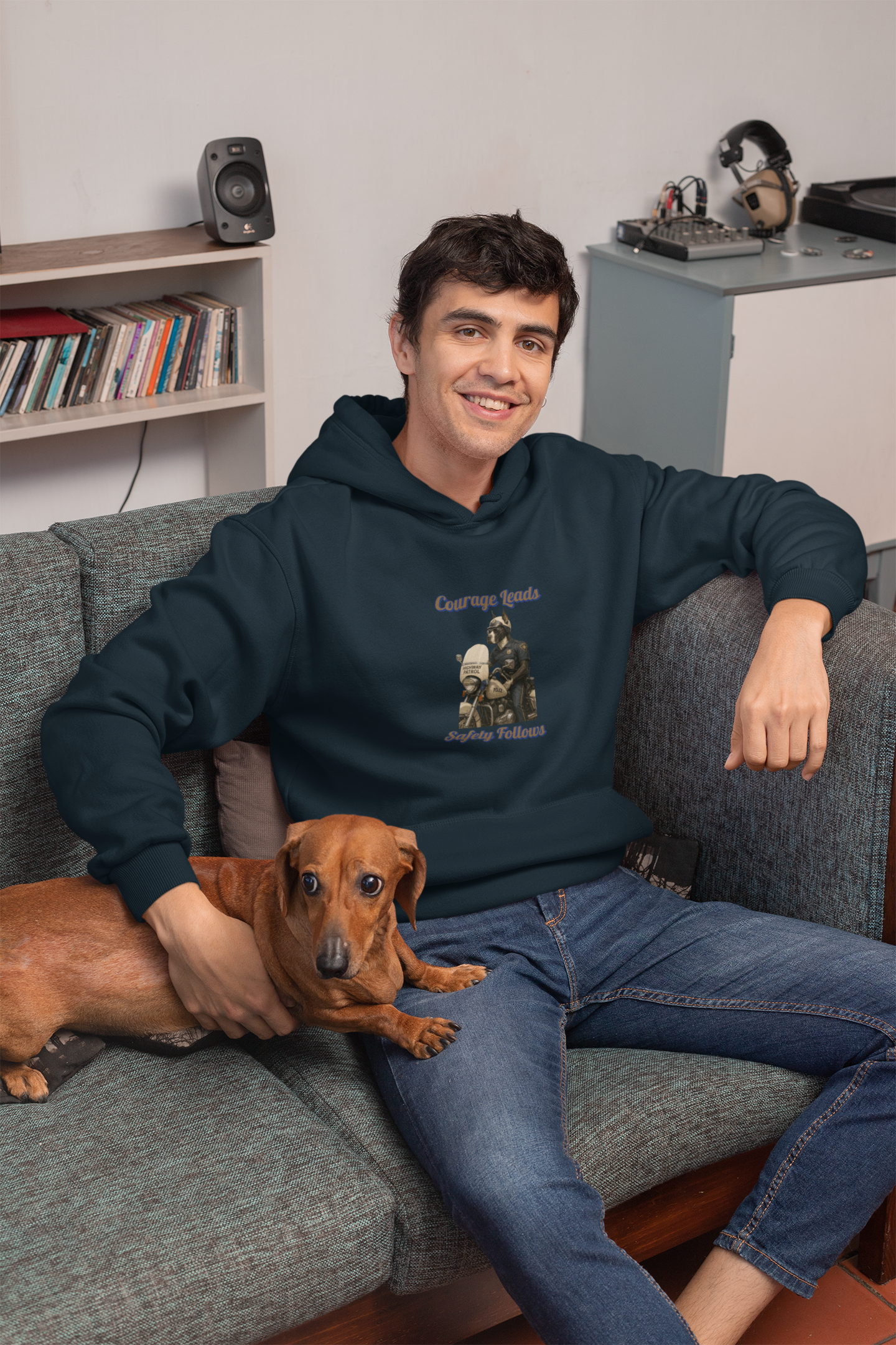 This striking illustration depicts an anthropomorphic dog as a highway patrol police officer, embodying the message "Courage Leads, Safety Follows." The image features a muscular canine figure dressed in a classic police uniform, complete with a badge, dark sunglasses, and a police cap. He stands alongside a vintage police motorcycle, with "Highway Patrol" prominently displayed on the windshield. The artwork is rendered in a detailed, realistic style against a black background, creating a dramatic and powerful visual impact. The color palette consists of muted blues, grays, and cream tones, giving the image a sophisticated and professional feel. The motorcycle appears to be a classic model, meticulously detailed with chrome elements and authentic police markings. The dog's posture suggests authority, discipline, and readiness, symbolizing the dedication of law enforcement officers. The text at the top and bottom of the image, "Courage Leads, Safety Follows," reinforces the theme of protection and public service. This unique artistic representation transforms a traditional law enforcement scene into a compelling narrative about courage, responsibility, and keeping communities safe. The image serves as a creative tribute to highway patrol officers and their critical role in maintaining road safety.Fantasy Dog Portraits